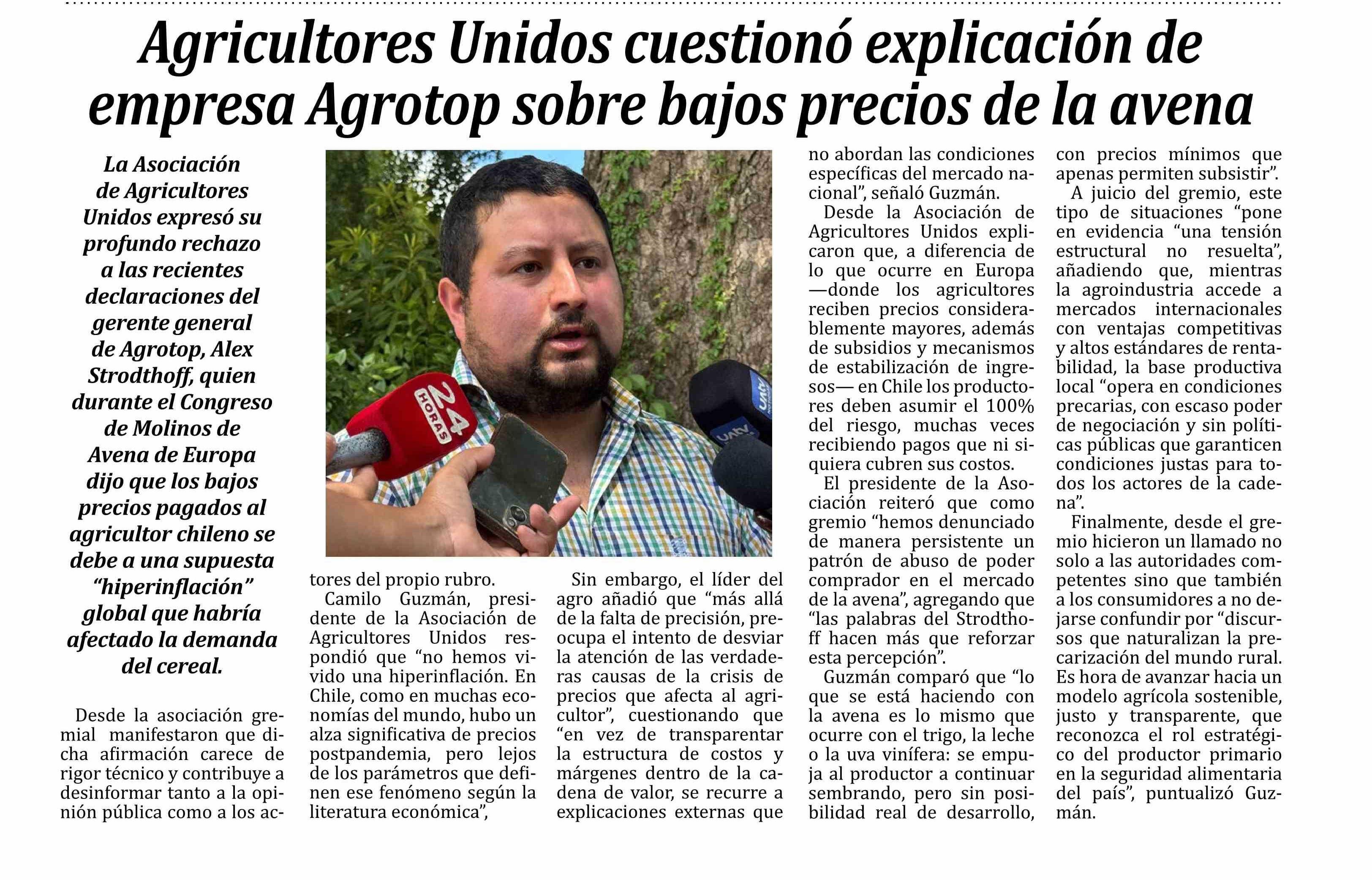 Agricultores Unidos cuestionó explicación de empresa Agrotop sobre bajos precios de la avena 21-05-2025 Las Noticias |