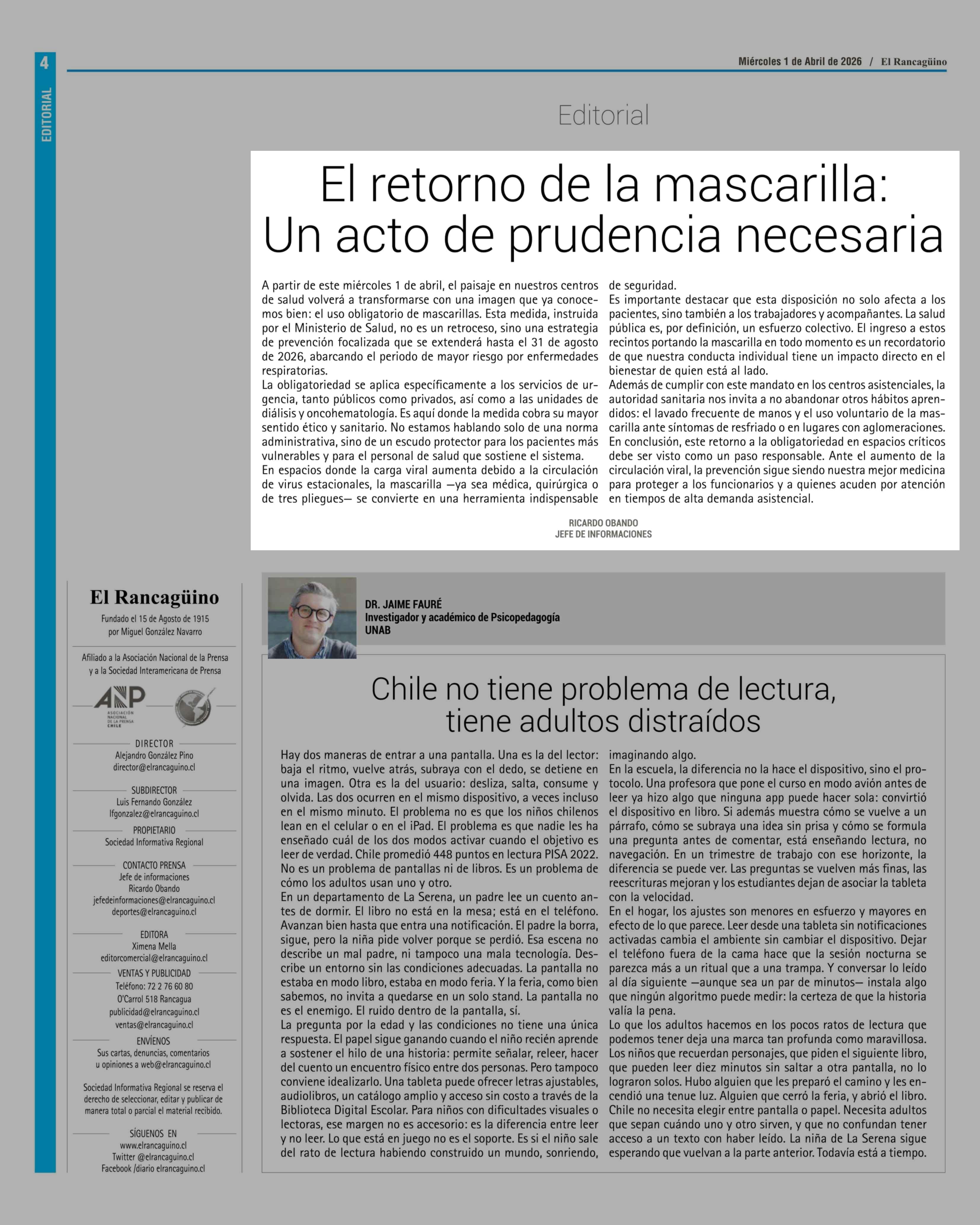 Editorial: El retorno de la mascarilla: Un acto de prudencia necesaria 01-04-2026 El Rancagüino |