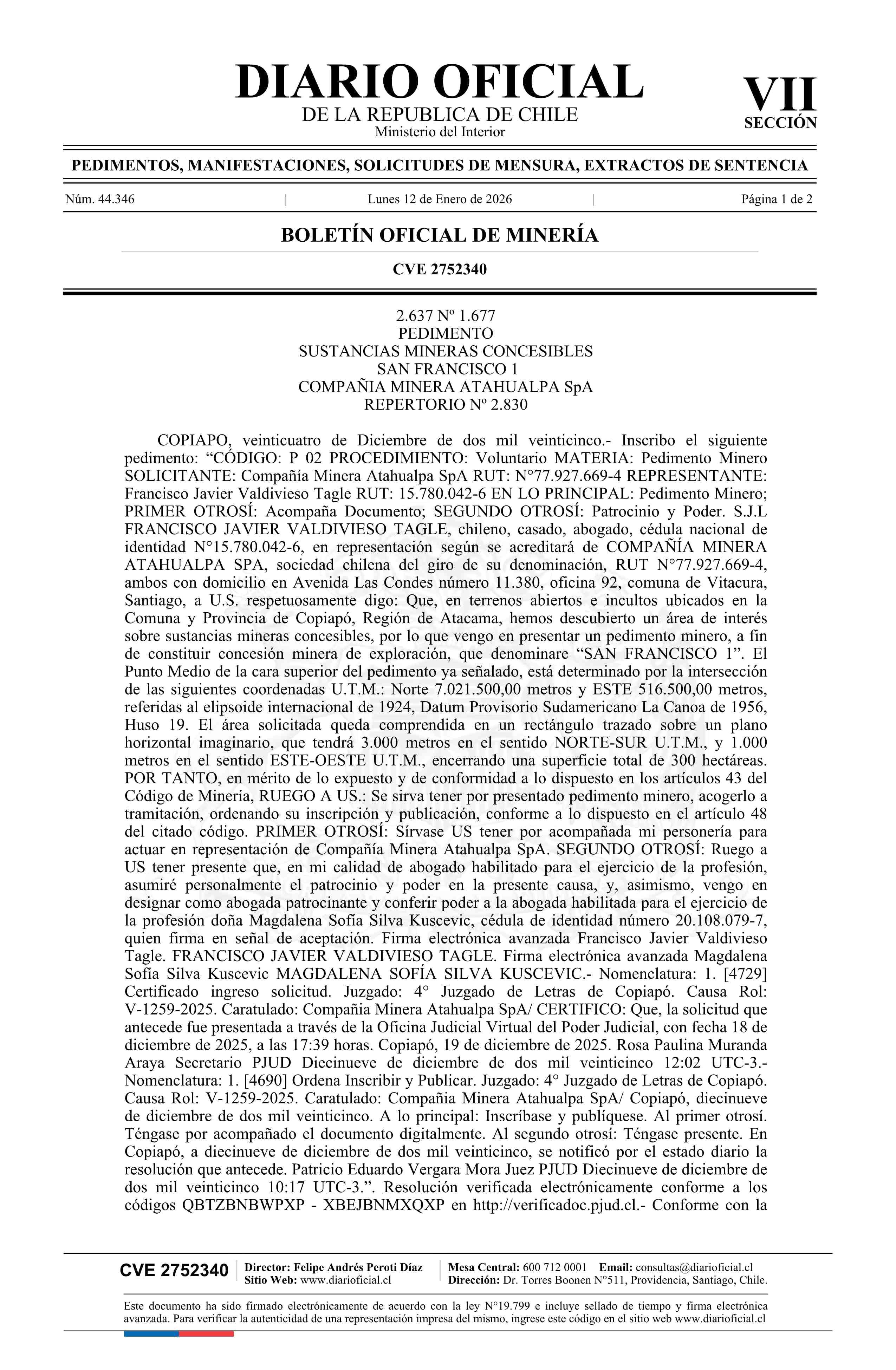 SAN FRANCISCO 1 / Compañía Minera Atahualpa SpA 12-01-2026 DIARIO OFICIAL CHILE - BOLETÍN OFICIAL DE MINERÍA |