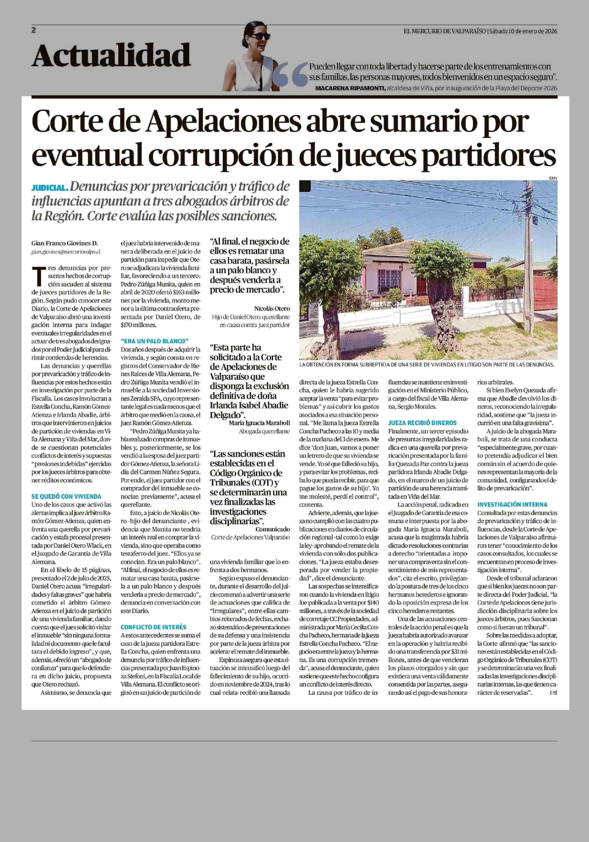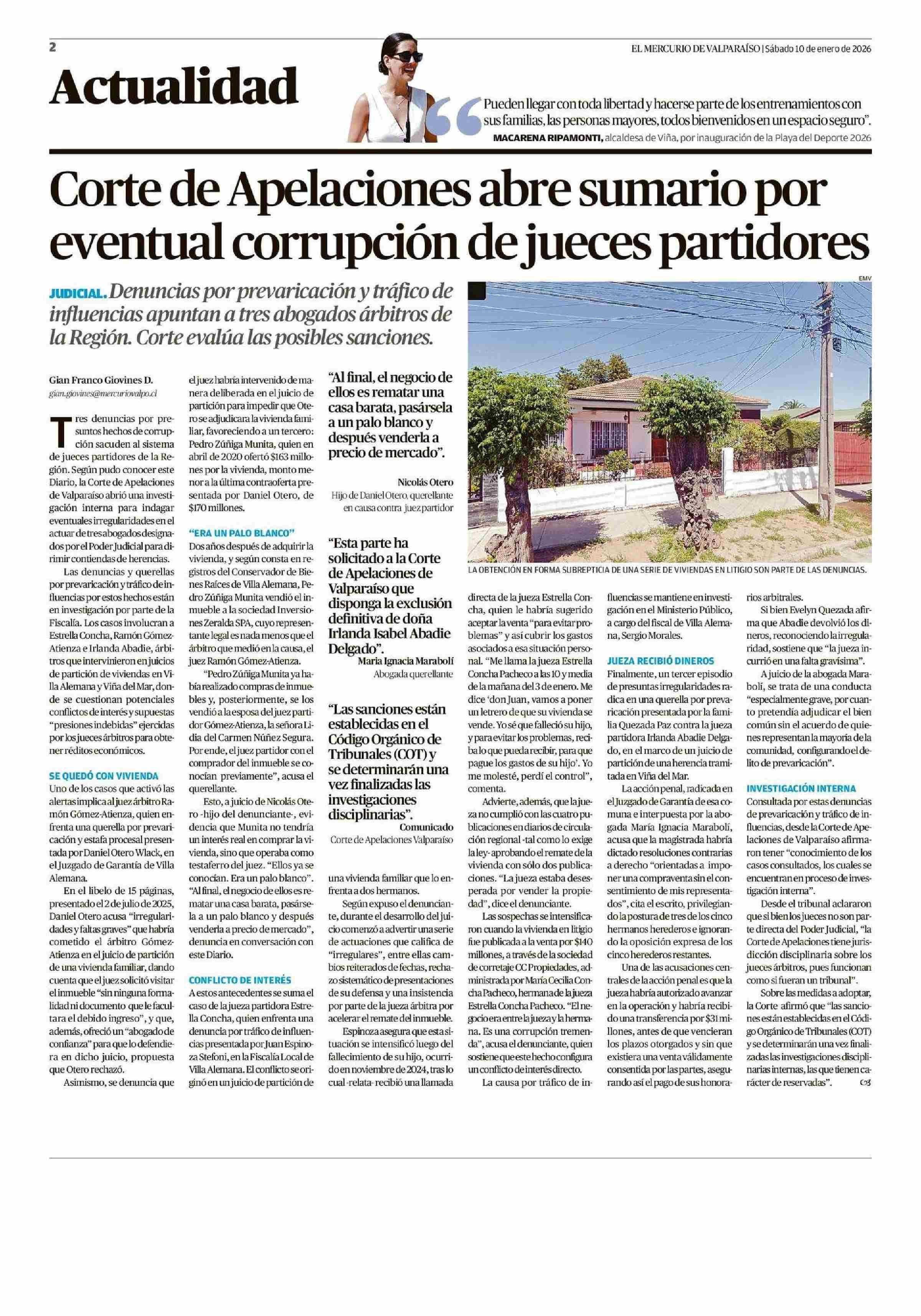 Corte de Apelaciones abre sumario por eventual corrupción de jueces partidores 10-01-2026 El Mercurio de Valparaíso |