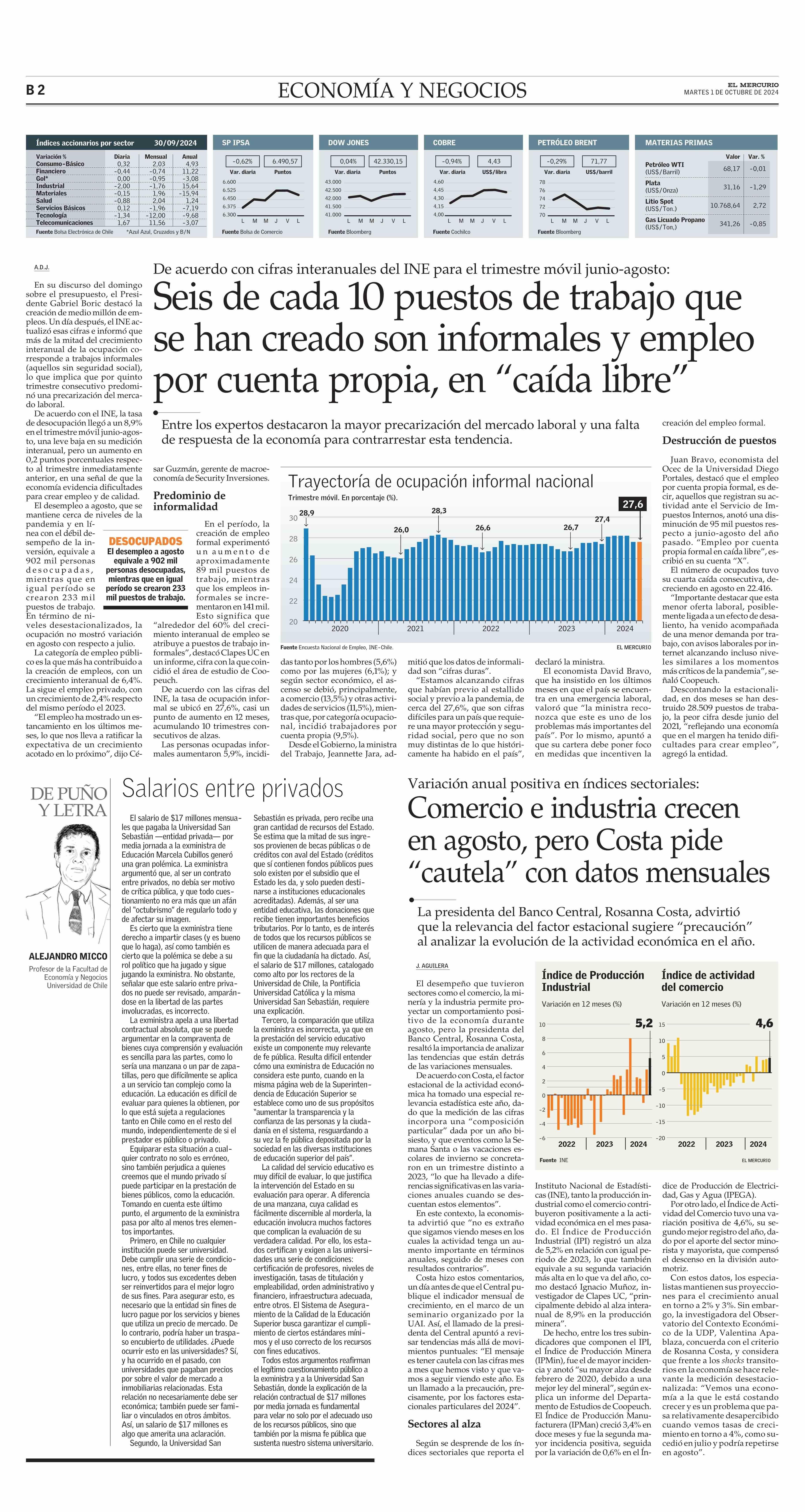 Seis de cada 10 puestos de trabajo que se han creado son informales y empleo por cuenta propia, en “caída libre” 01-10-2024 El Mercurio |