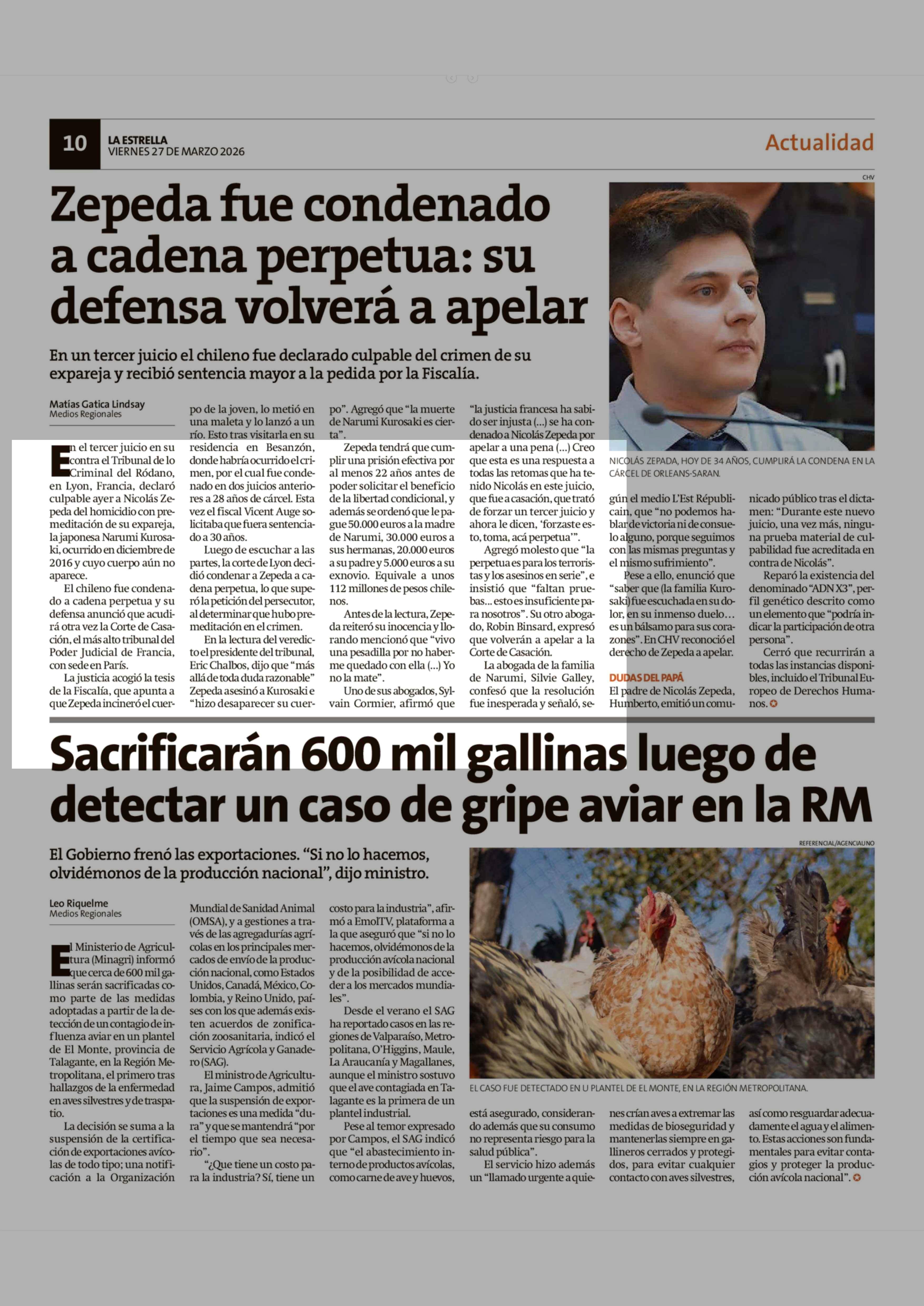 Sacrificarán 600 mii gallinas luego de detectar un caso de gripe aviar en la RM 27-03-2026 La Estrella de Chiloé |