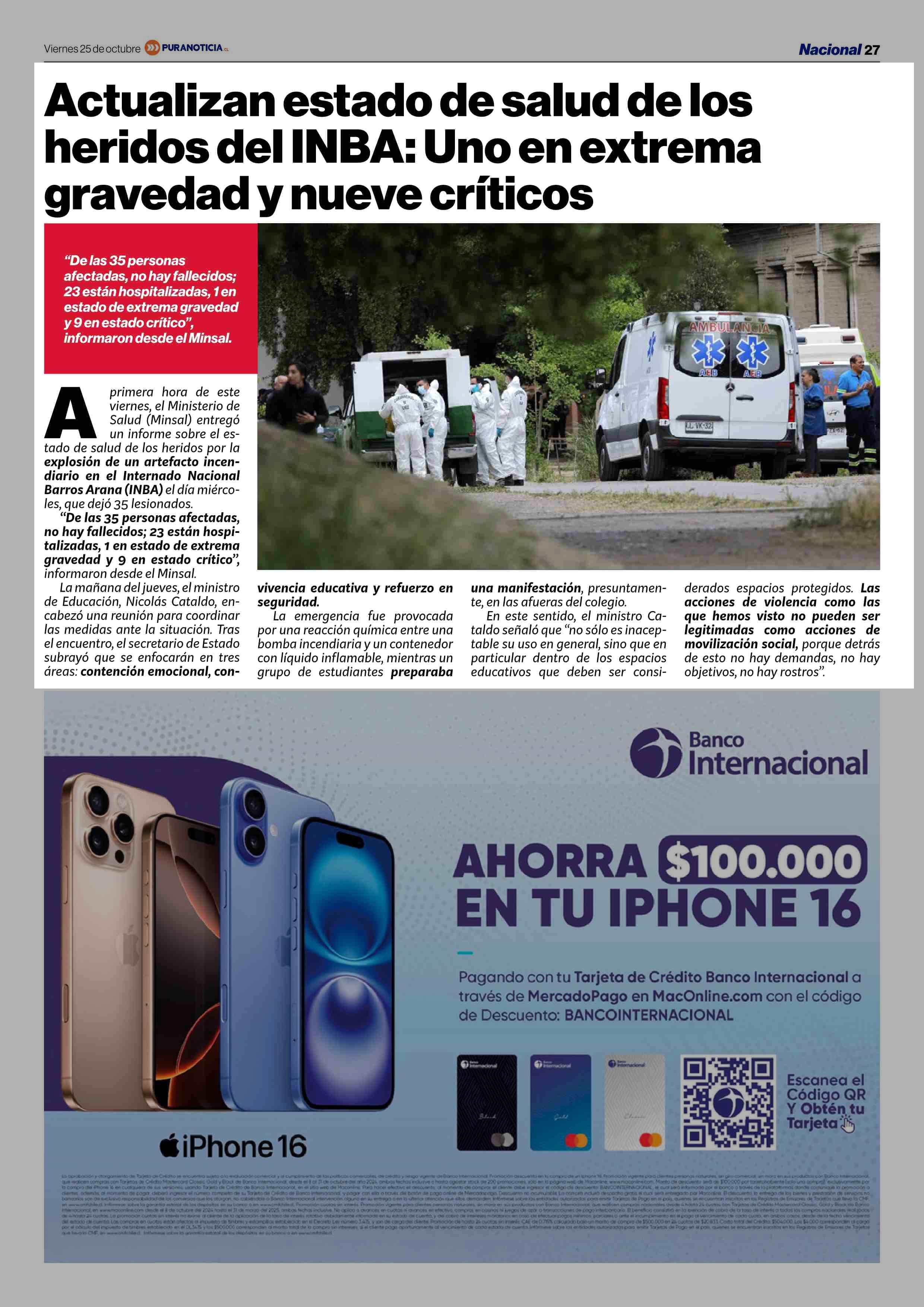 | Título: | Actualizan estado de salud de los heridos del INBA: Uno en extrema gravedad y nueve críticos |