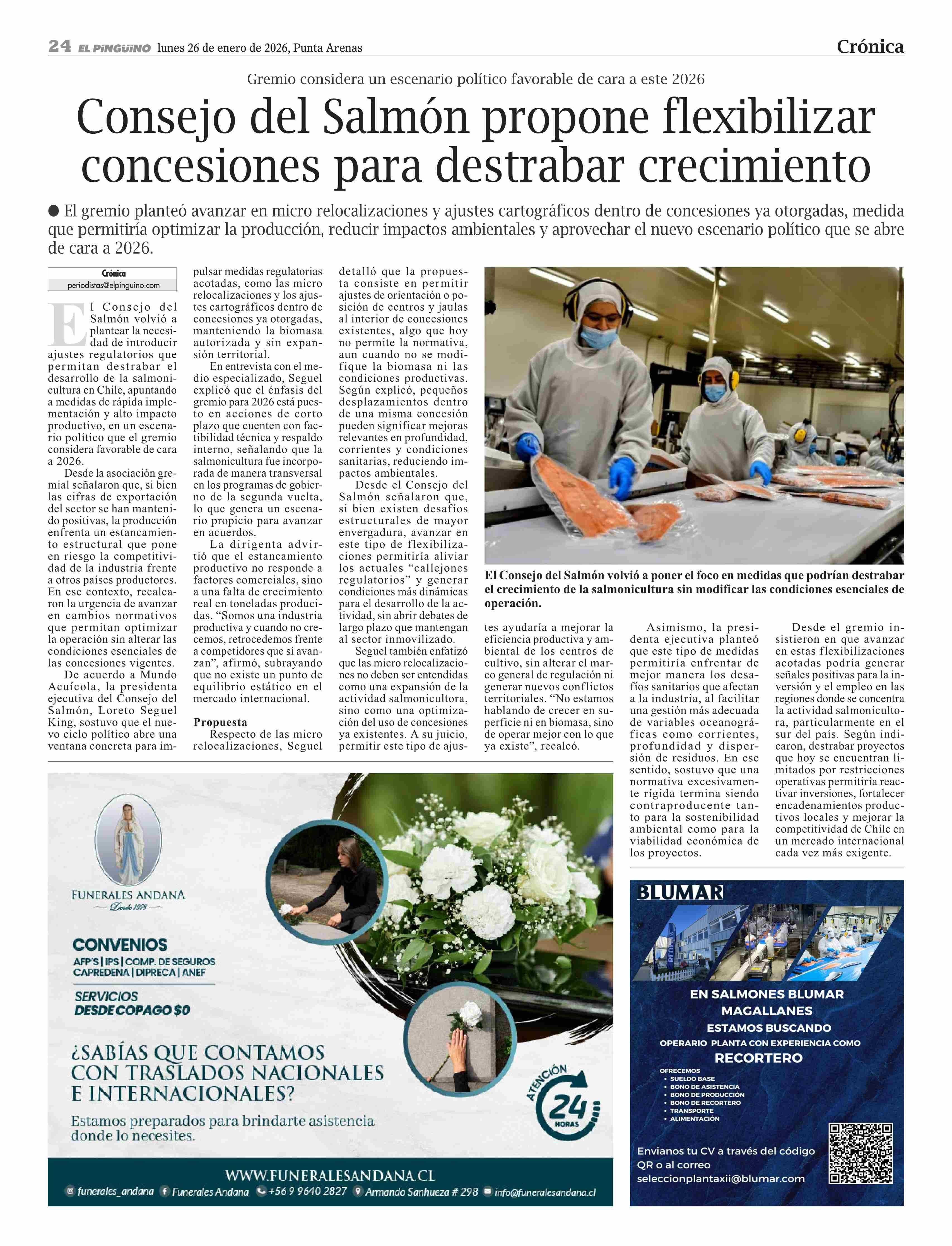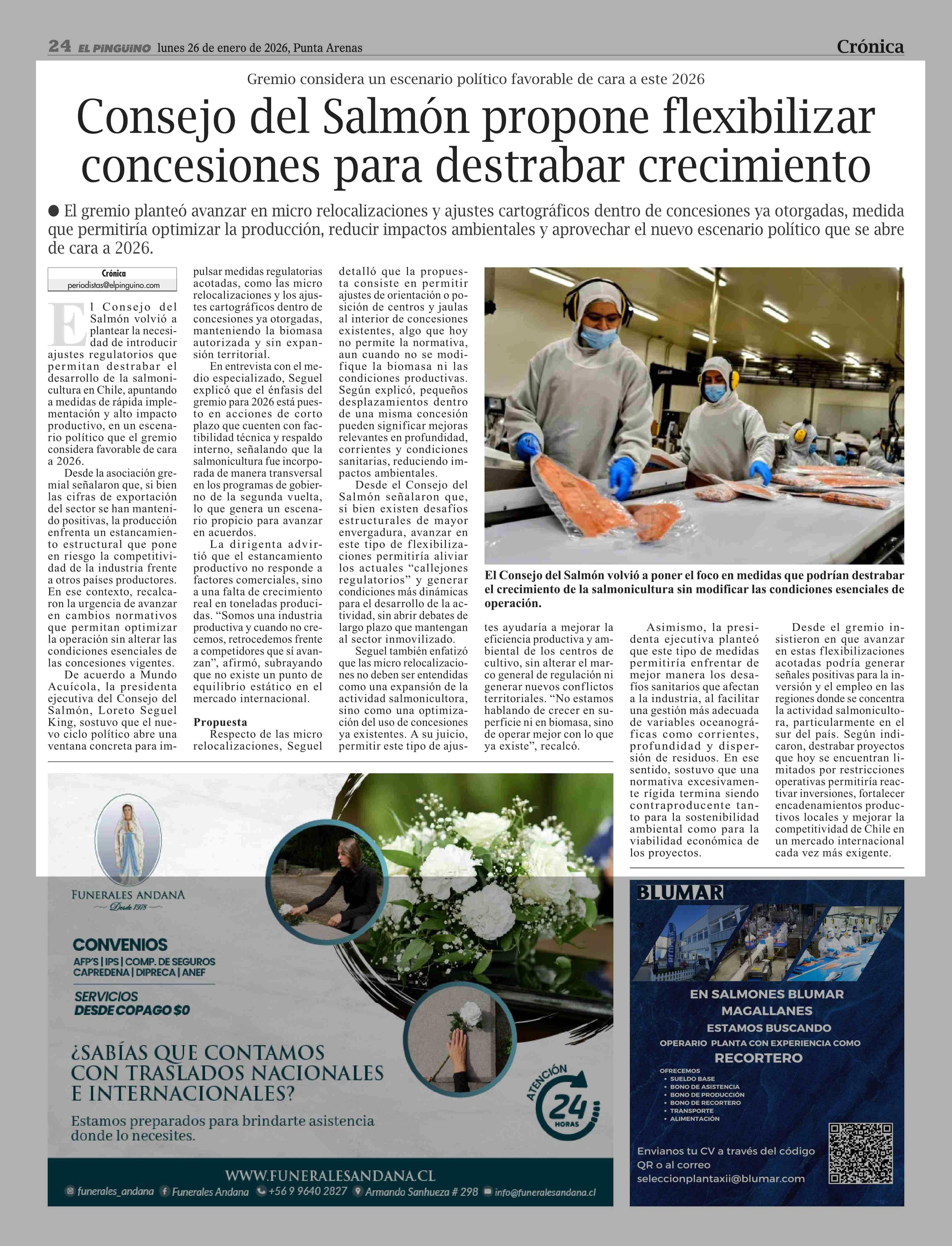 Consejo del Salmón propone flexibilizar concesiones para destrabar crecimiento 26-01-2026 El Pingüino |