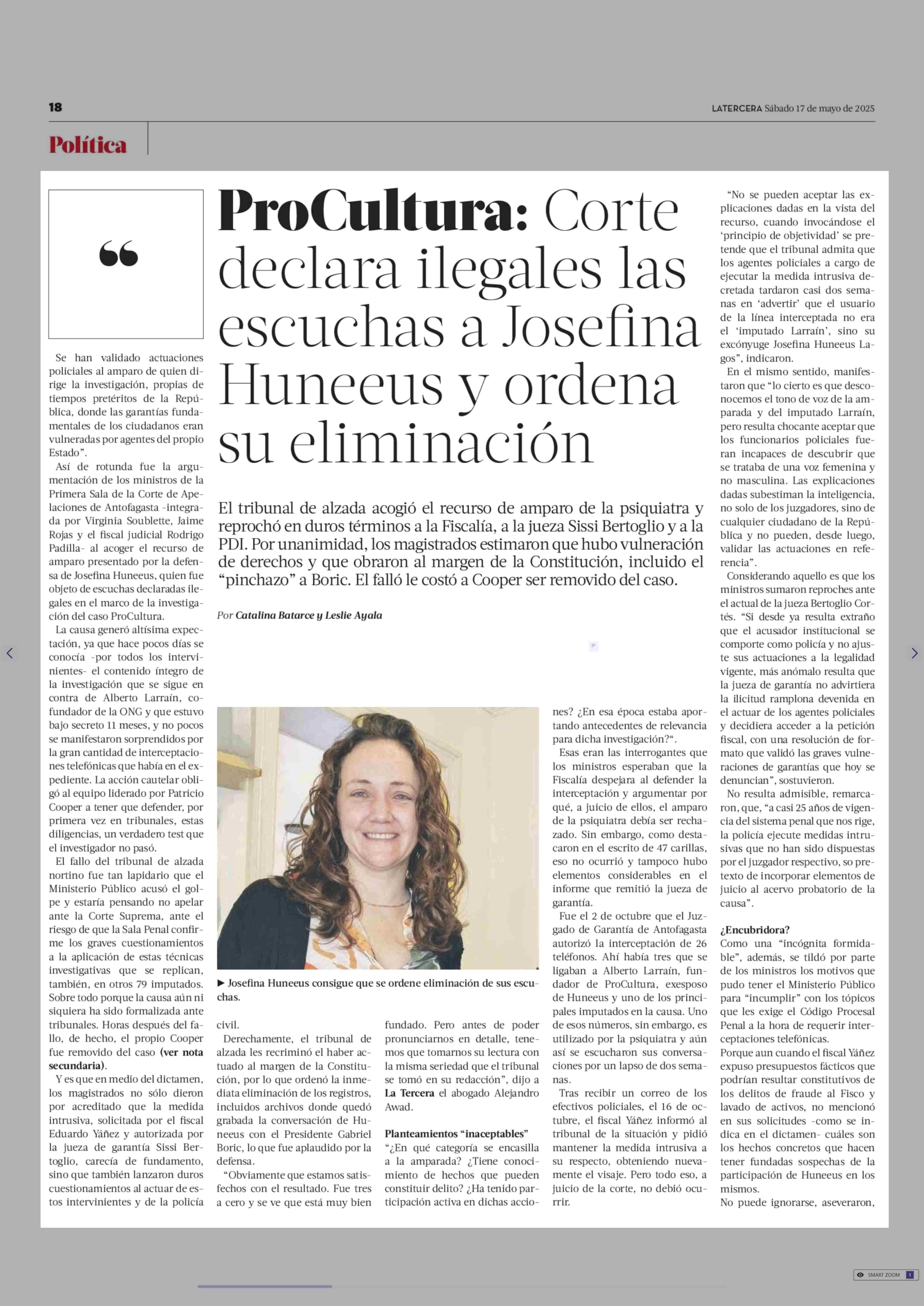 ProCultura: Corte declara ilegales las escuchas a Josefina Huneeus y ordena su eliminación 17-05-2025 La Tercera |