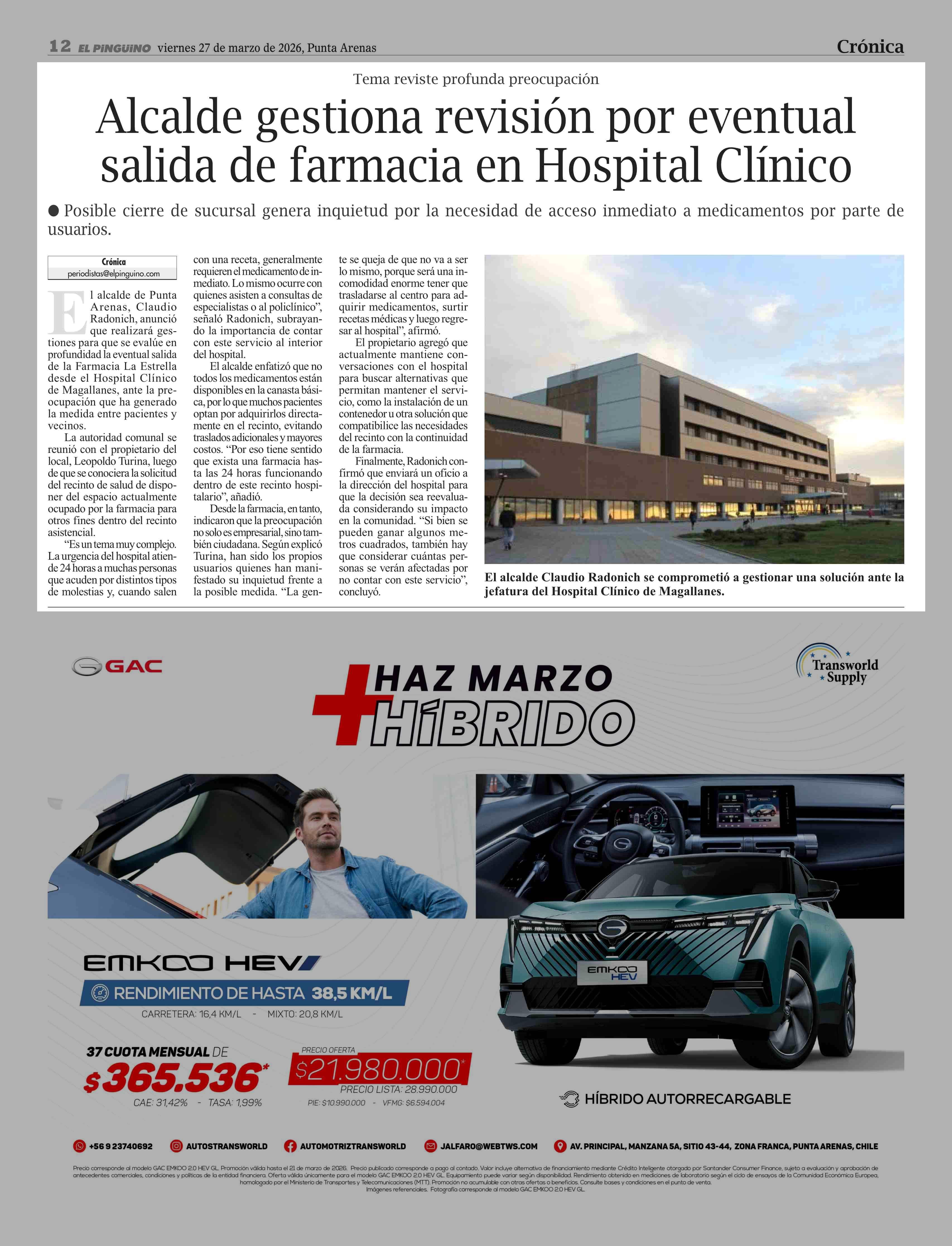 Alcalde gestiona revisión por eventual salida de farmacia en Hospital Clínico 27-03-2026 El Pingüino |