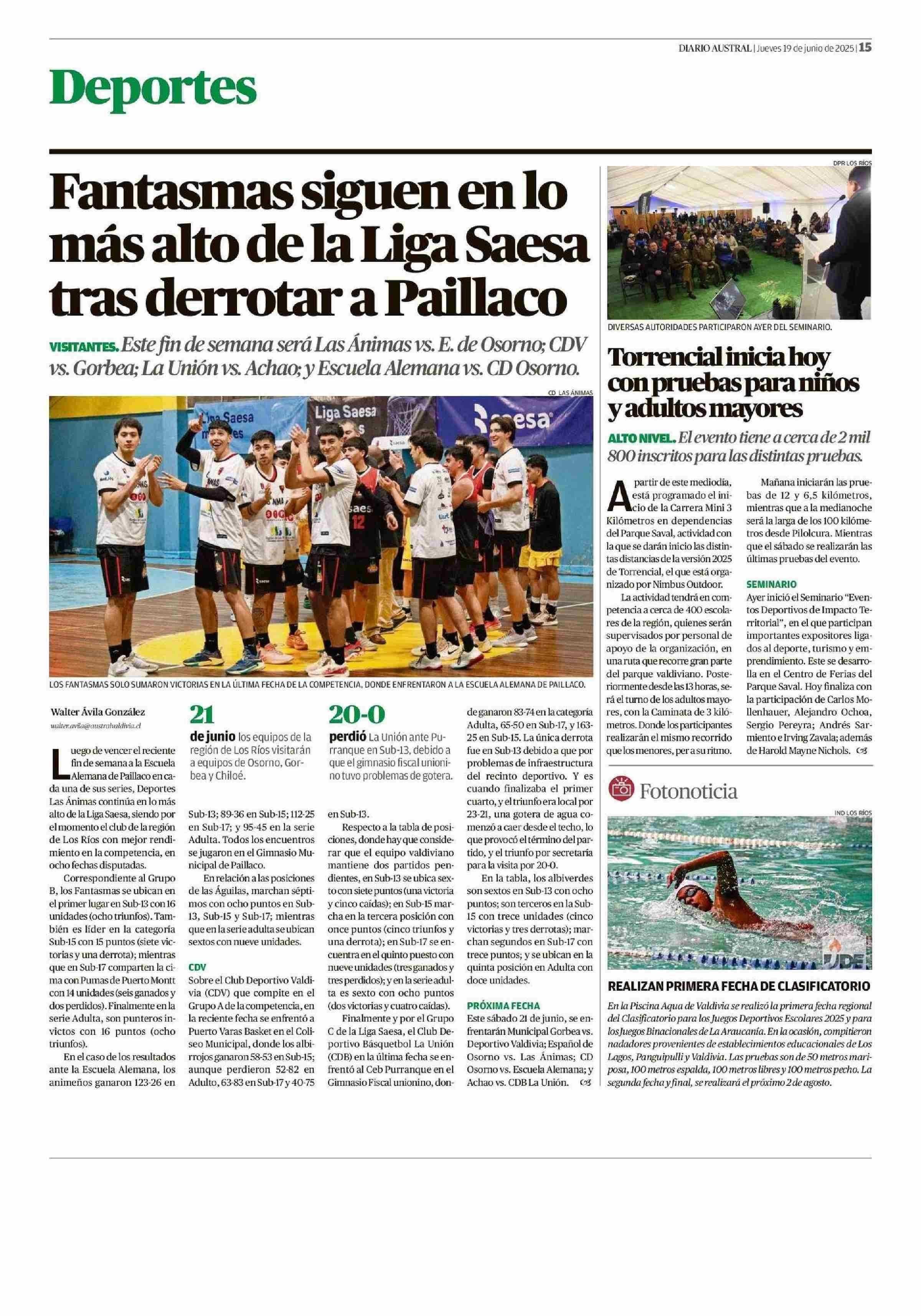 Fantasmas siguen en lo más alto de la Liga Saesa tras derrotar a Paillaco 19-06-2025 Diario Austral Región de Los Ríos |