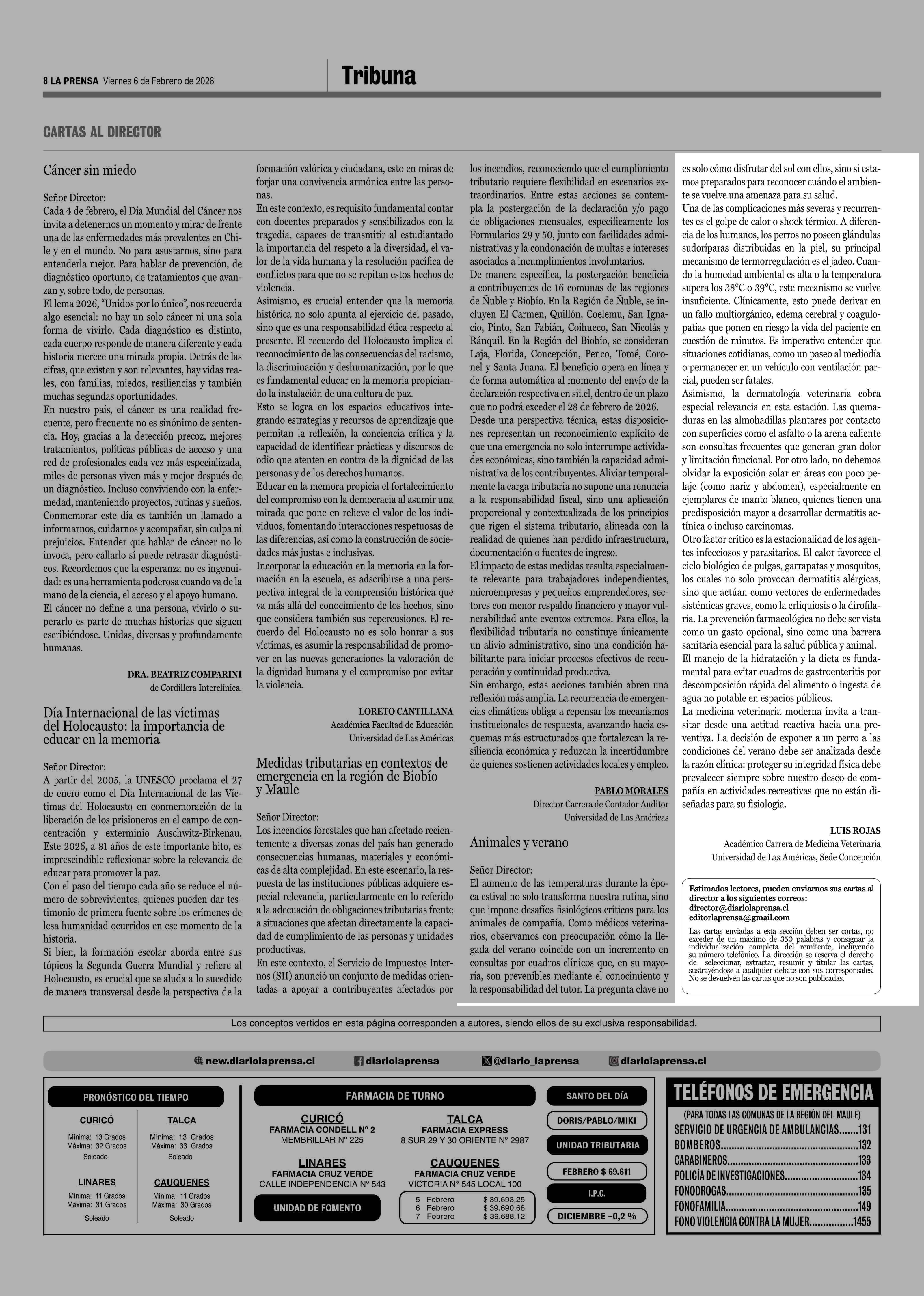 CARTAS: Animales y verano 06-02-2026 La Prensa de Curicó |