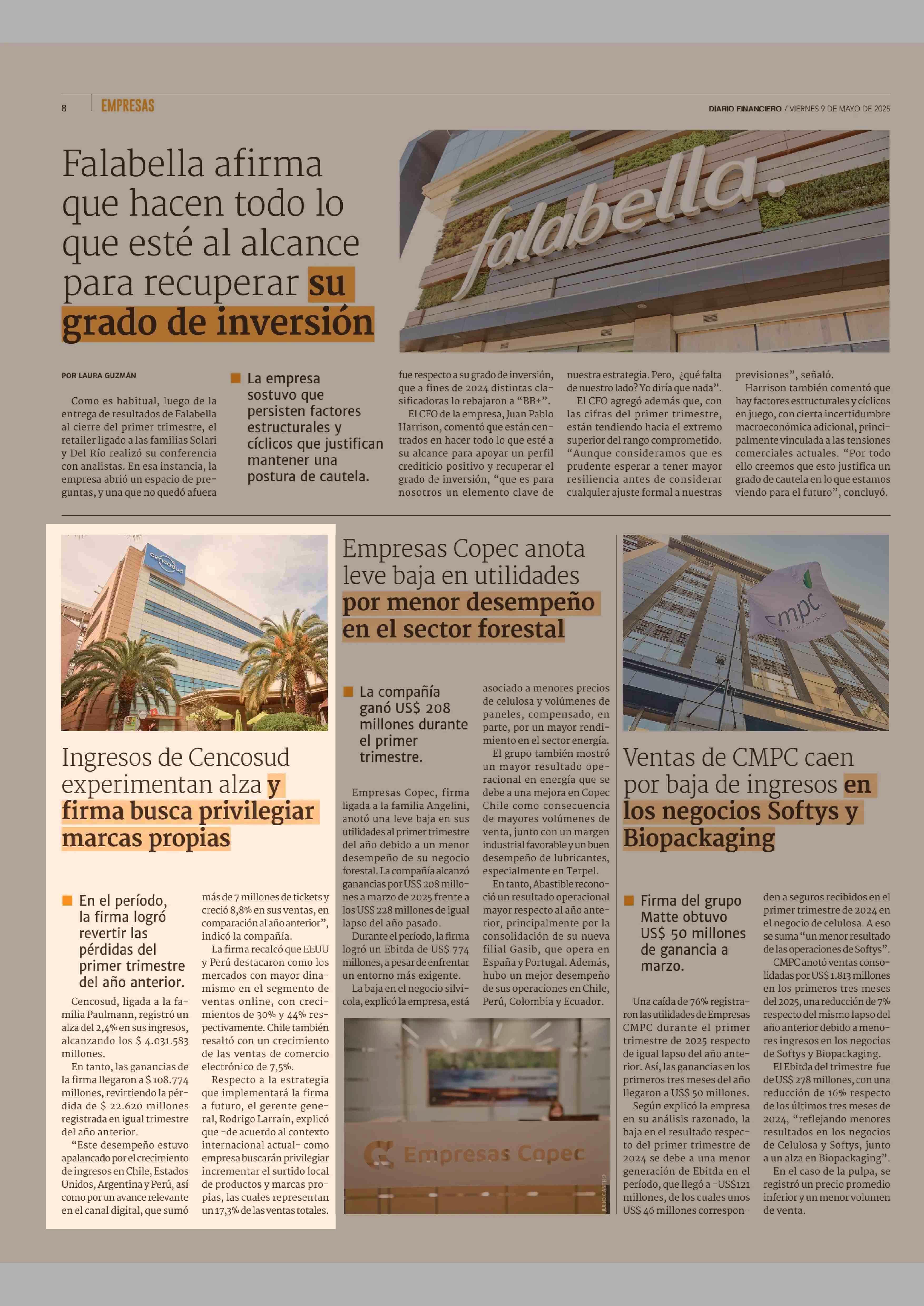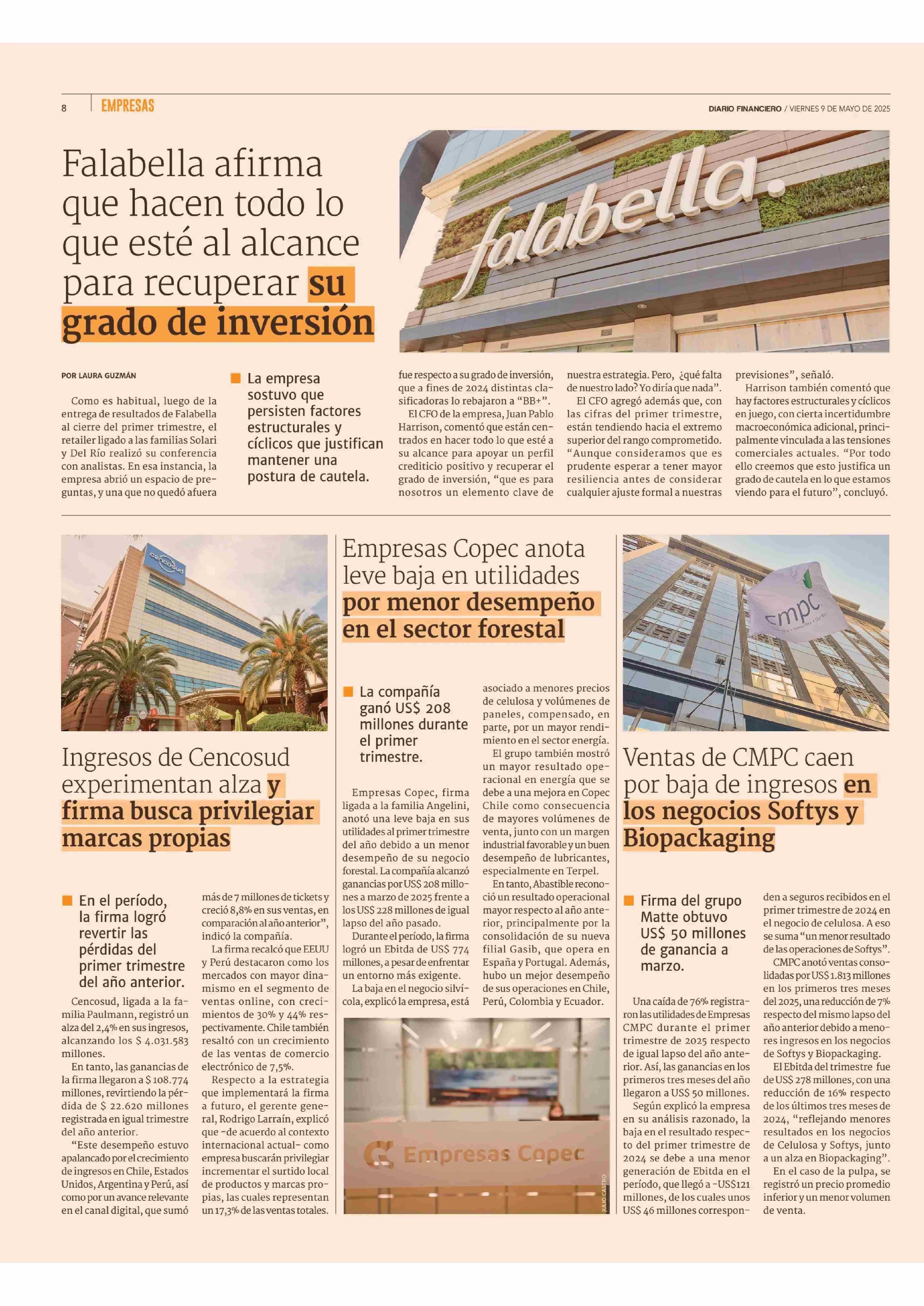 Ingresos de Cencosud experimentan alza y firma busca privilegiar marcas propias 09-05-2025 Diario Financiero |
