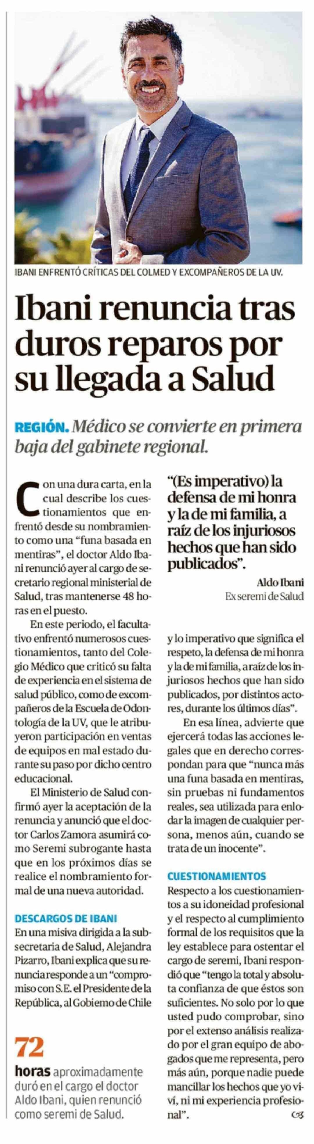 Título: Ibani renuncia tras duros reparos por su llegada a Salud
