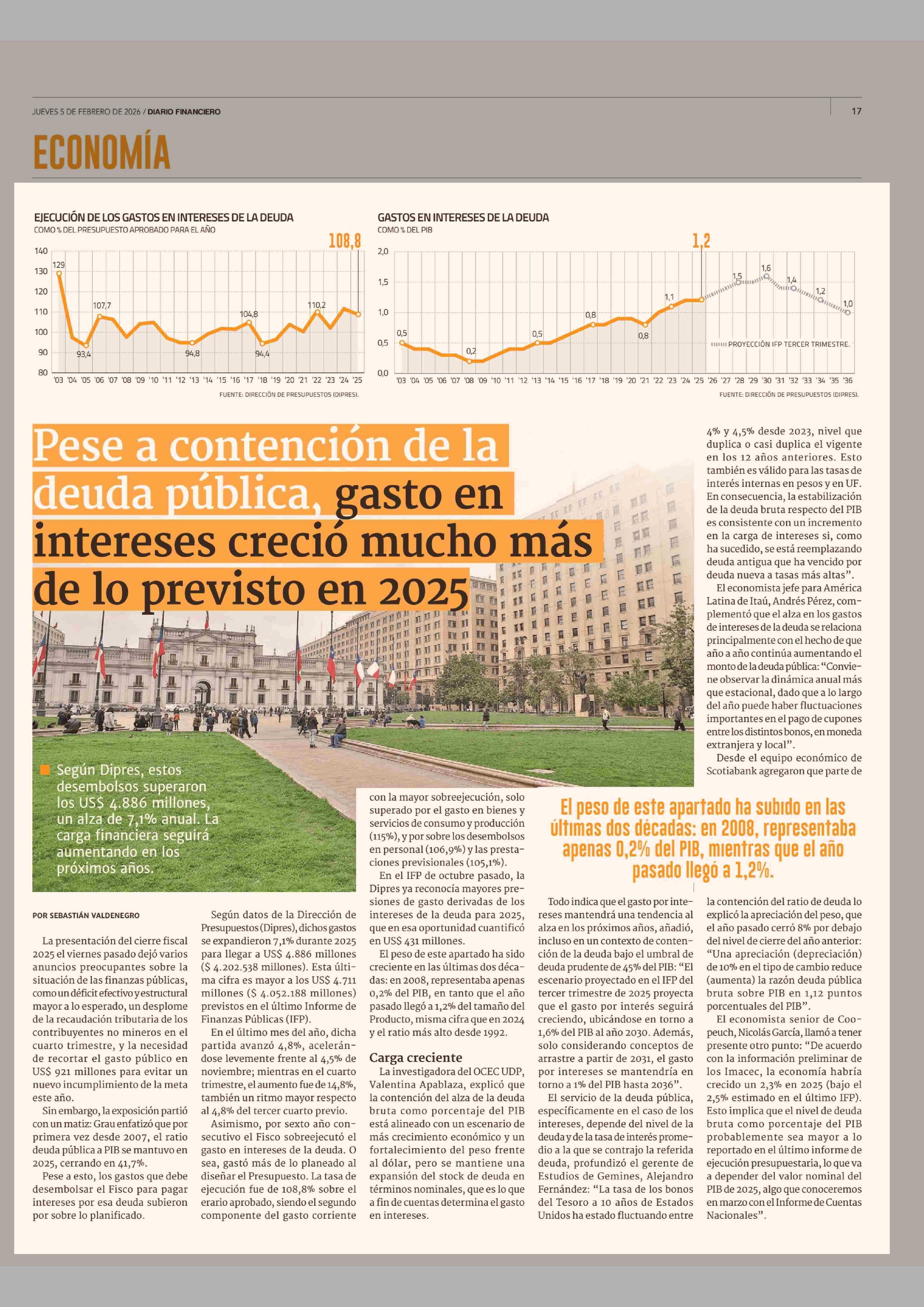 Pese a contención de la deuda pública , gasto en intereses crecio mucho más de lo previsto en 2025 05-02-2026 Diario Financiero |