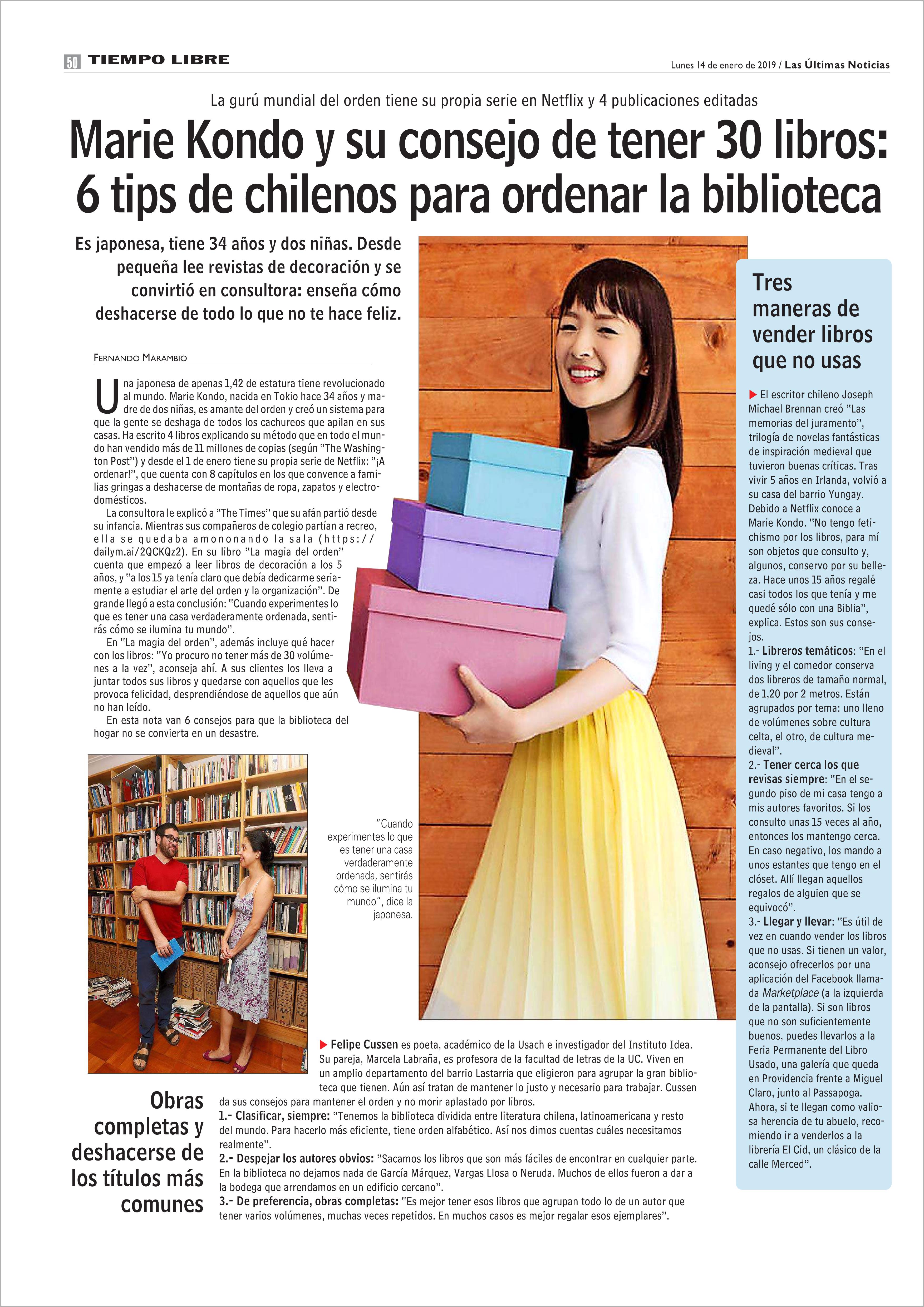 Marie Kondo y su consejo de tener 30 libros: 6 tips de chilenos para ordenar la biblioteca 14-01-2019 Las Últimas Noticias |