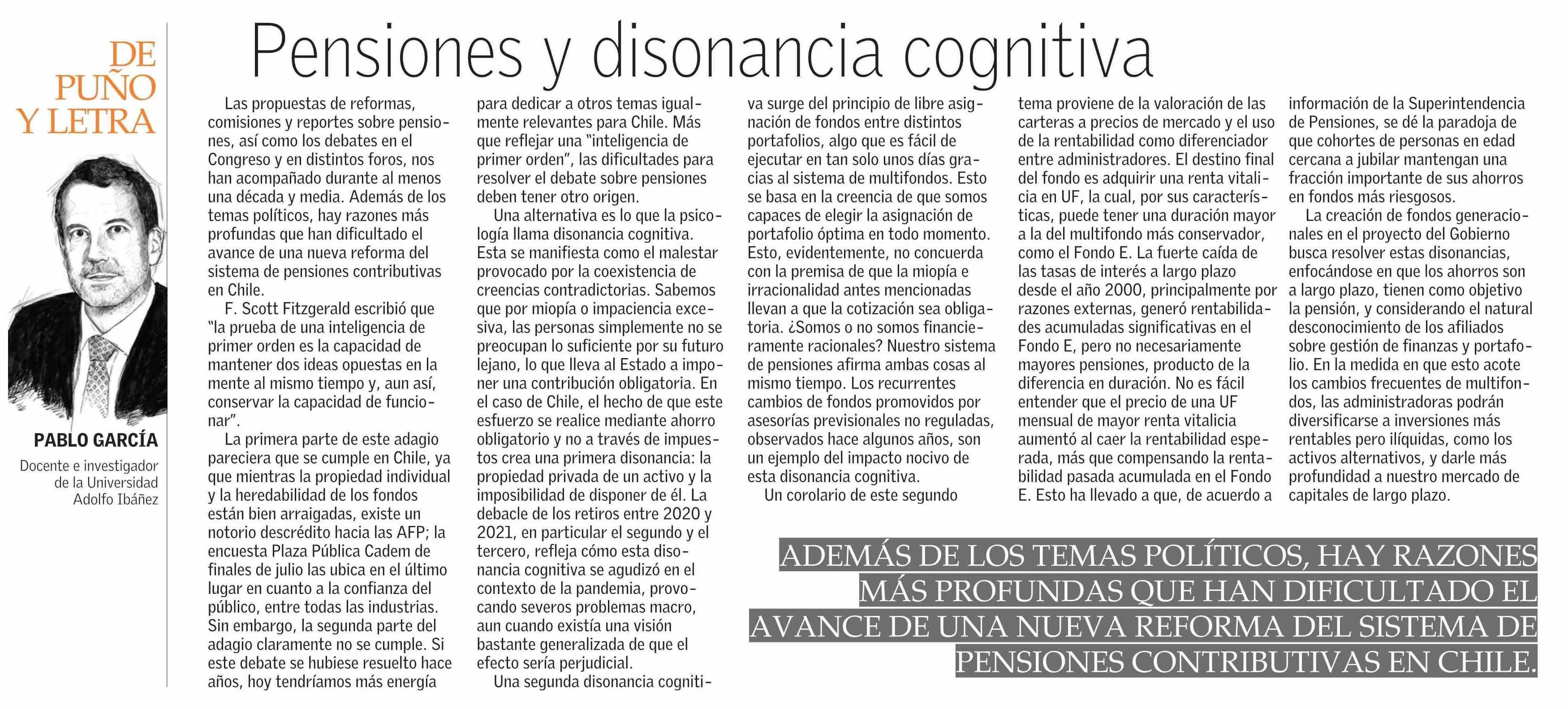 Columnas de Opinión: Pensiones y disonancia cognitiva 07-09-2024 El Mercurio |
