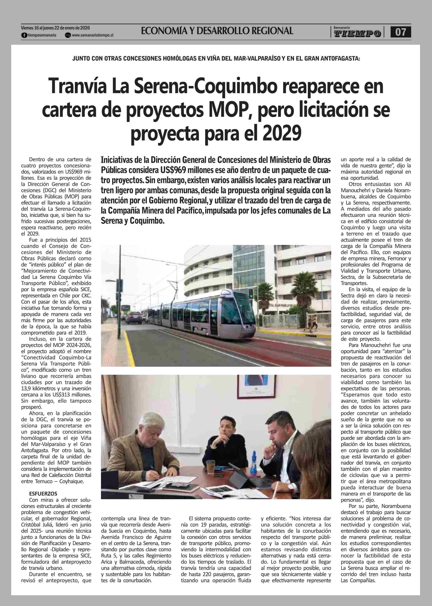 Título: Tranvía La Serena-Coquimbo reaparece en cartera de proyectos MOP, pero licitación se proyecta para el 2029