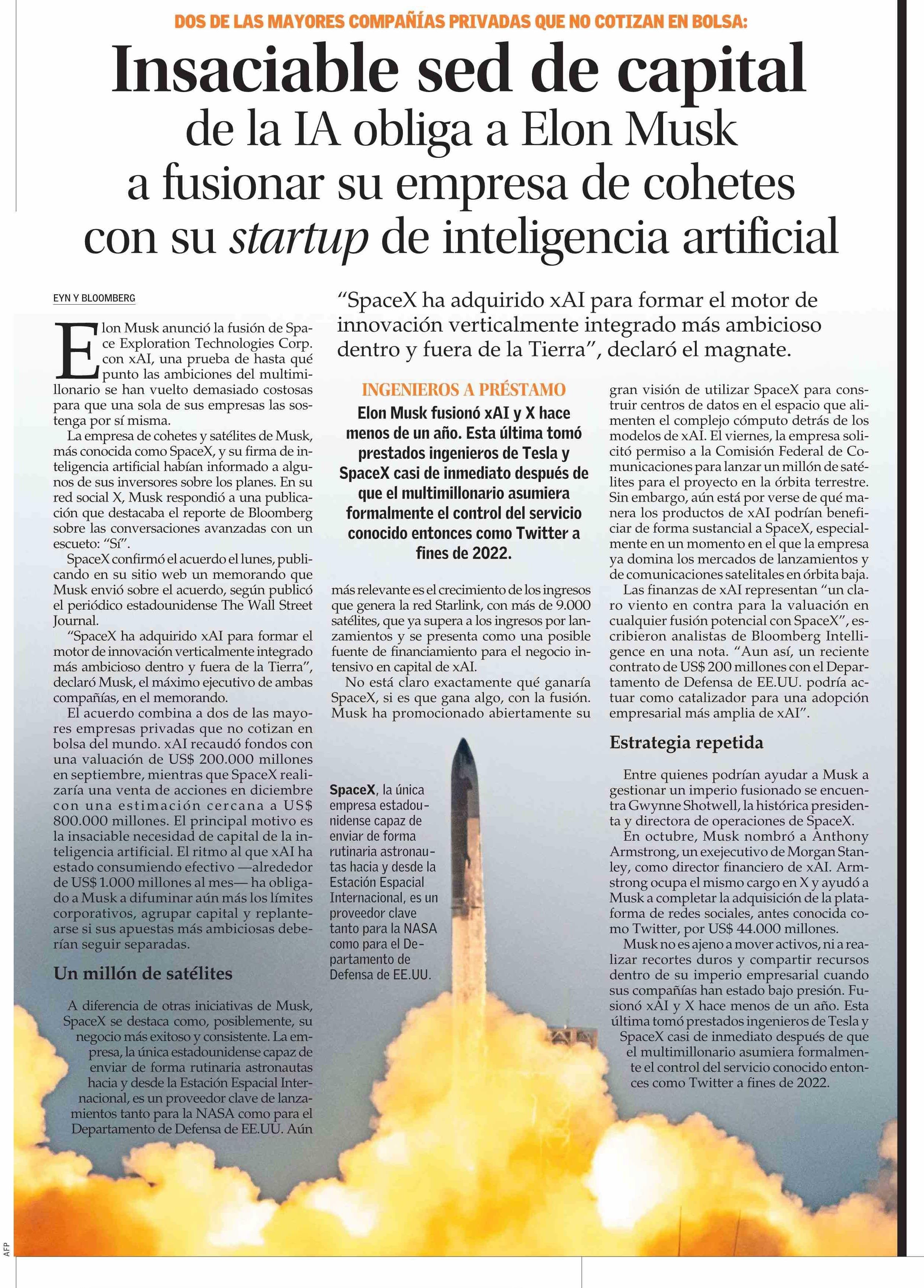 Insaciable sed de capital de la IA obliga a Elon Musk a fusionar su empresa de cohetes con su startup de inteligencia artificial 03-02-2026 El Mercurio |