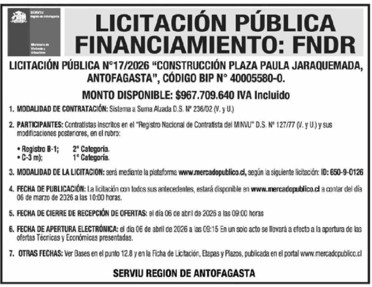 Fecha: 06-03-2026 Sector: Aviso Licitaciones Región: Región de Antofagasta