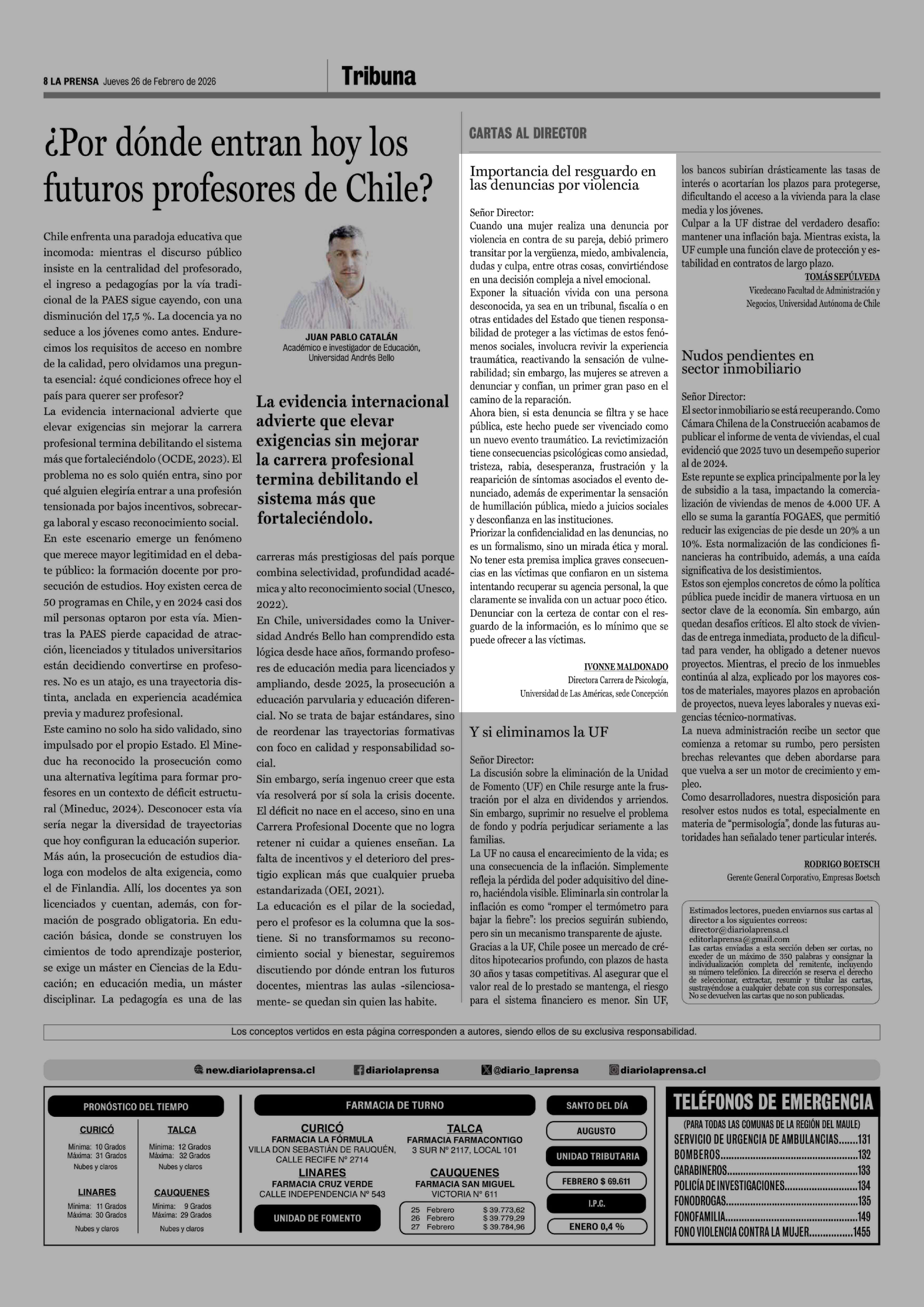 Cartas: Importancia del resguardo en las denuncias por violencia 26-02-2026 La Prensa de Curicó |