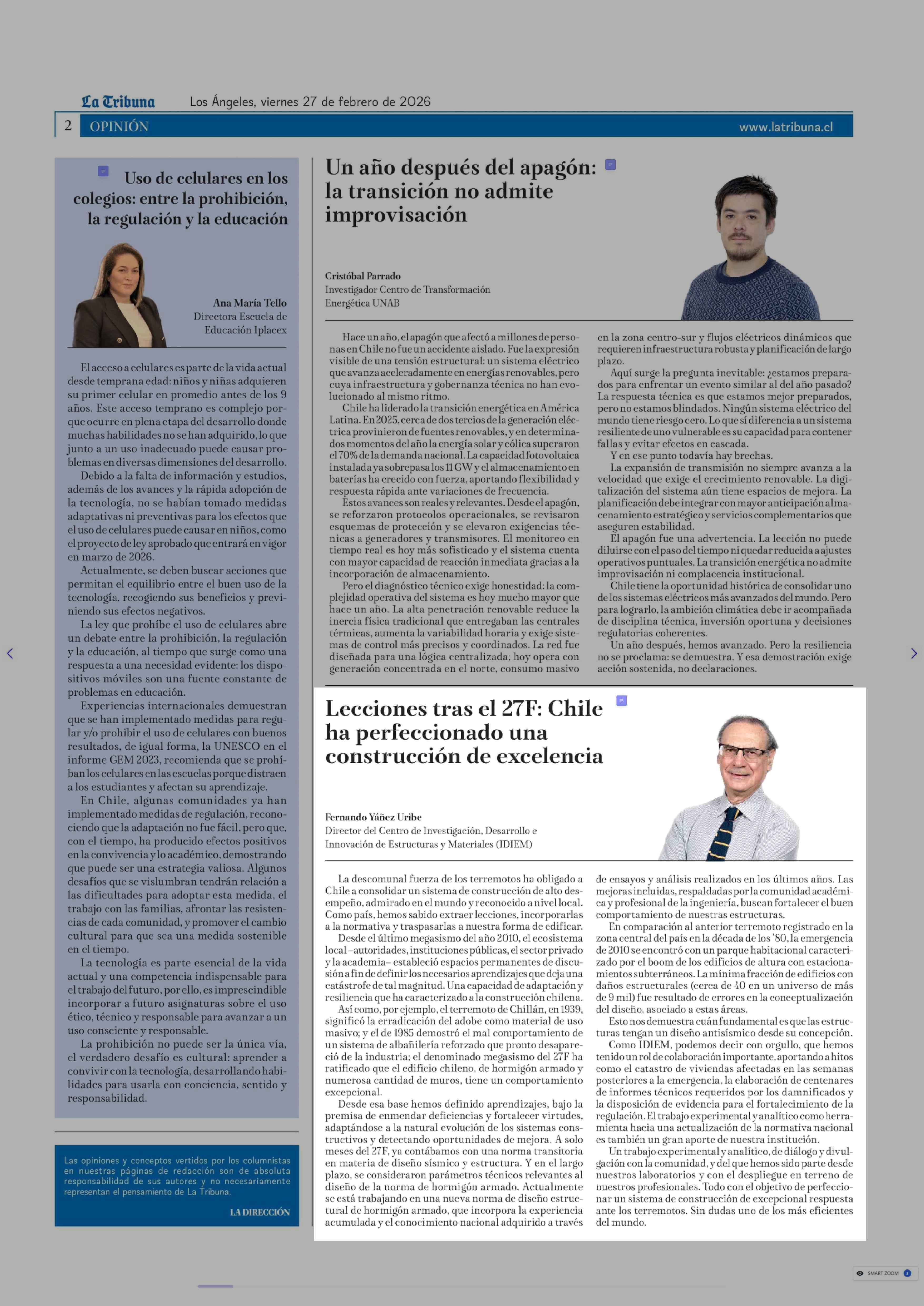 Columnas de Opinión: Lecciones tras el 27F: Chile ha perfeccionado una construcción de excelencia 27-02-2026 La Tribuna |