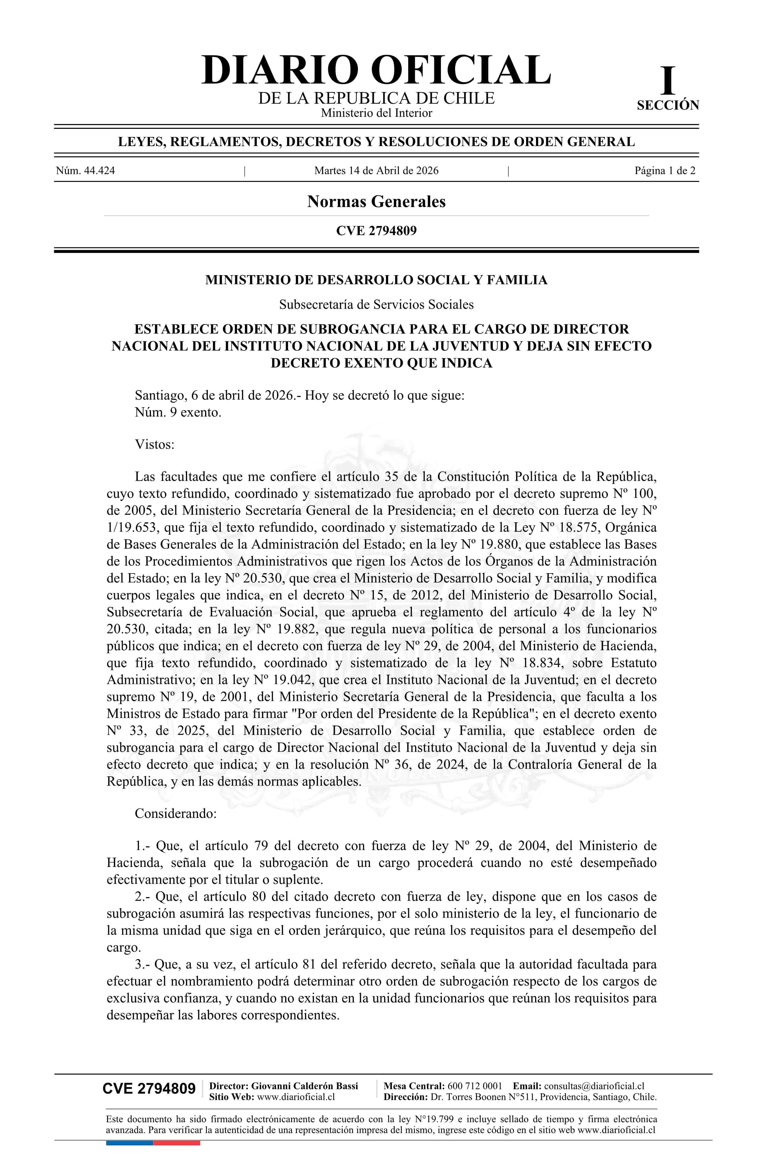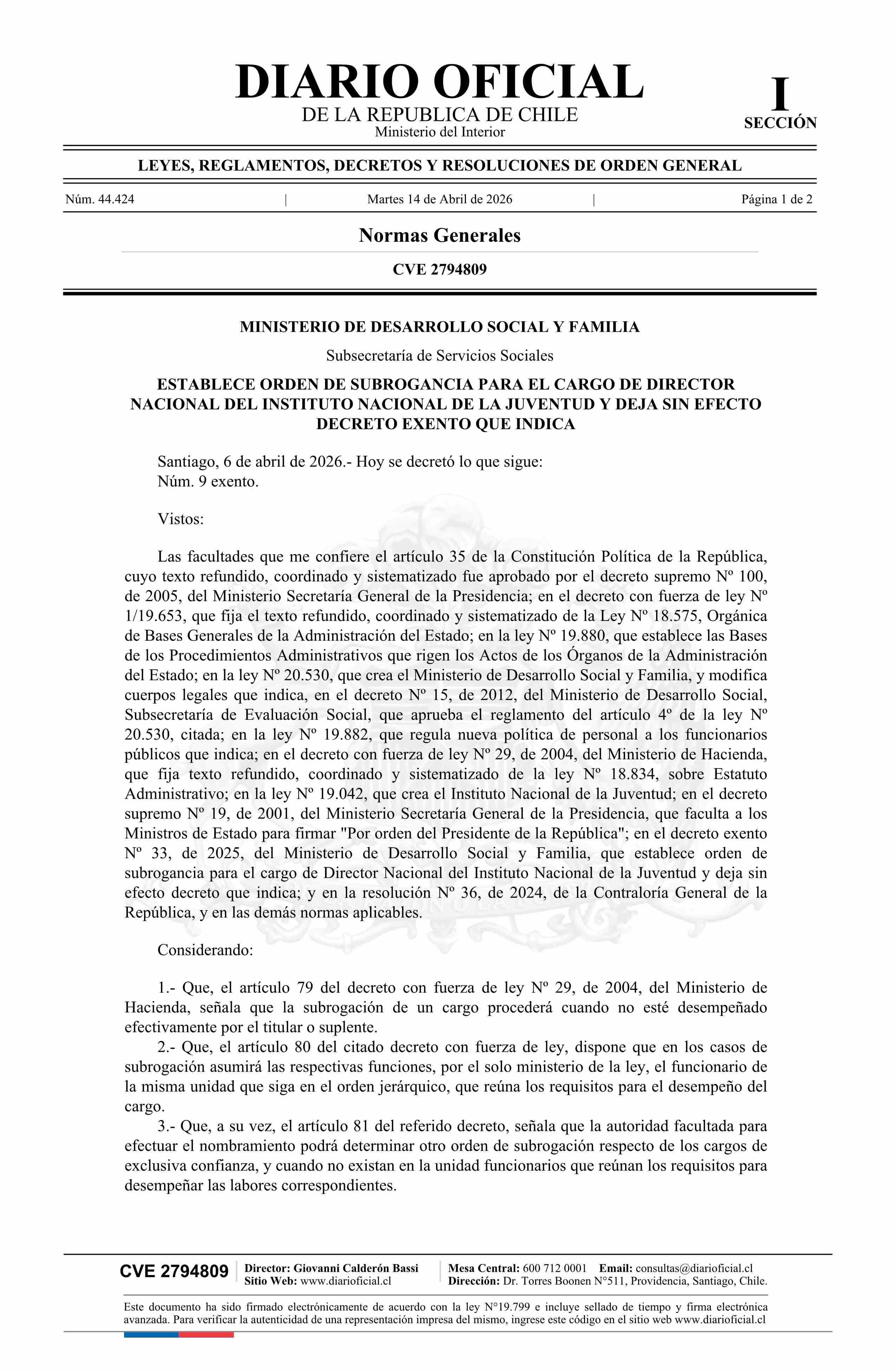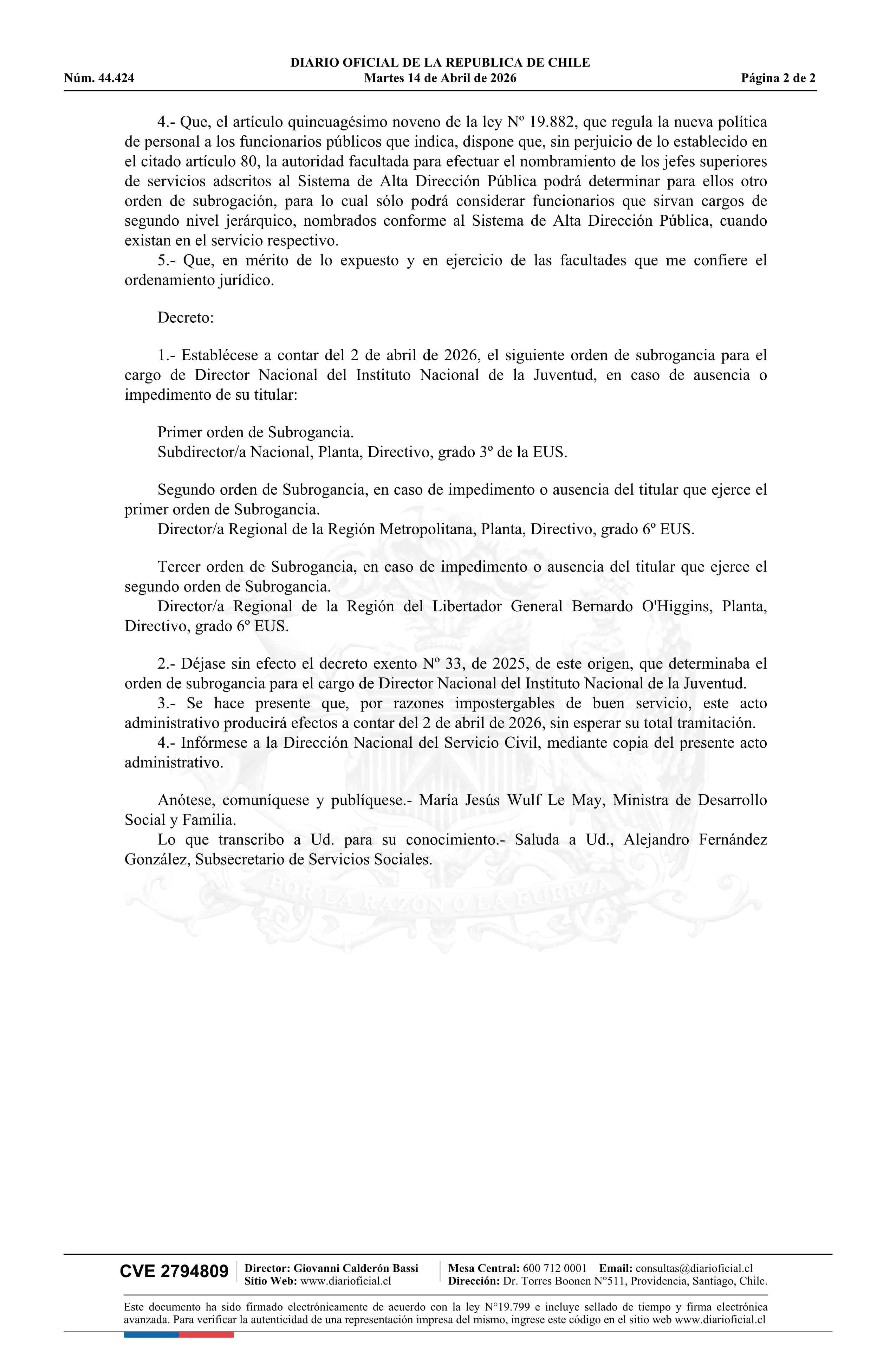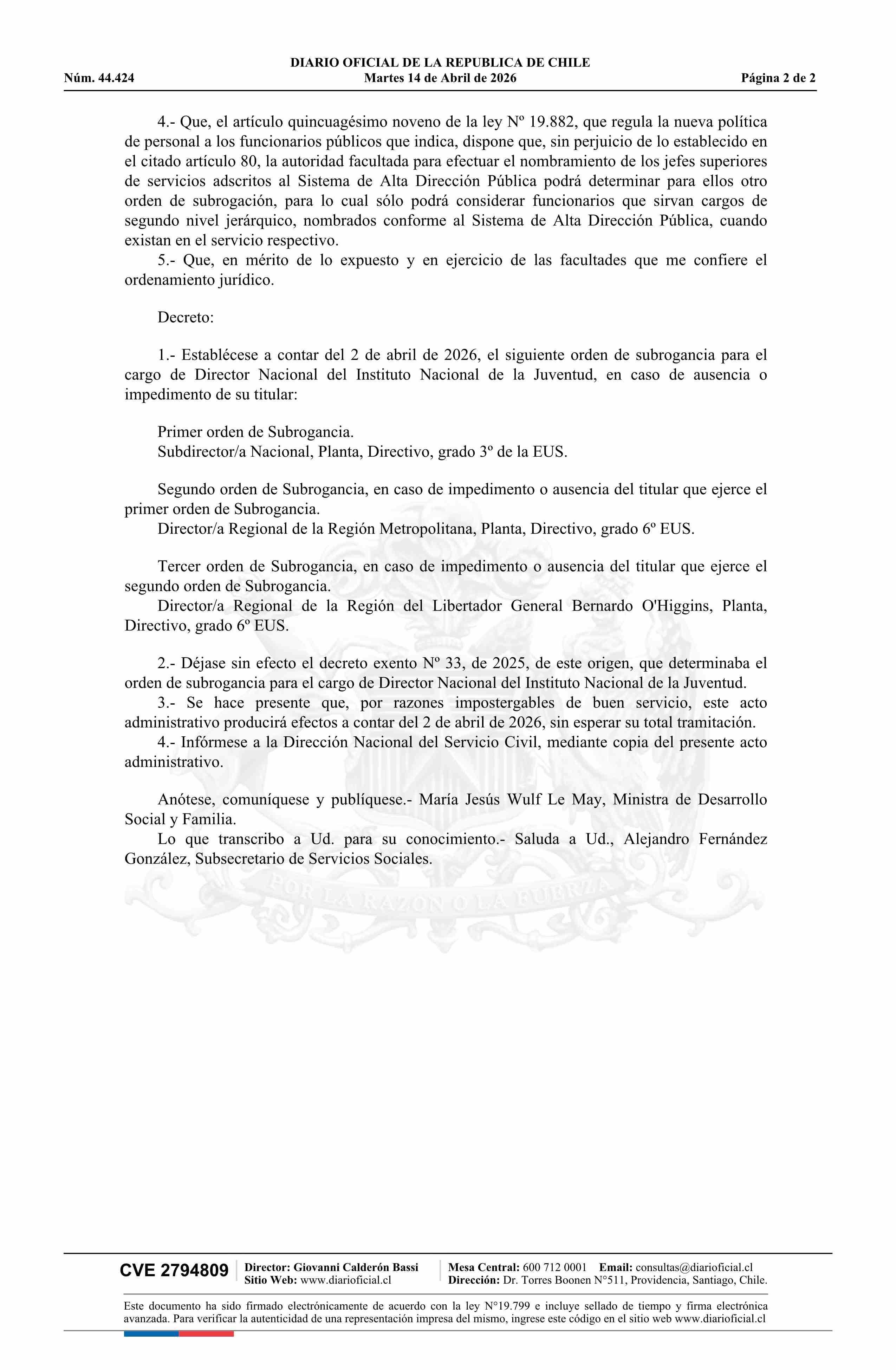 | Título: | Decreto exento número 9, de 2026.- Establece orden de subrogancia para el cargo de Director Nacional del Instituto Nacional de la Juventud y deja sin efecto decreto N° 33 exento, de 2025 |