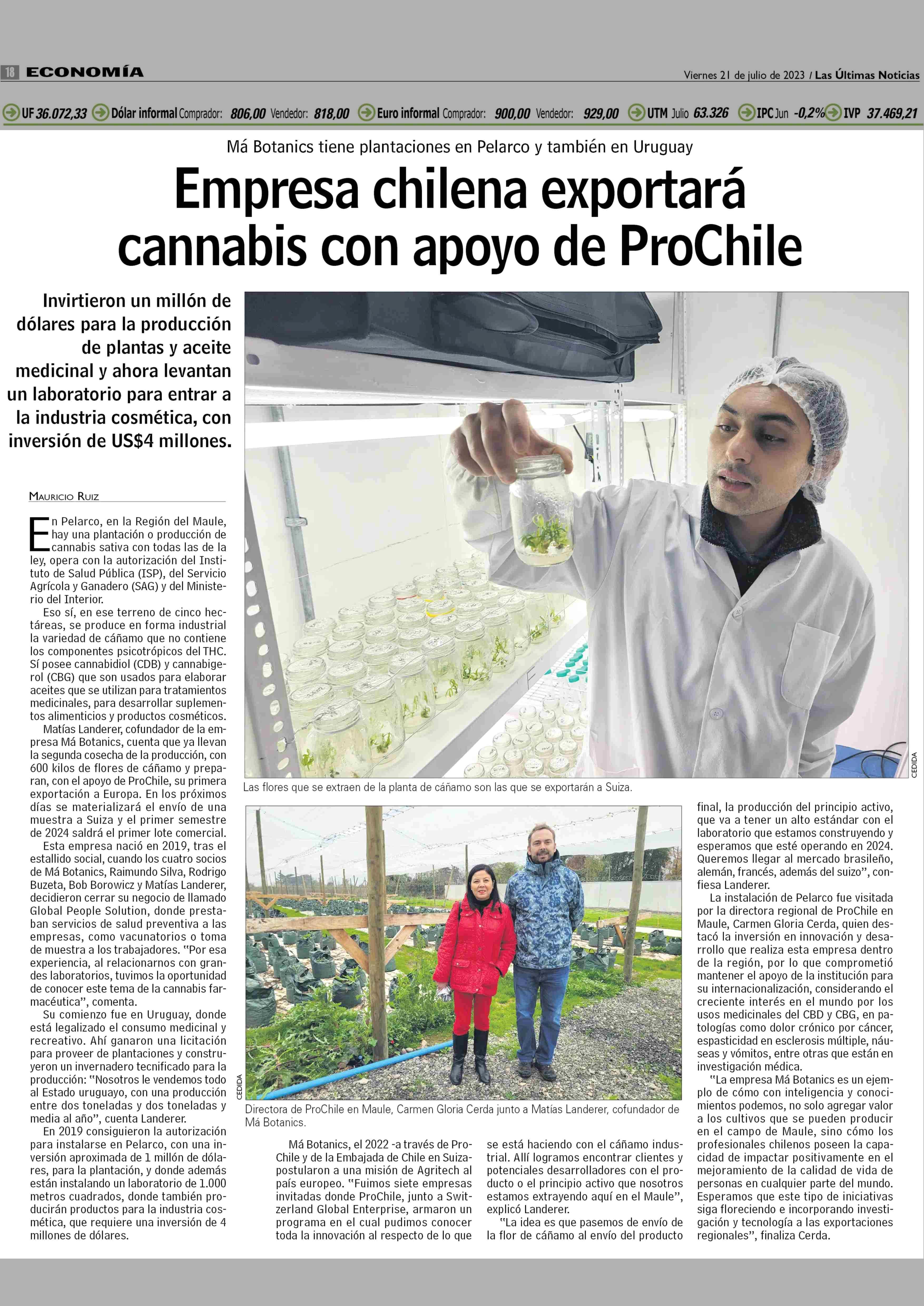 Empresa chilena exportará cannabis con apoyo de ProChile 21-07-2023 Las Últimas Noticias |