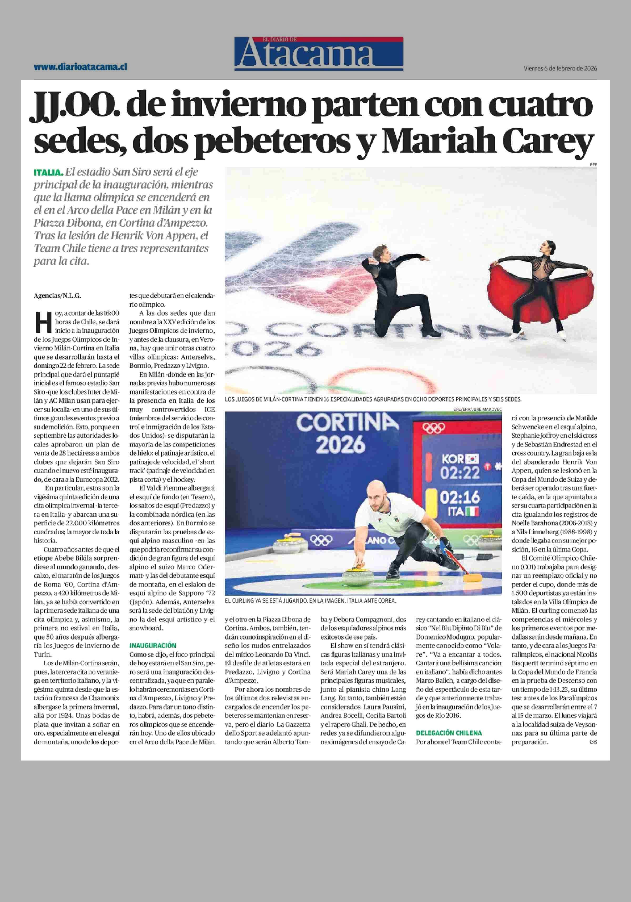 JJ.00. de invierno parten con cuatro sedes, dos pebeteros y Mariah Carey 06-02-2026 El Diario de Atacama |
