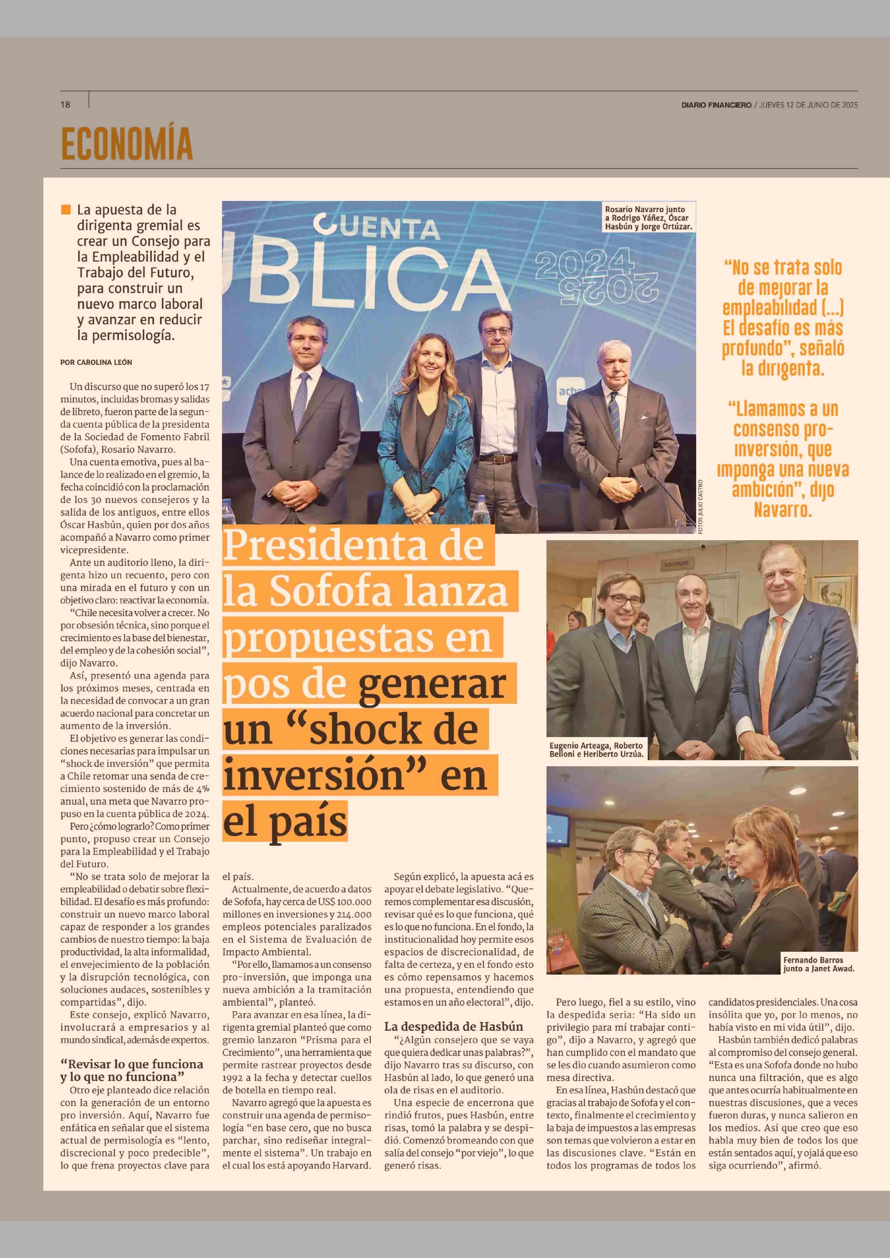 Presidenta de la Sofofa lanza propuestas en pos de generar un “shock de inversión” en el país 12-06-2025 Diario Financiero |