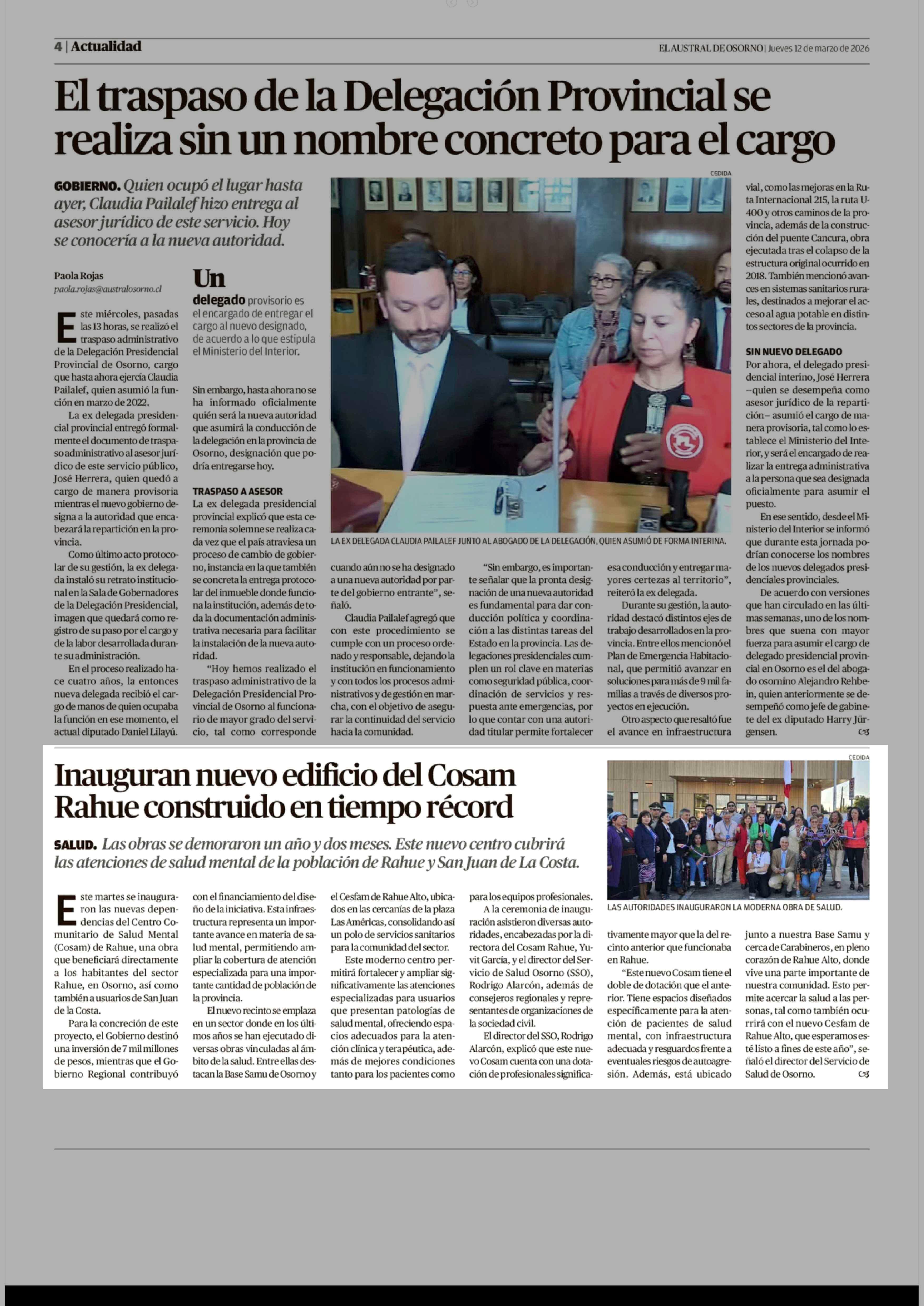 Inauguran nuevo edificio del Cosam Rahue construido en tiempo récord 12-03-2026 El Austral de Osorno |