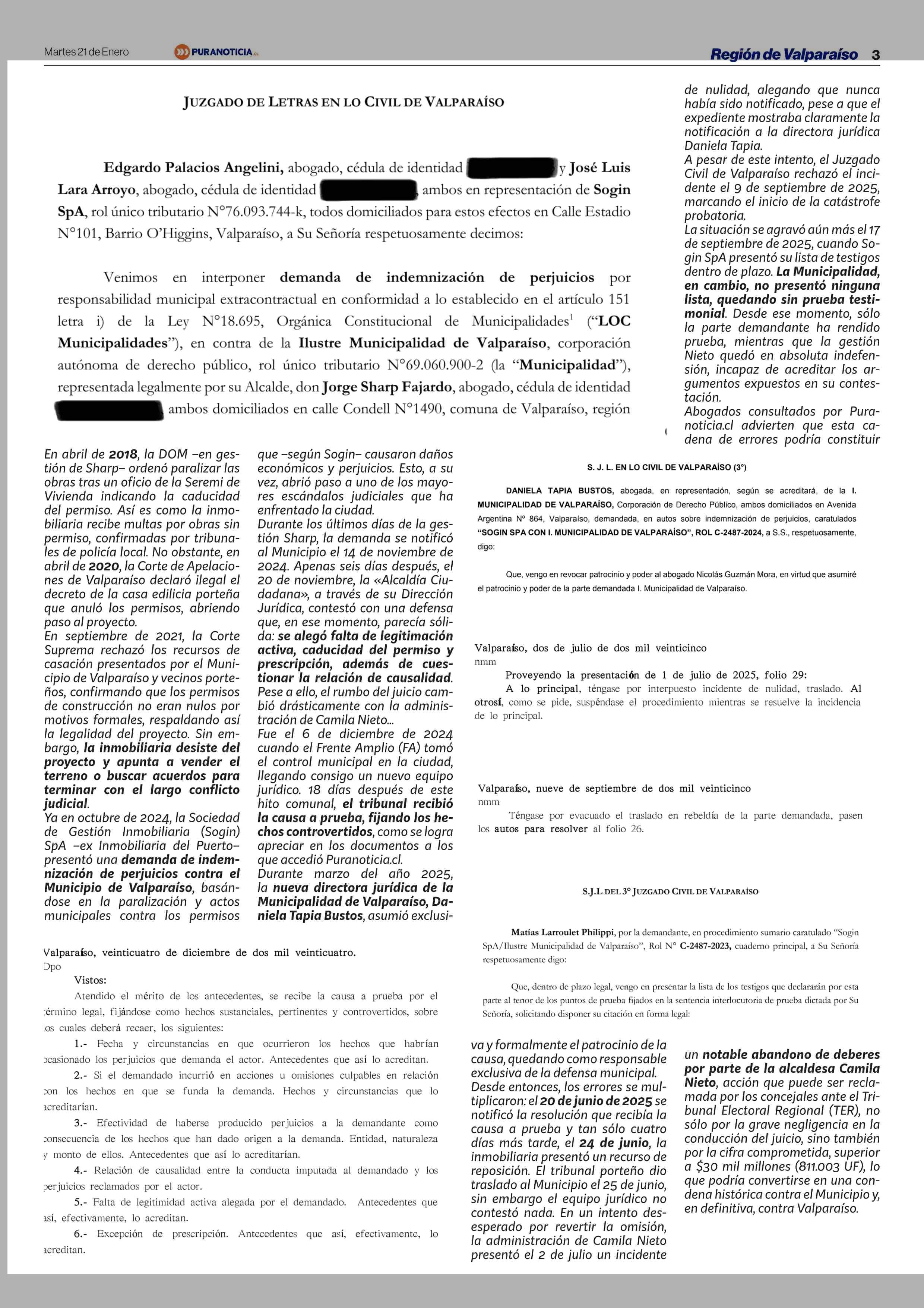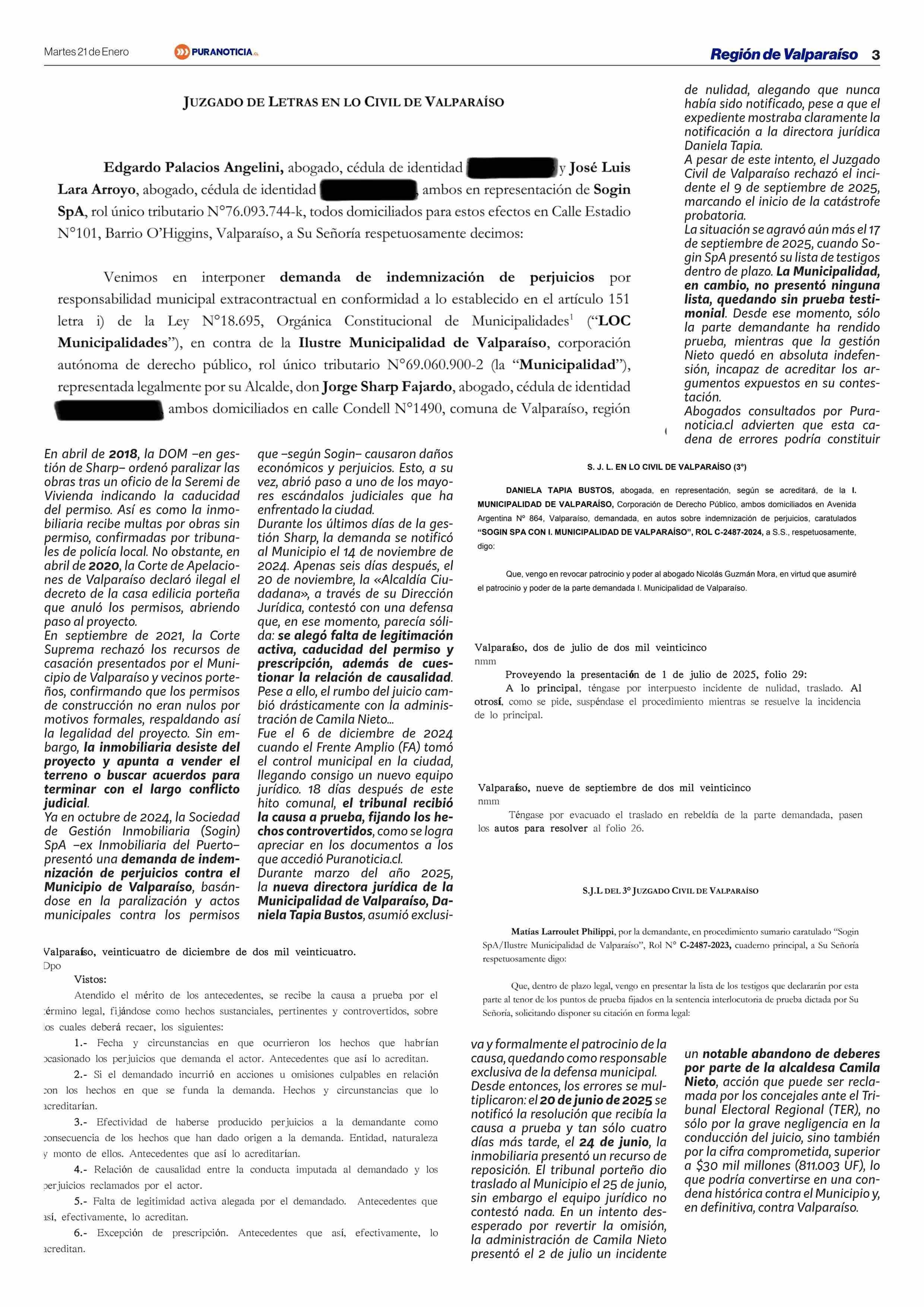 Graves errores procesales dejan al Municipio de Valparaíso en seria desventaja frente a millonaria demanda por «Caso Púmpin» 21-01-2026 Puranoticia.cl |