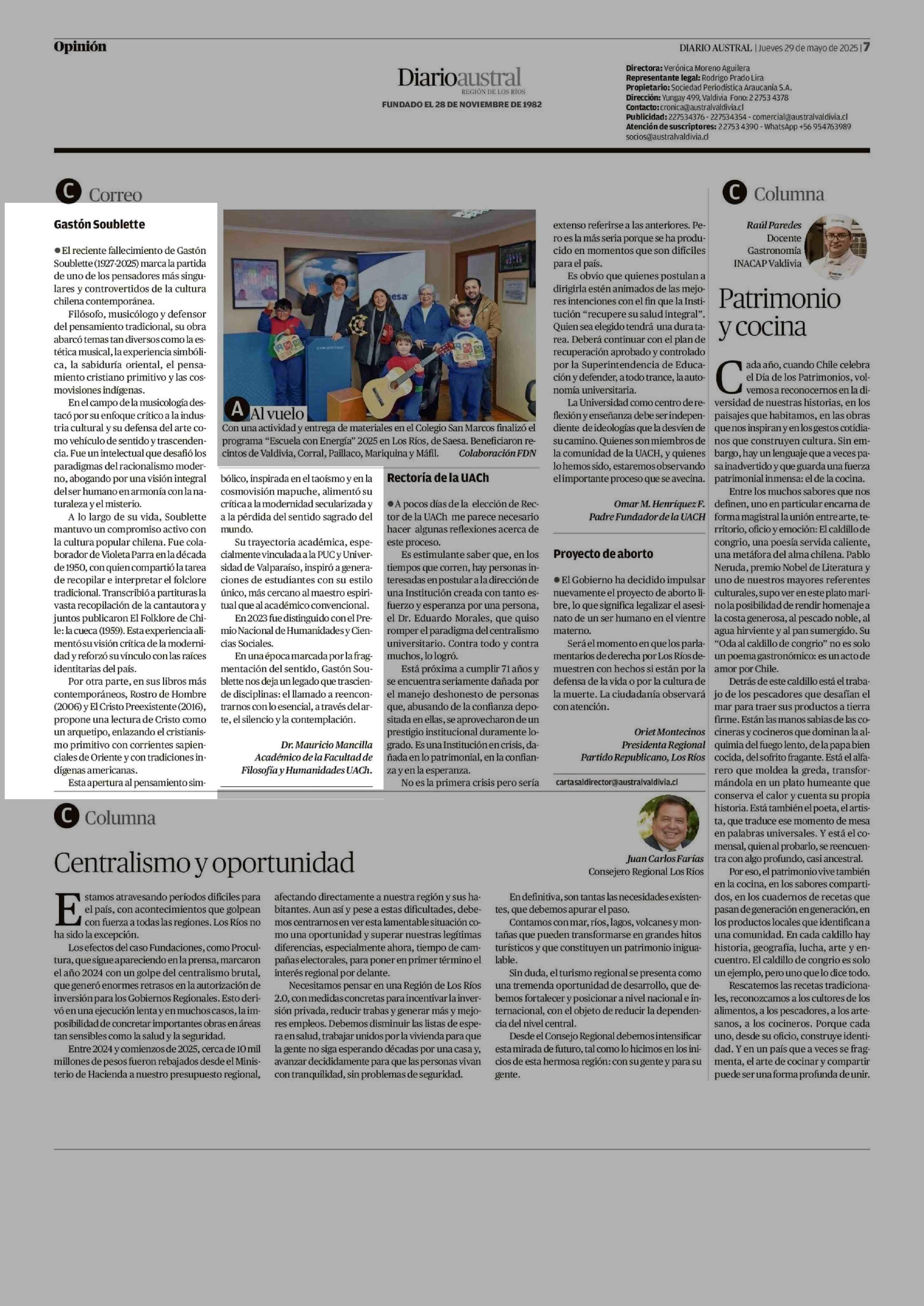 CARTAS: Gastón Soublette 29-05-2025 Diario Austral Región de Los Ríos |
