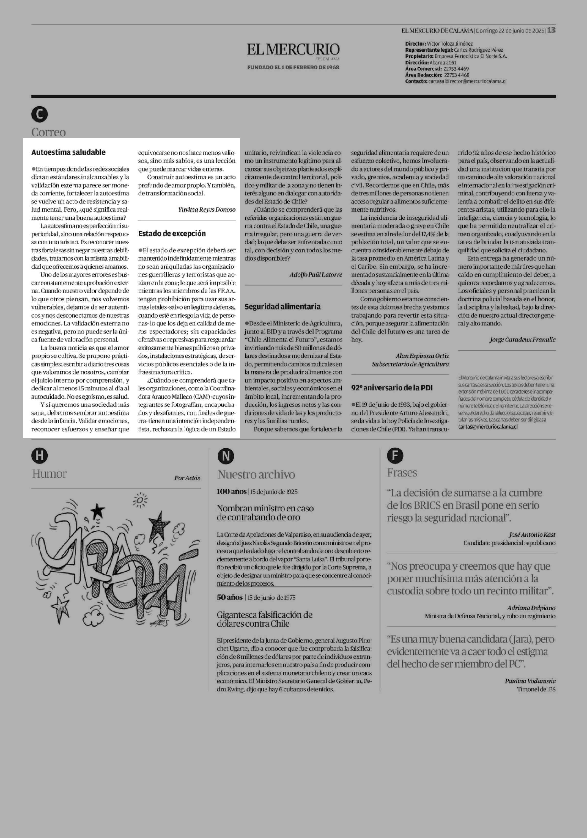 CARTAS: Autoestima saludable 22-06-2025 El Mercurio de Calama |