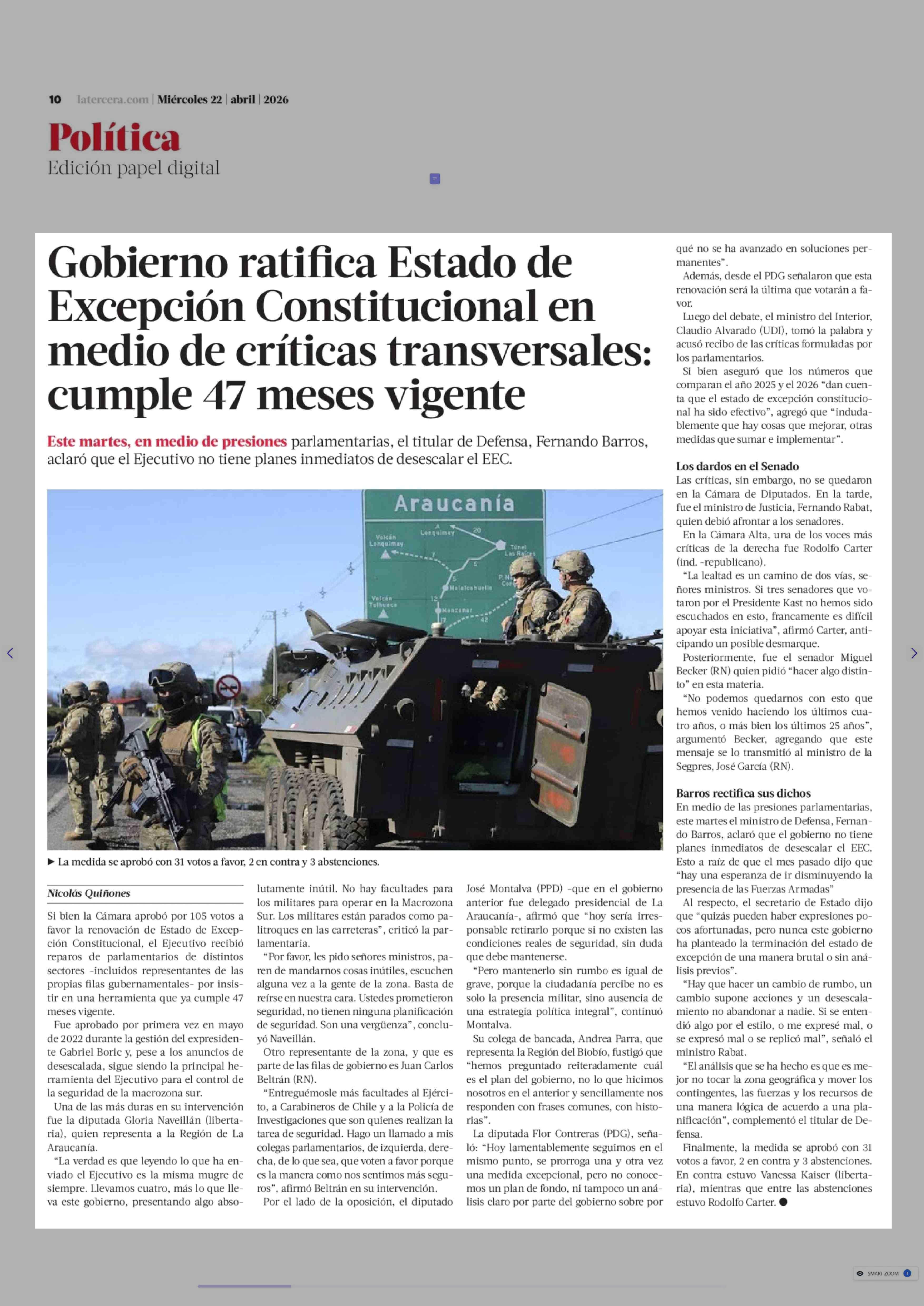 Gobierno ratifica Estado de Excepción Constitucional en medio de críticas transversales: cumple 47 meses vigente 22-04-2026 La Tercera |