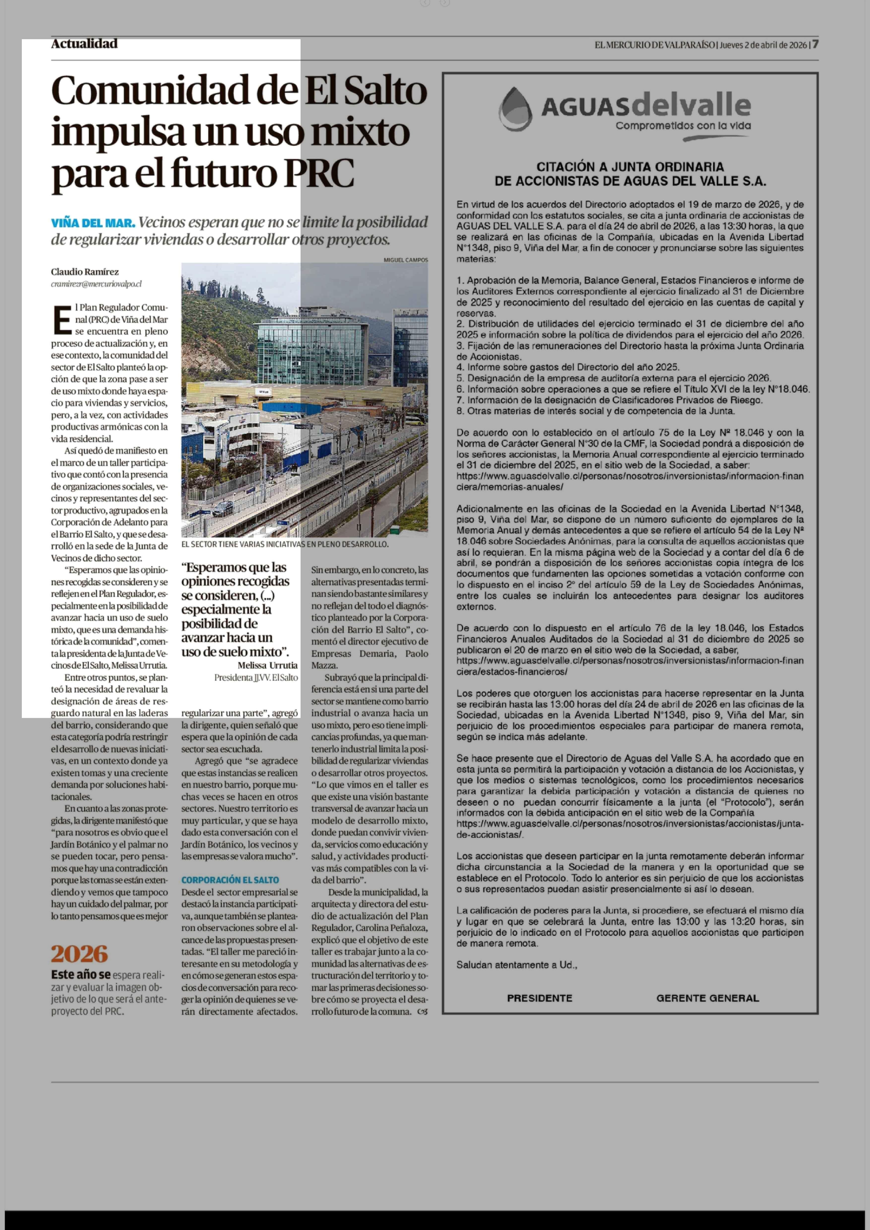 Comunidad de El Salto impulsa un uso mixto para el futuro PRC 02-04-2026 El Mercurio de Valparaíso |