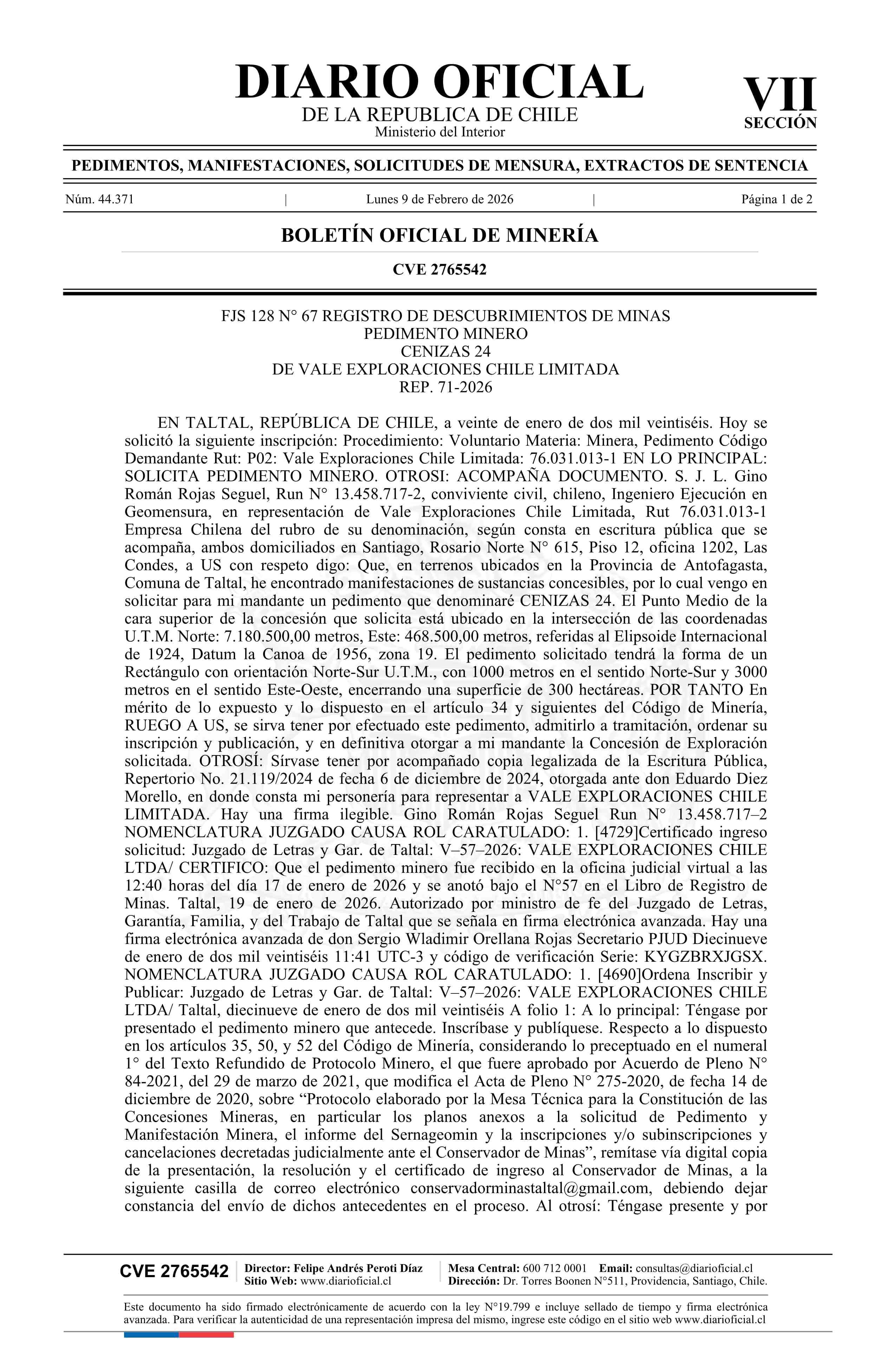 CENIZAS 24 / Vale Exploraciones Chile Limitada 09-02-2026 DIARIO OFICIAL CHILE - BOLETÍN OFICIAL DE MINERÍA |