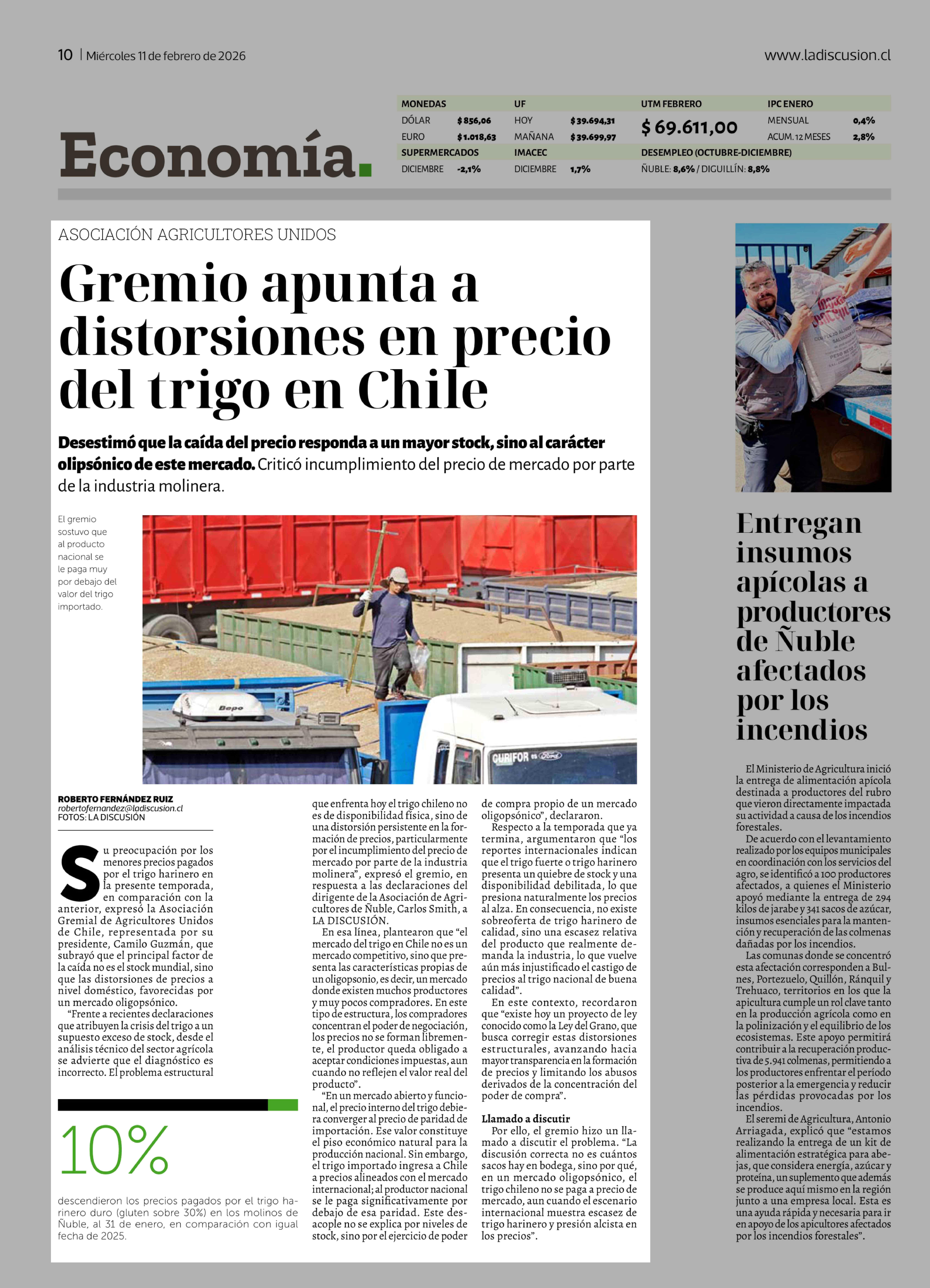 Gremio apunta a distorsiones en precio del trigo en Chile 11-02-2026 La Discusión |