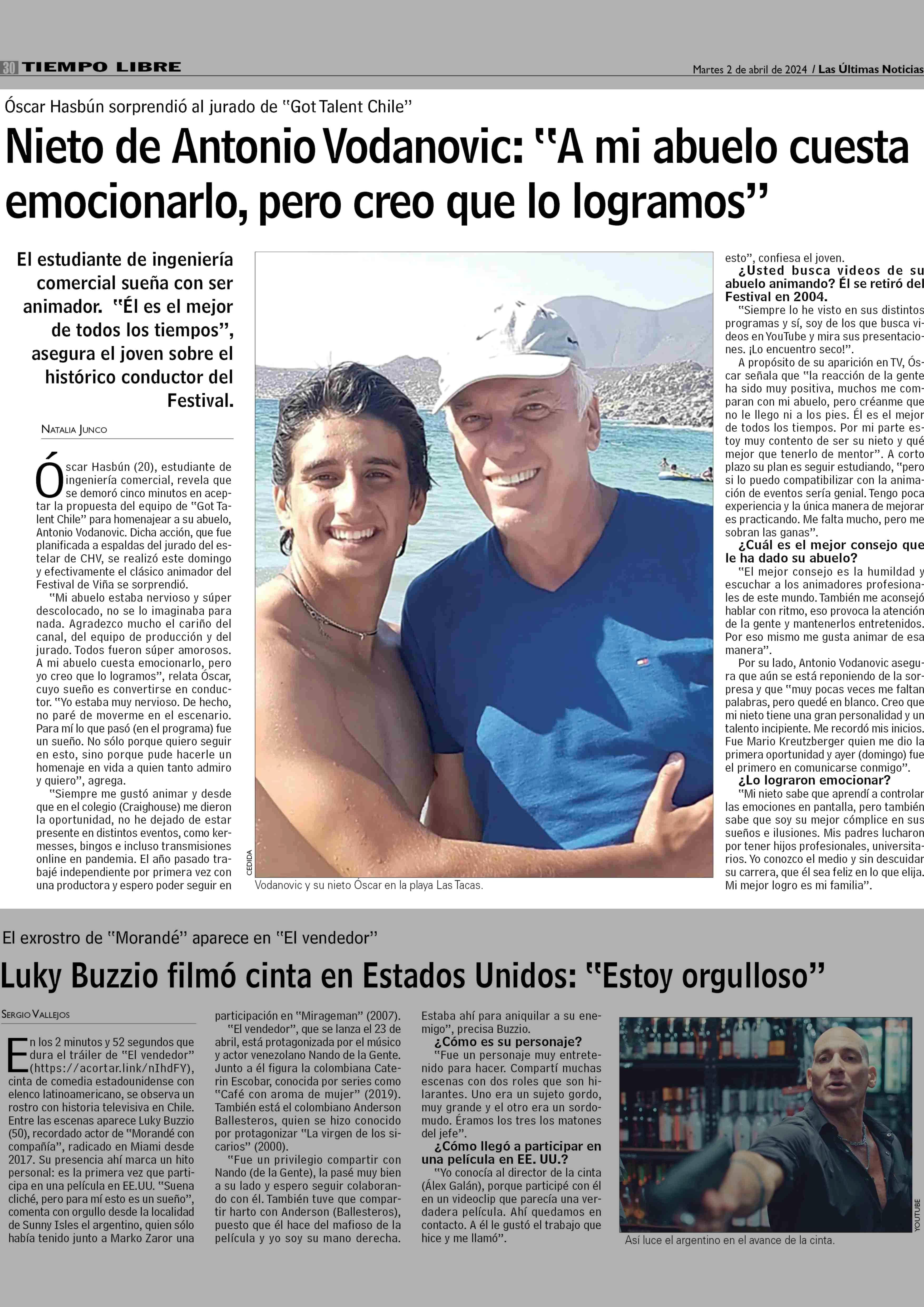 Nieto de Antonio Vodanovic: "A mi abuelo cuesta emocionarlo, pero creo que lo logramos" 02-04-2024 Las Últimas Noticias |