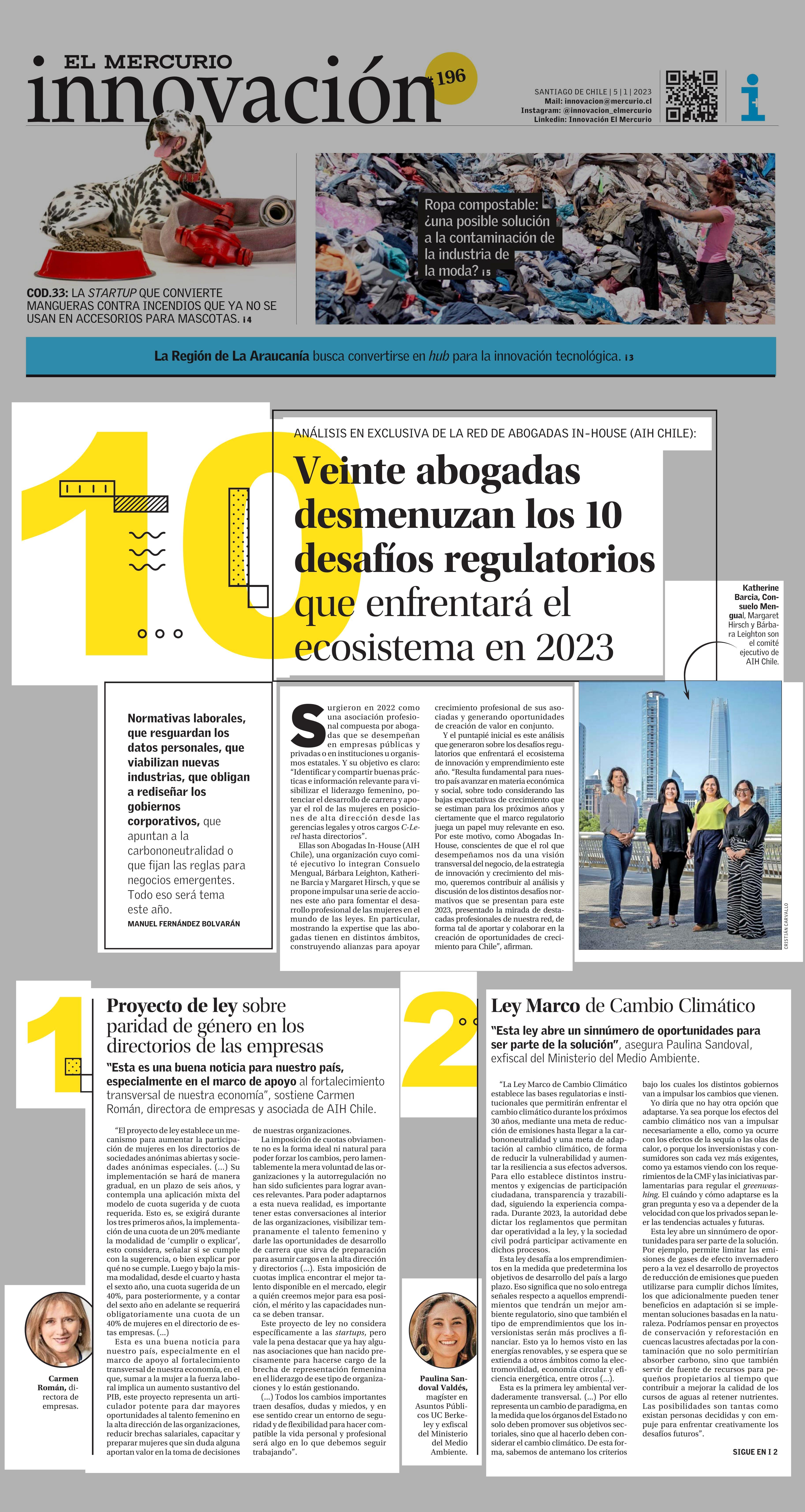 Veinte abogadas desmenuzan los 10 desafíos regulatorios que enfrentará el ecosistema en 2023 05-01-2023 El Mercurio |