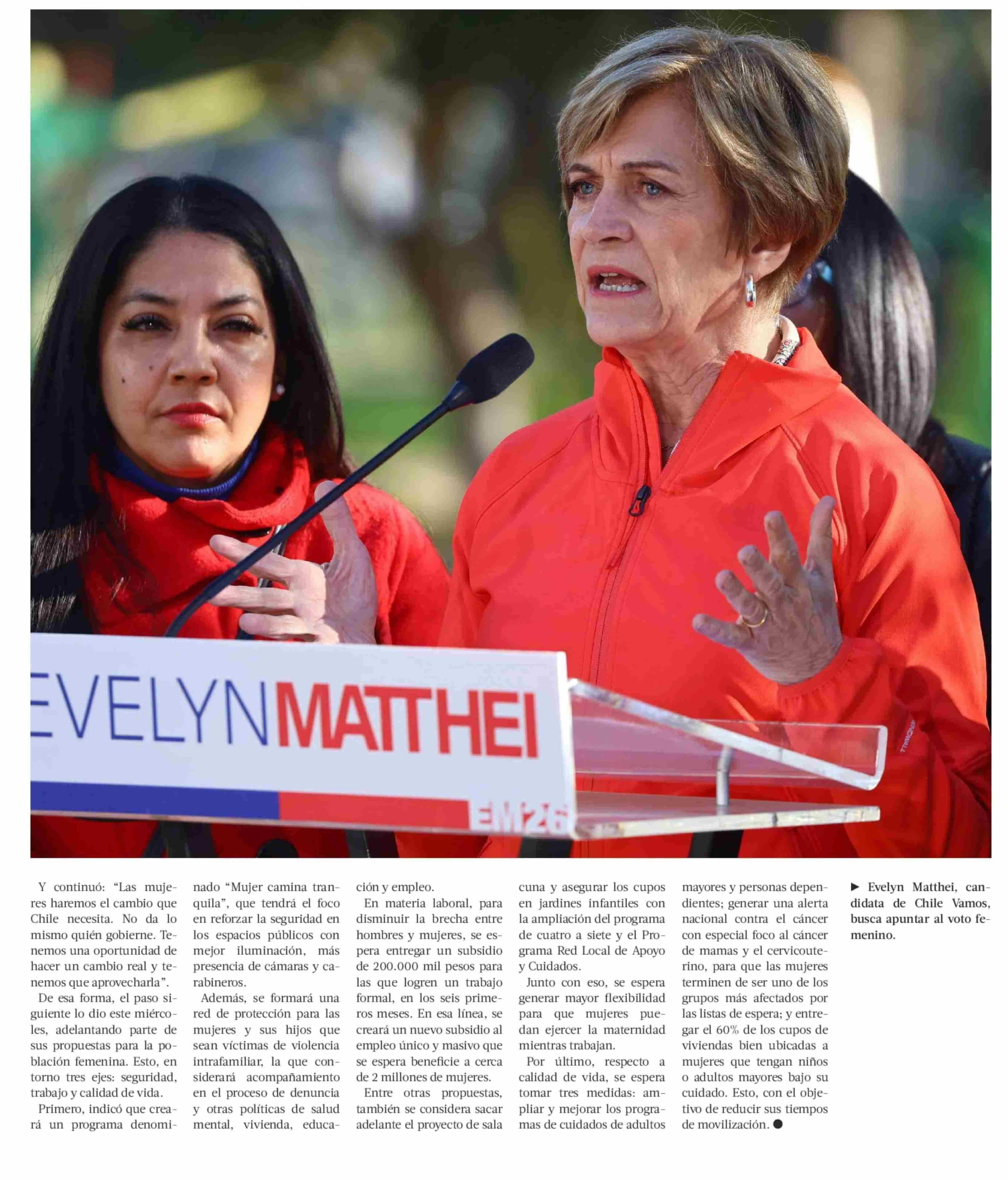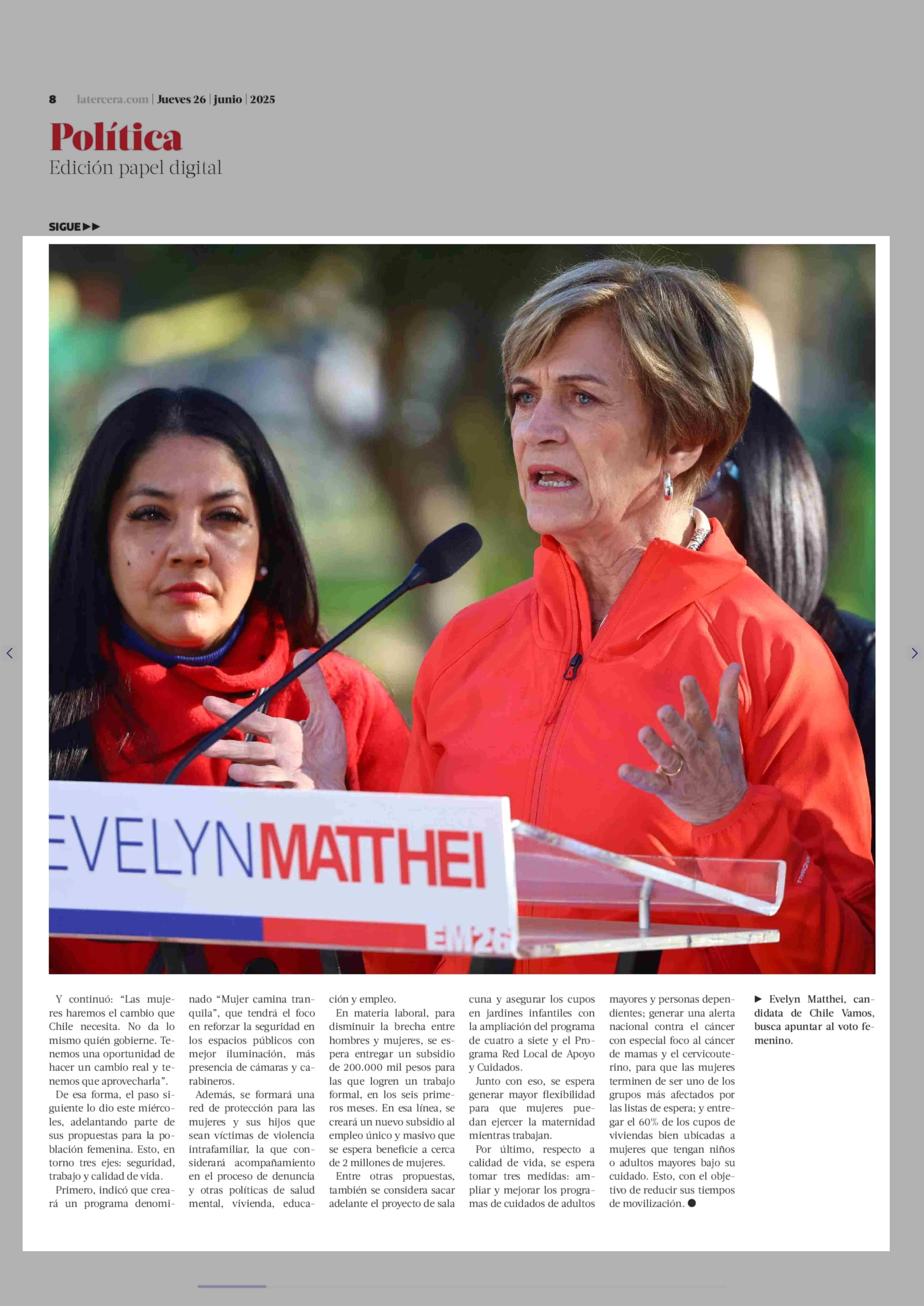 Matthei apunta a reforzar el voto femenino y presenta propuestas “por las mujeres” 26-06-2025 La Tercera |