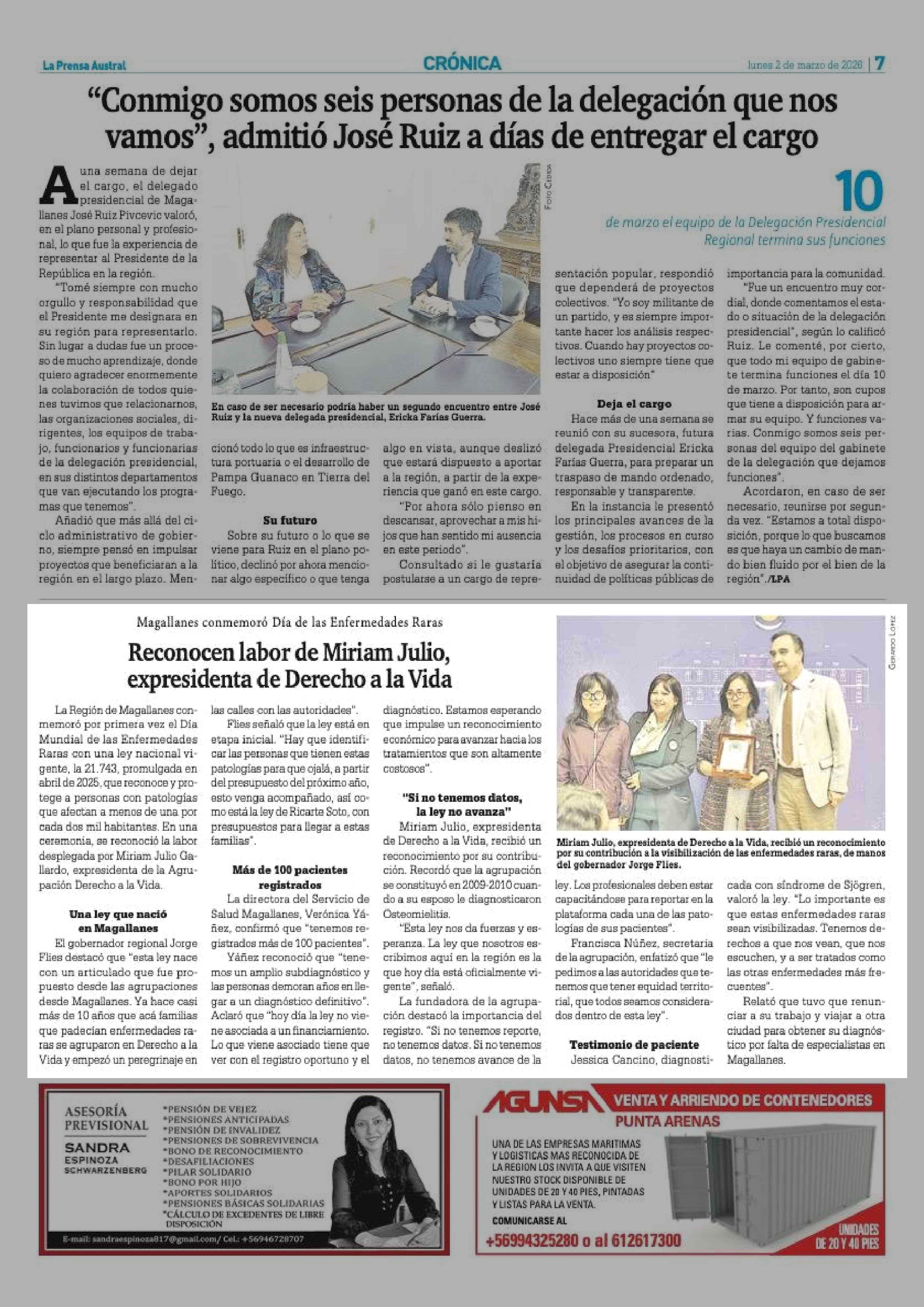 Reconocen labor de Miriam Julio, expresidenta de Derecho a la Vida 02-03-2026 La Prensa Austral |