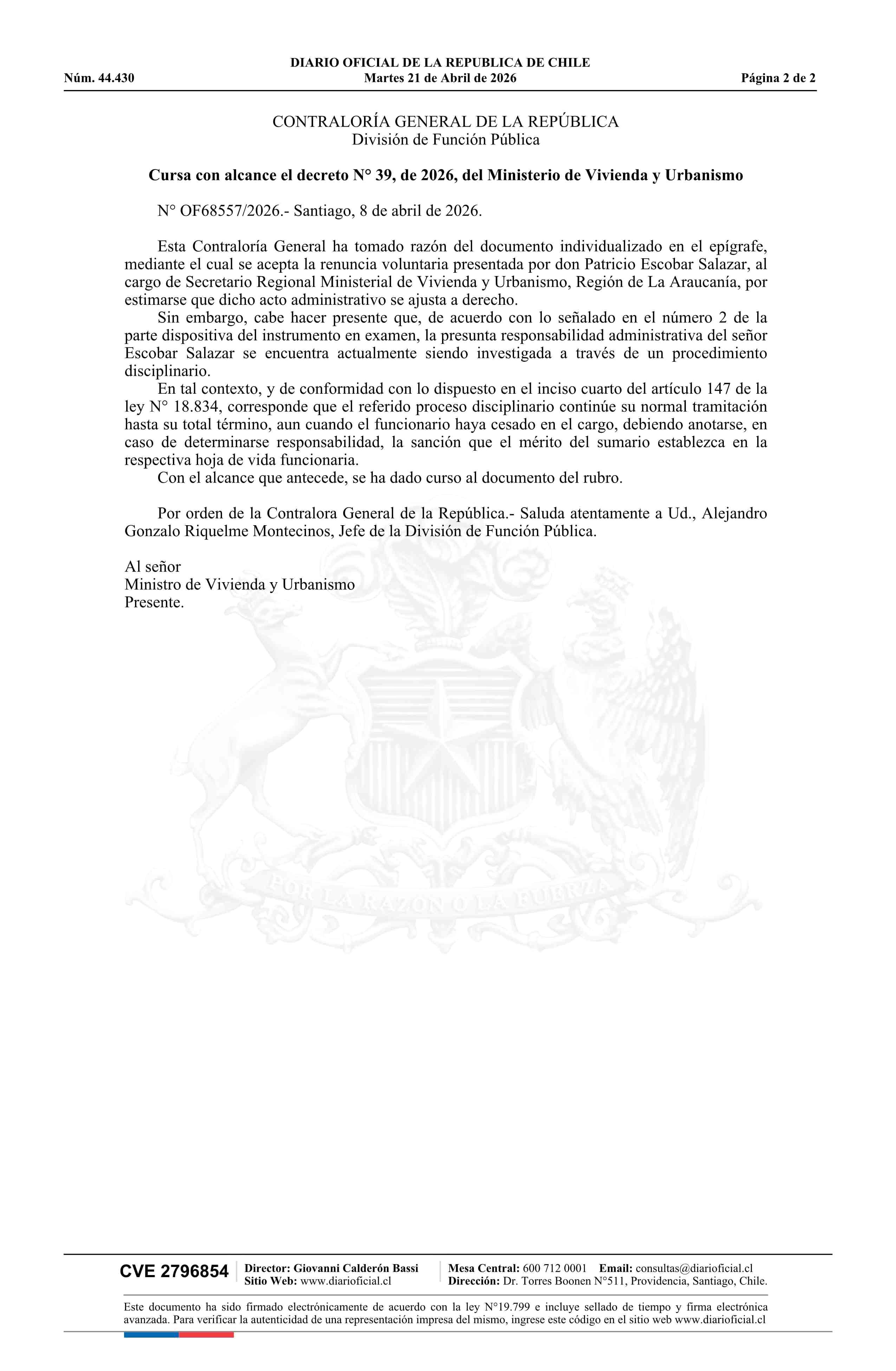 | Título: | Decreto número 39, de 2026.- Acepta renuncia voluntaria de don Patricio Andrés Escobar Salazar al cargo de Secretario Regional Ministerial de la Región de La Araucanía |