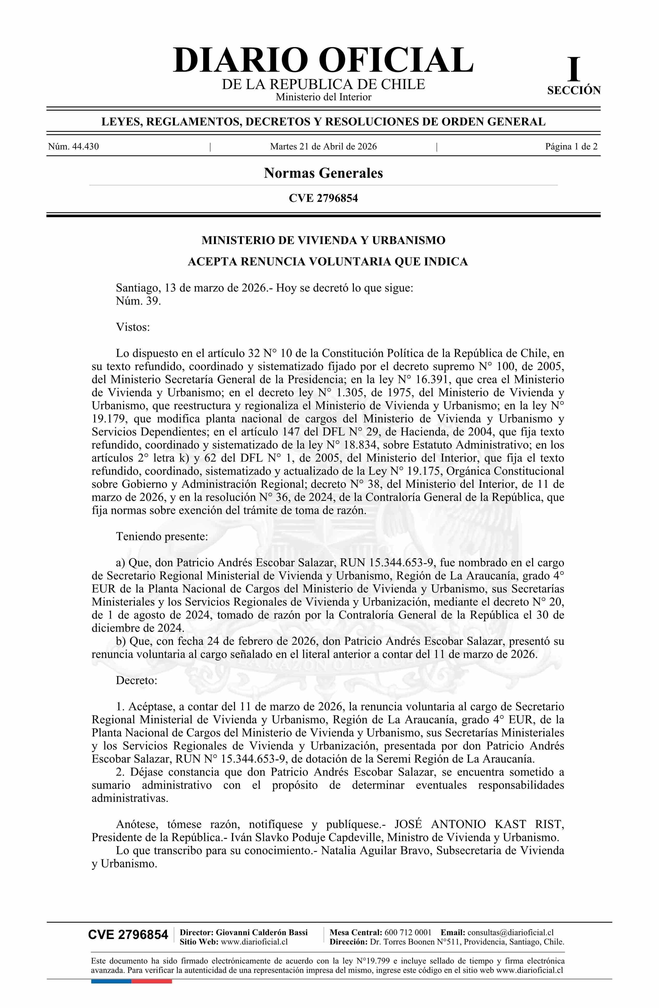 Decreto número 39, de 2026.- Acepta renuncia voluntaria de don Patricio Andrés Escobar Salazar al cargo de Secretario Regional Ministerial de la Región de La Araucanía 21-04-2026 Diario Oficial Edición Electrónica |