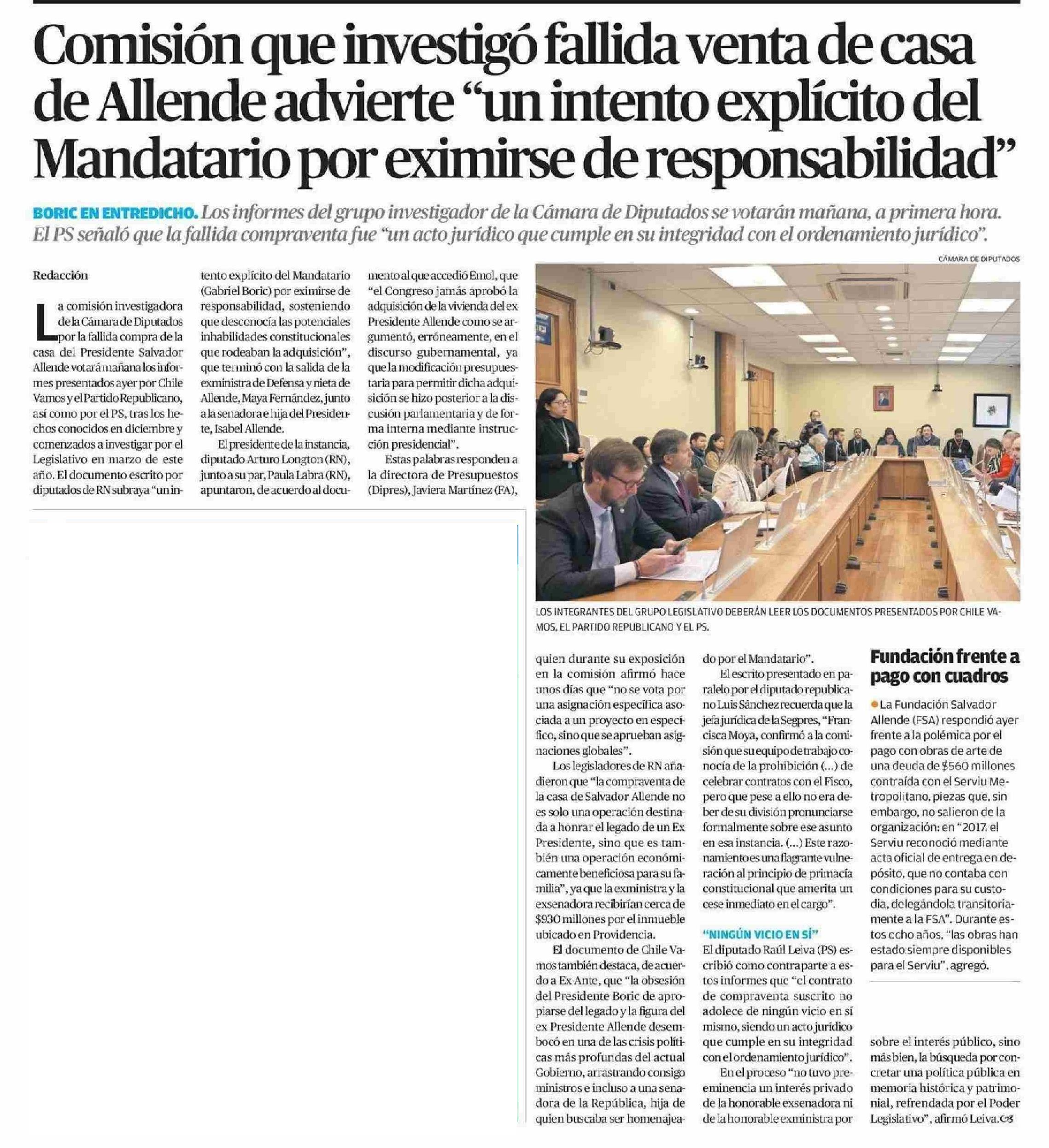 | Título: | Comisión que investigó fallida venta de casa de Allende advierte “un intento explícito del Mandatario por eximirse de responsabilidad” |