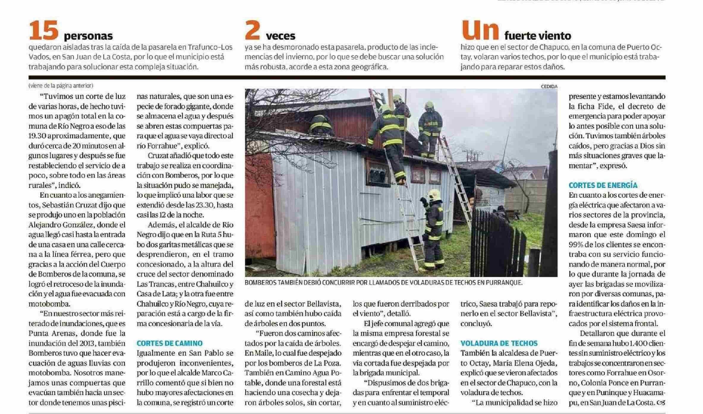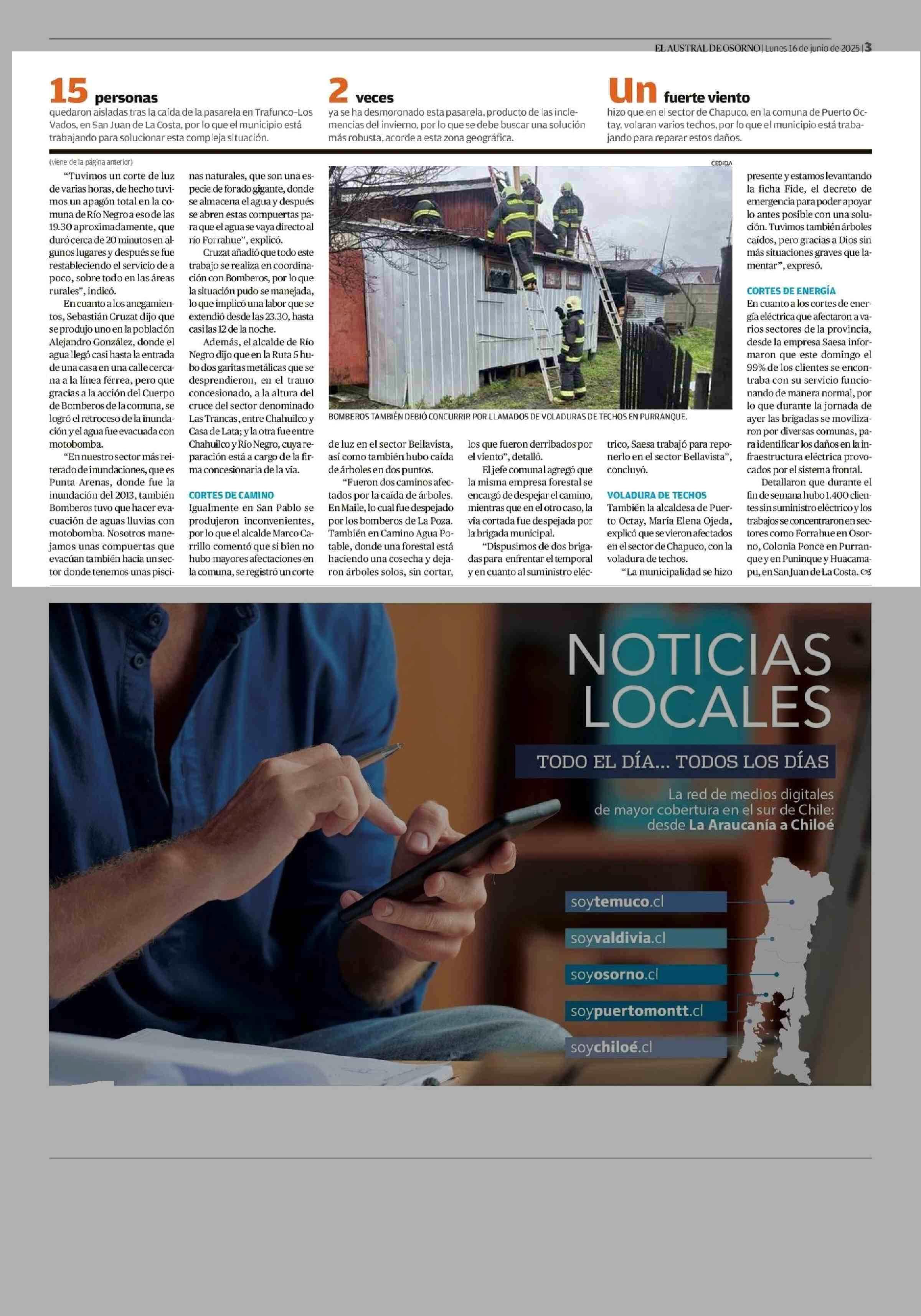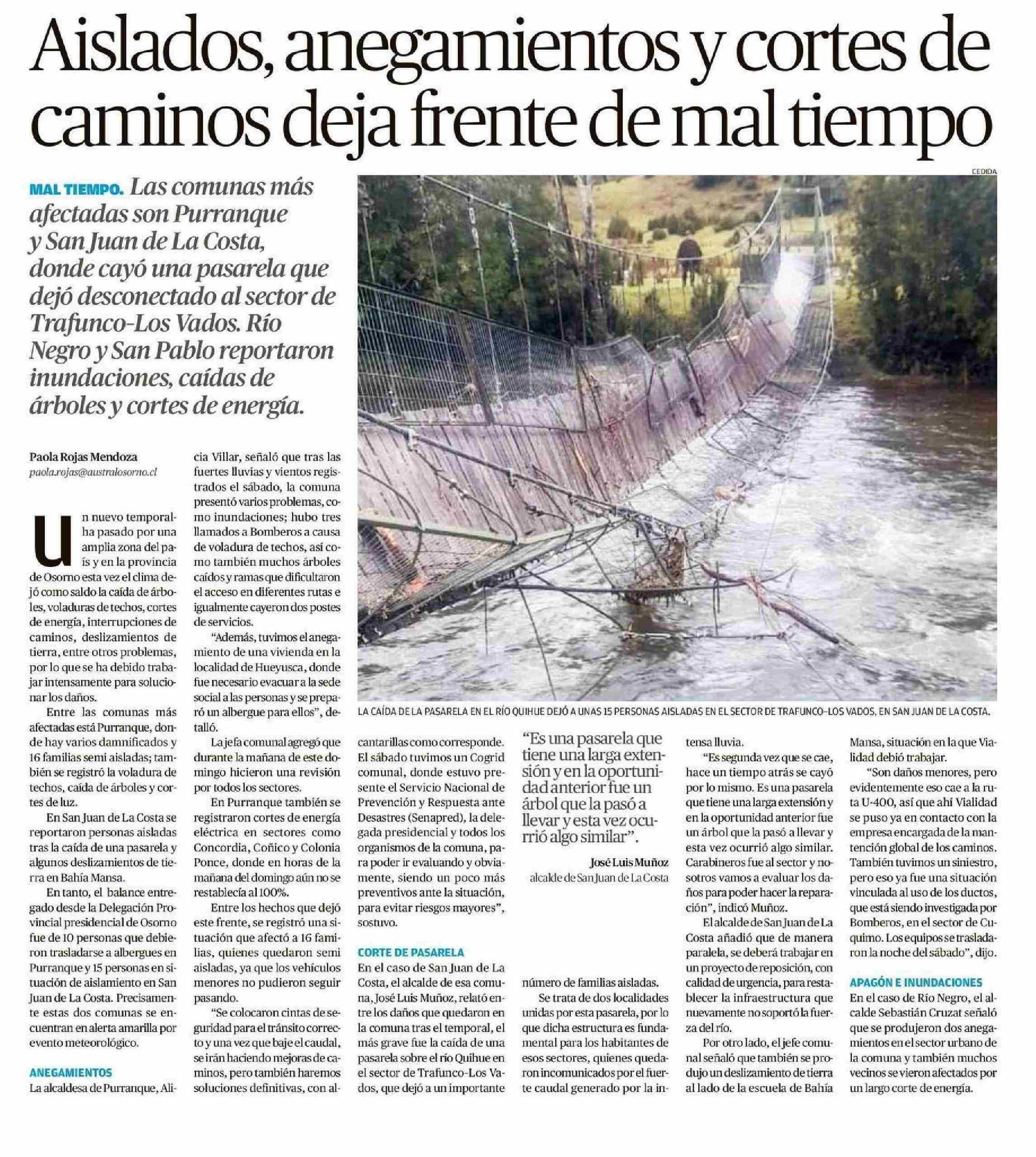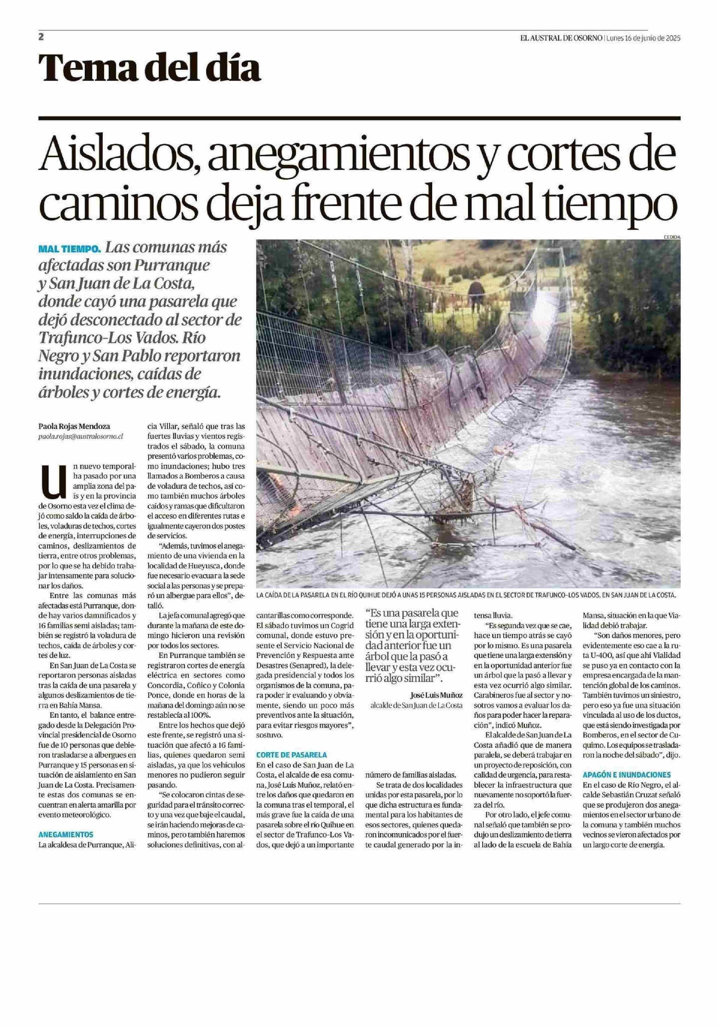 Aislados, anegamientos y cortes de caminos deja frente de mal tiempo 16-06-2025 El Austral de Osorno |