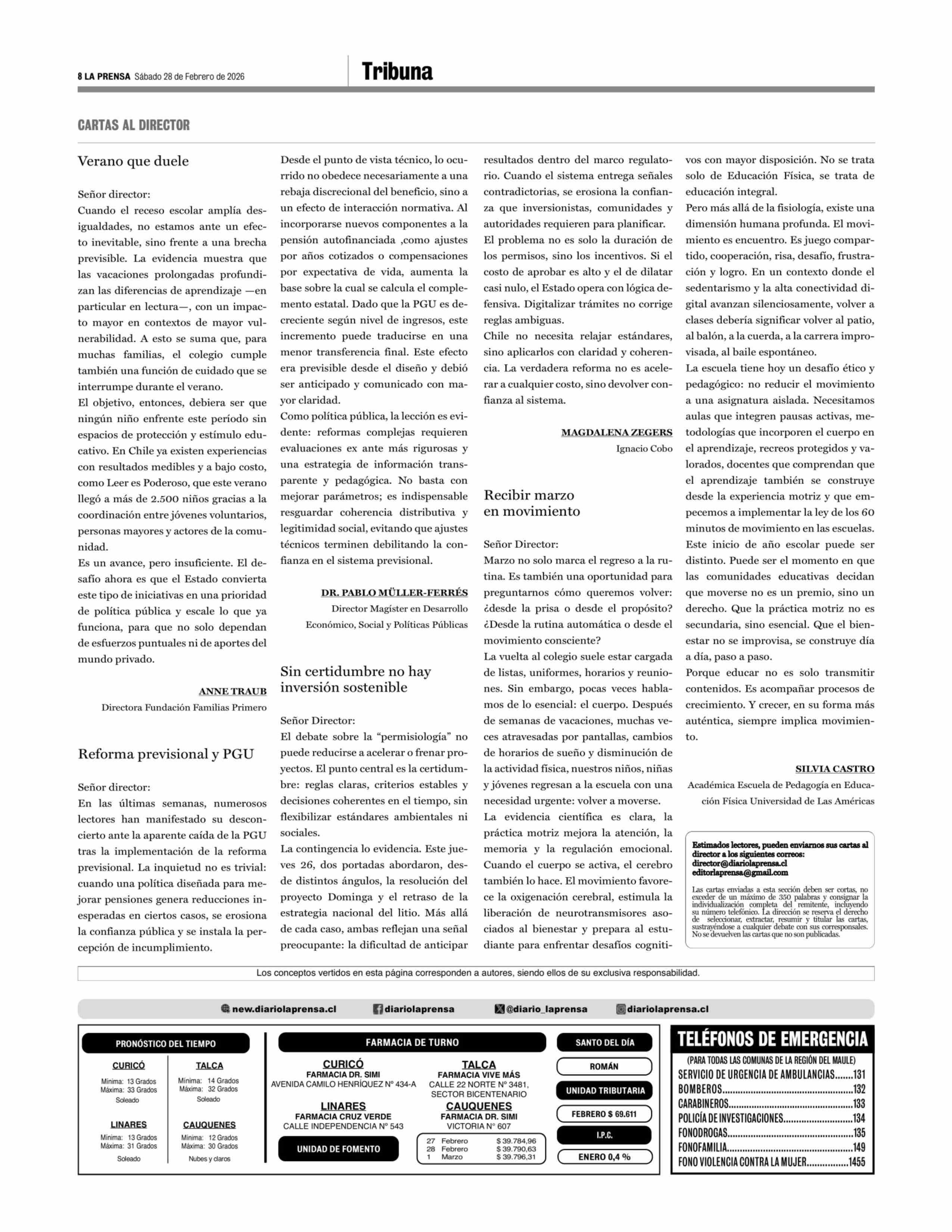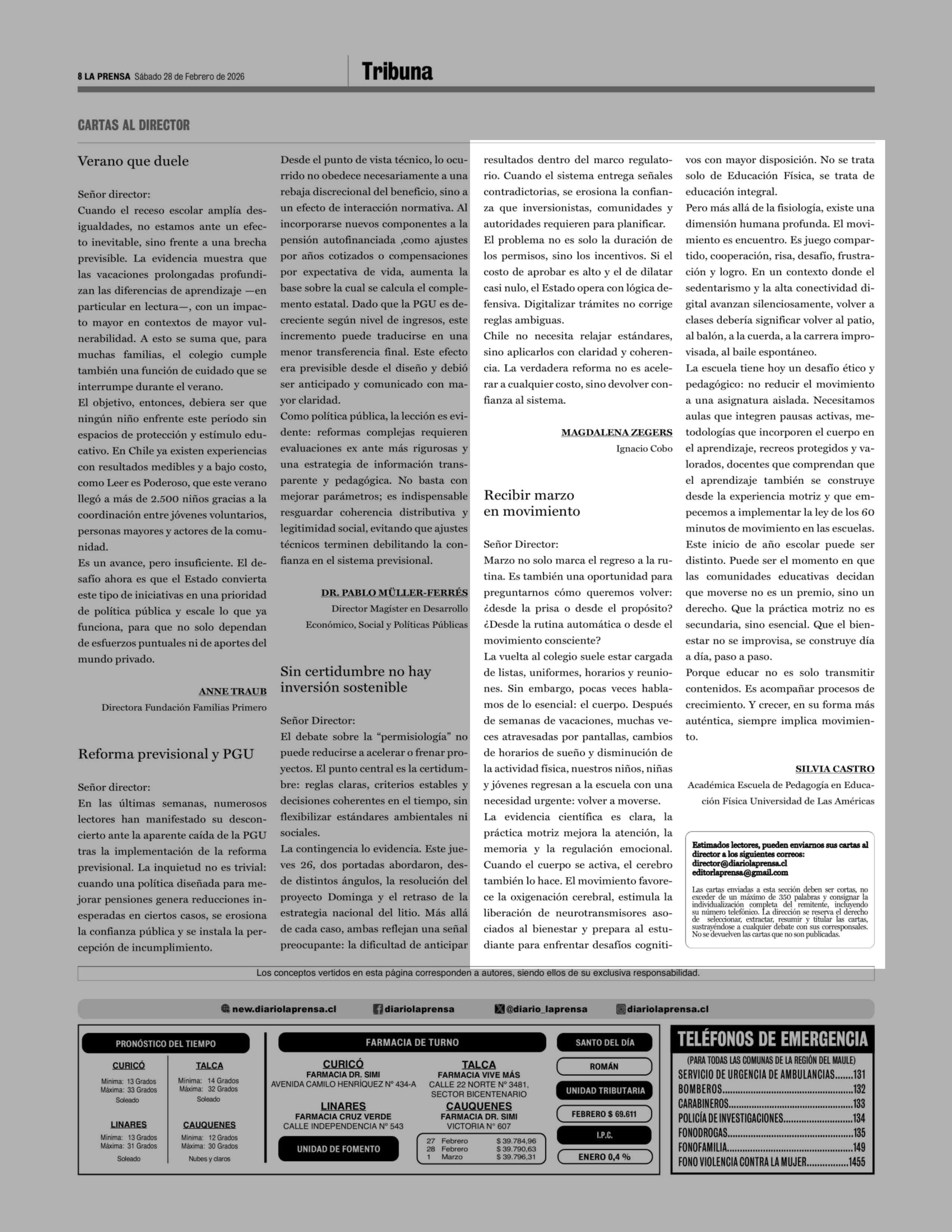 Cartas: Recibir marzo en movimiento 28-02-2026 La Prensa de Curicó |
