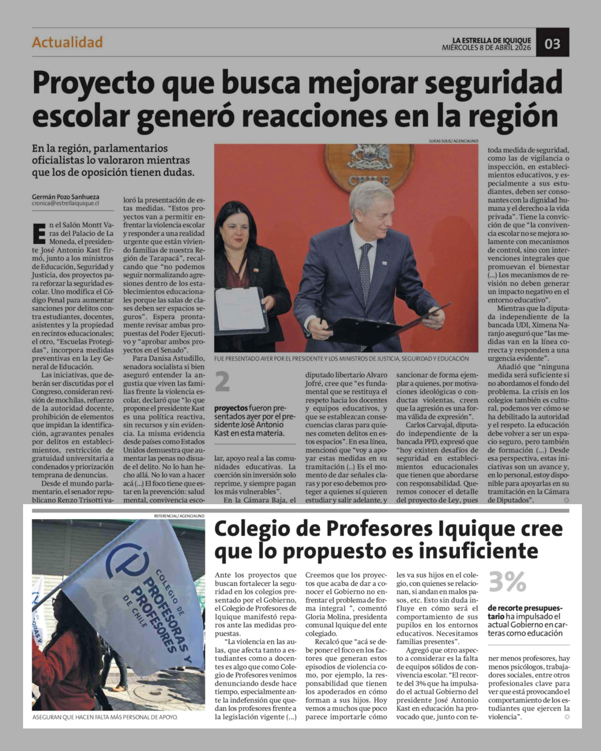 Colegio de Profesores Iquique cree que lo propuesto es insuficiente 08-04-2026 La Estrella de Iquique |