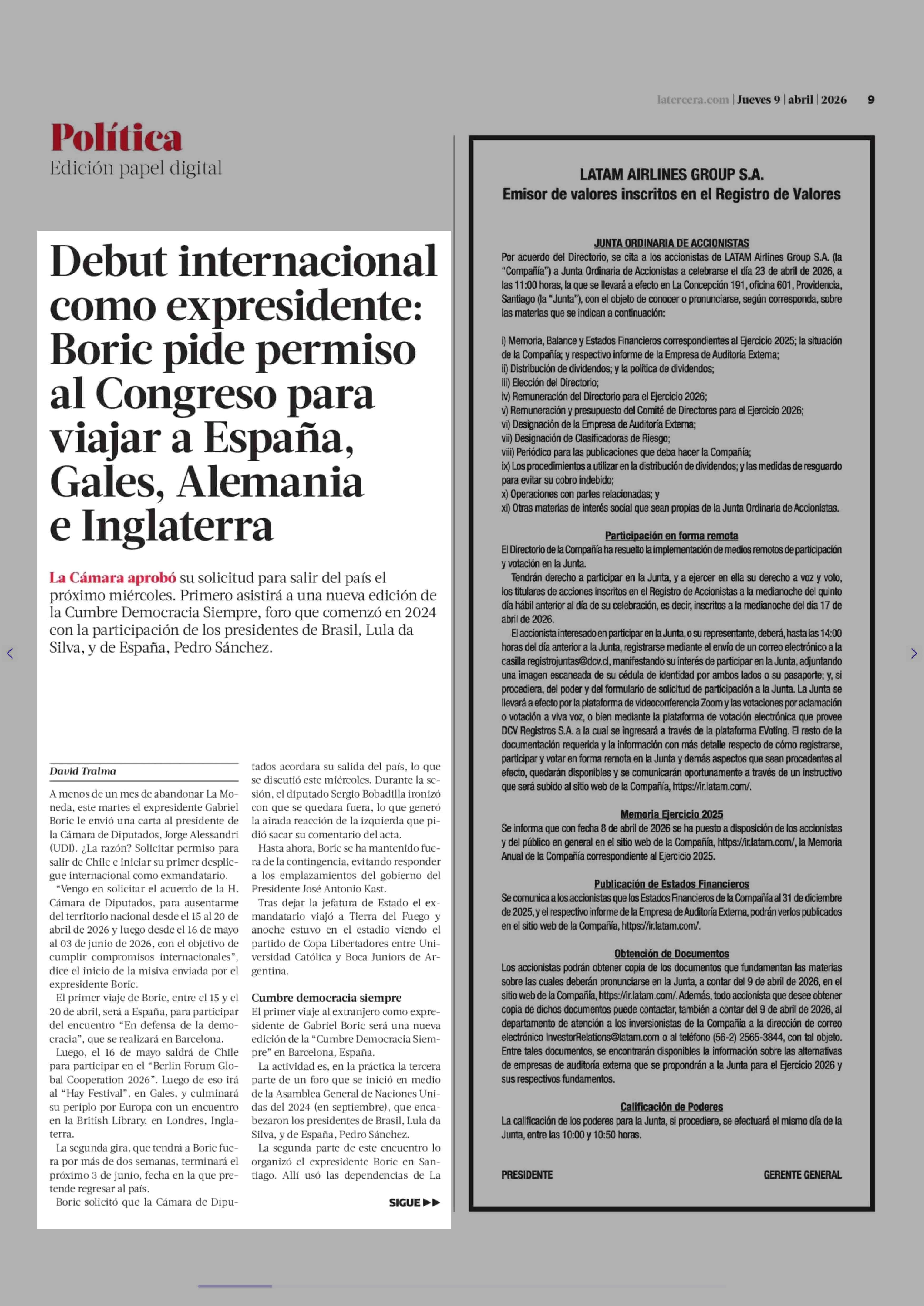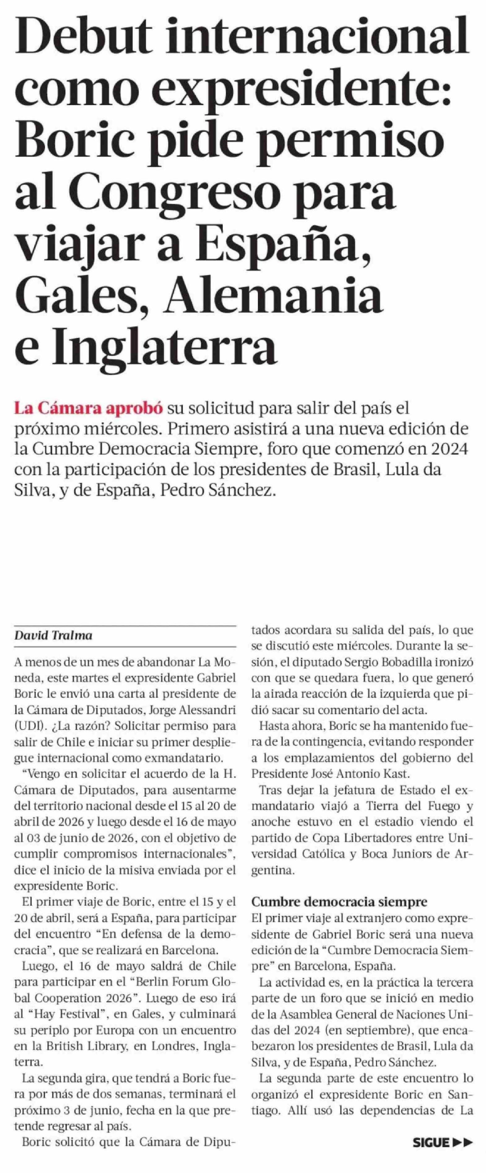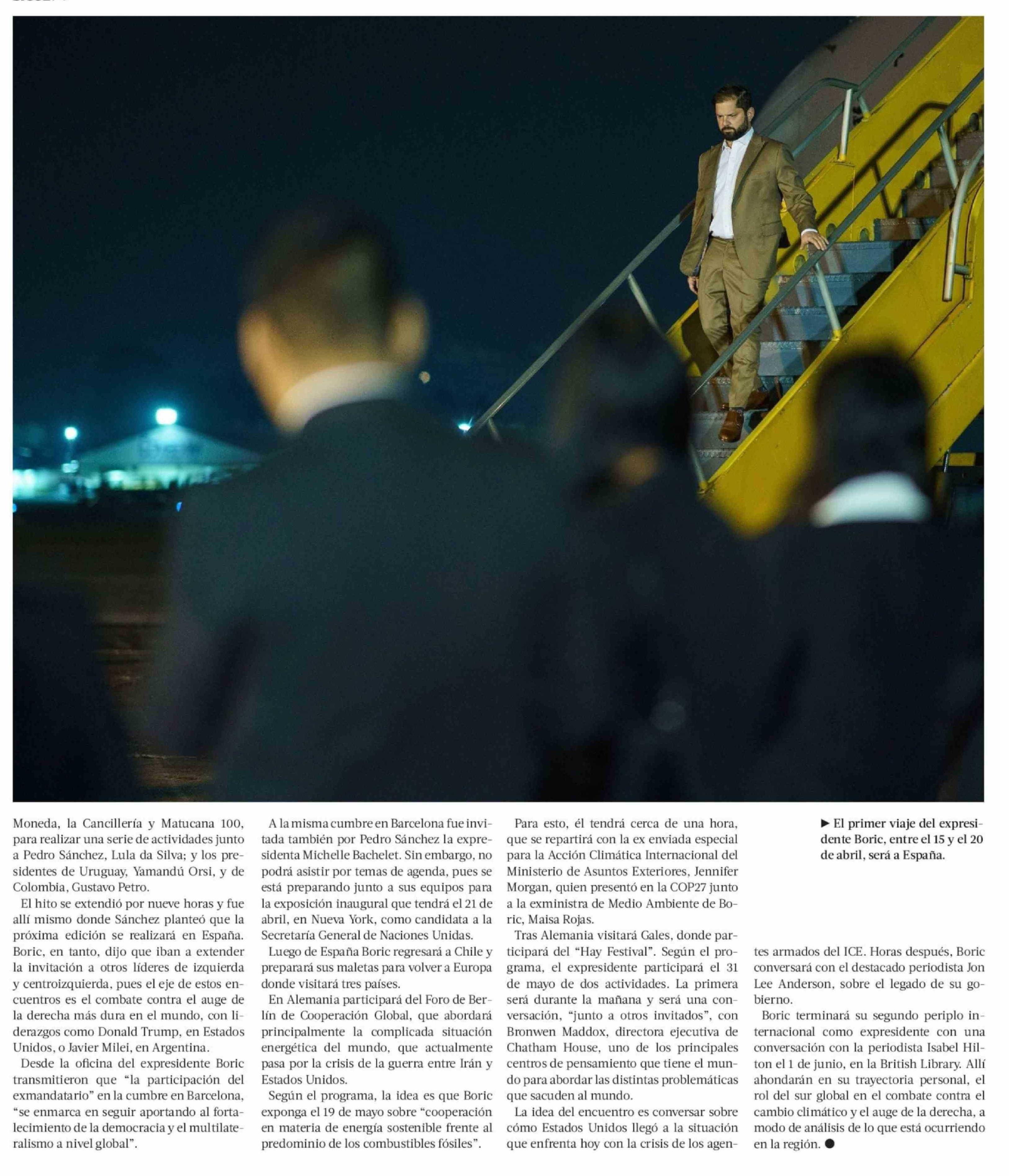 Debut internacional como expresidente: Boric pide permiso al Congreso para viajar a España, Gales, Alemania e Inglaterra 09-04-2026 La Tercera |