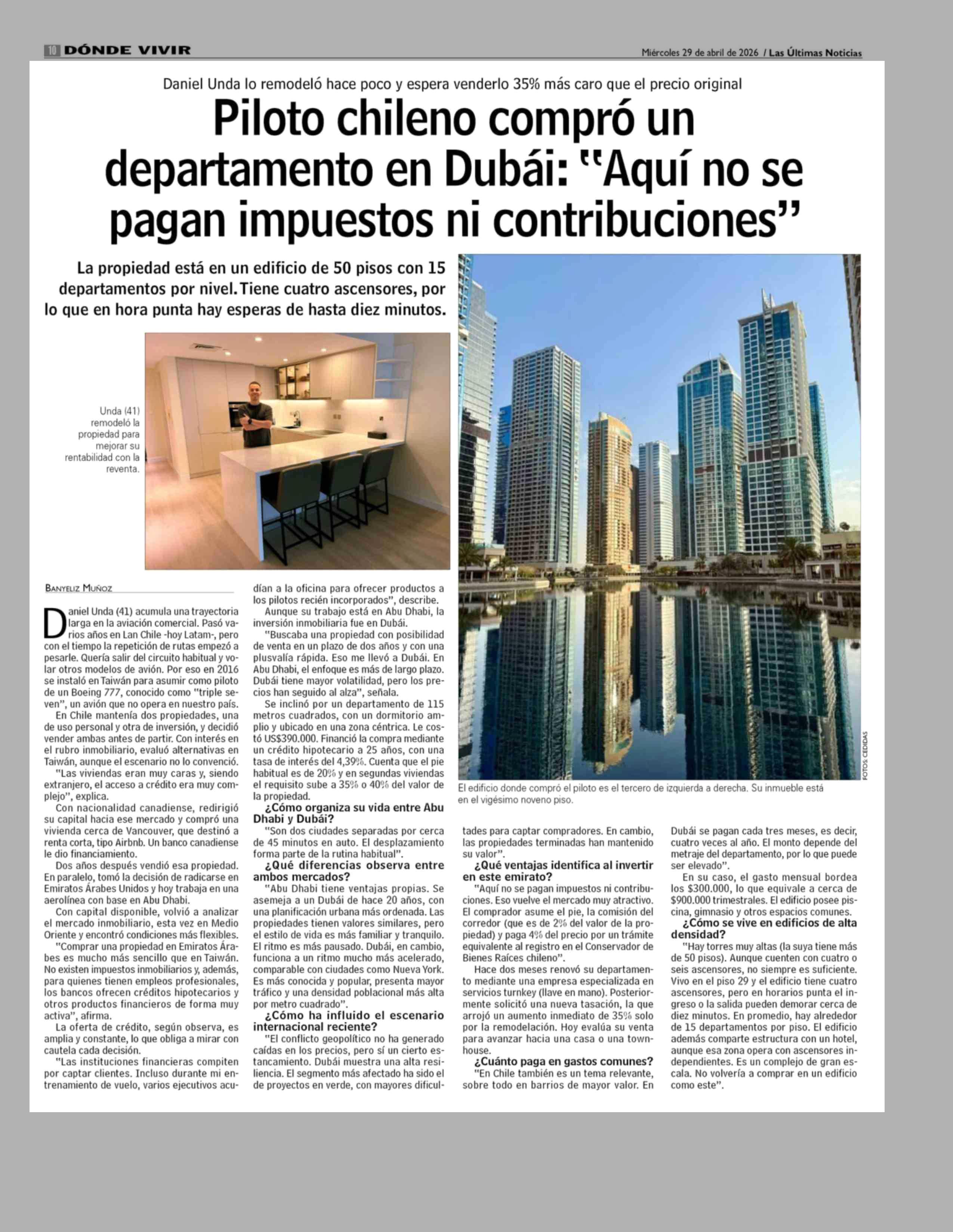Piloto chileno compró un departamento en Dubái: "Aquí no se pagan impuestos ni contribuciones" 29-04-2026 Las Últimas Noticias |