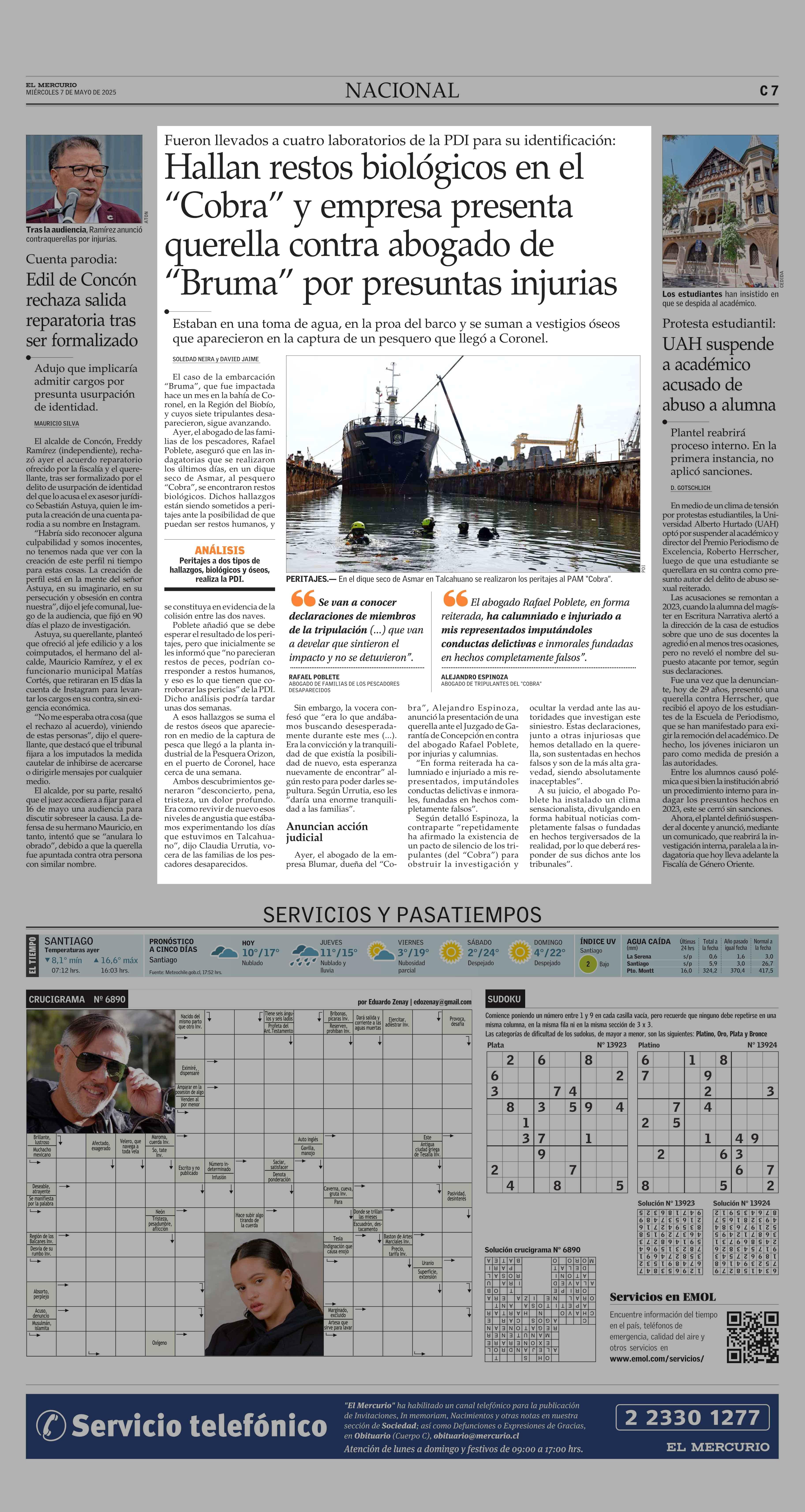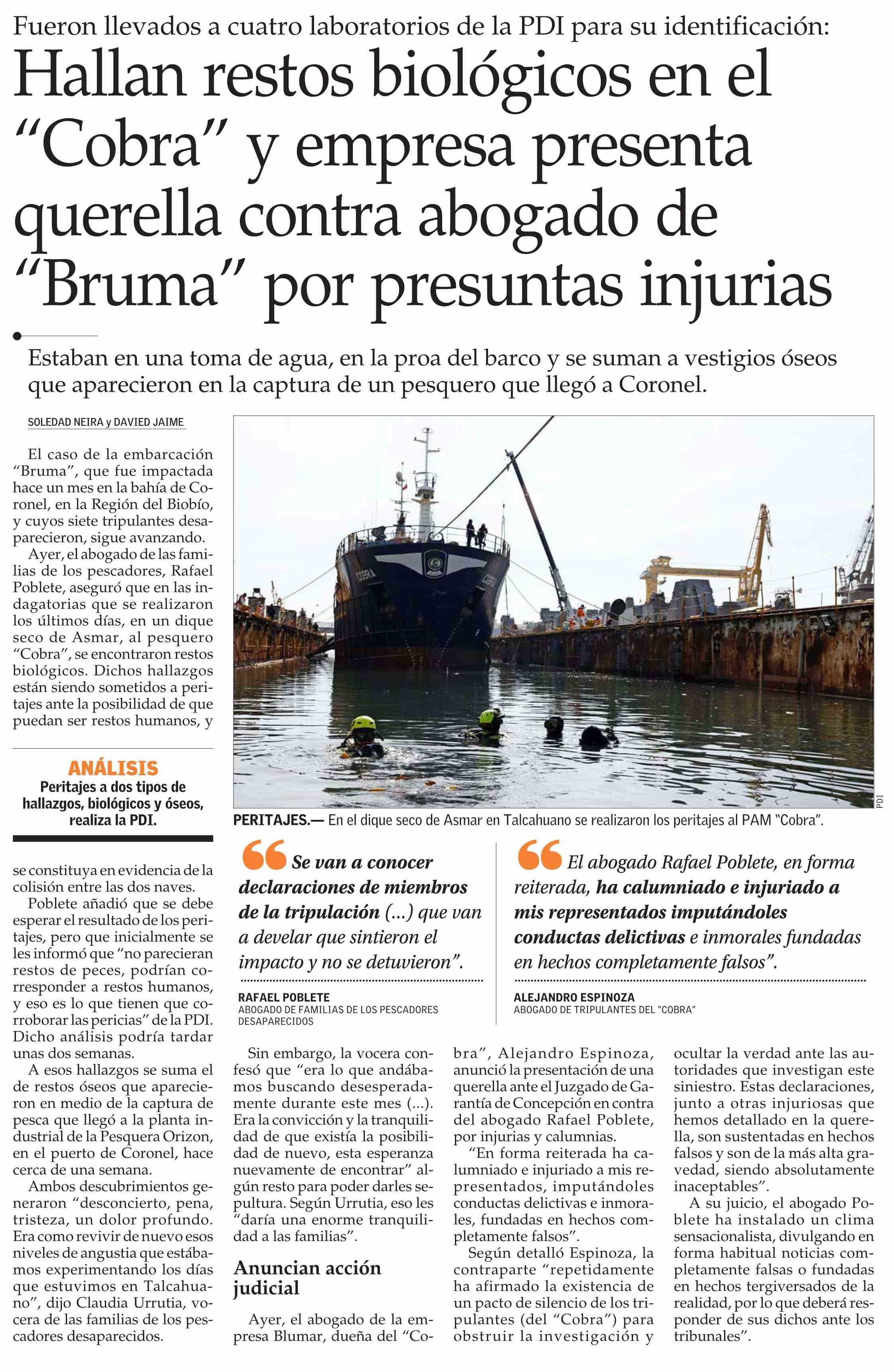 Hallan restos biológicos en el “Cobra” y empresa presenta querella contra abogado de “Bruma” por presuntas injurias 07-05-2025 El Mercurio |