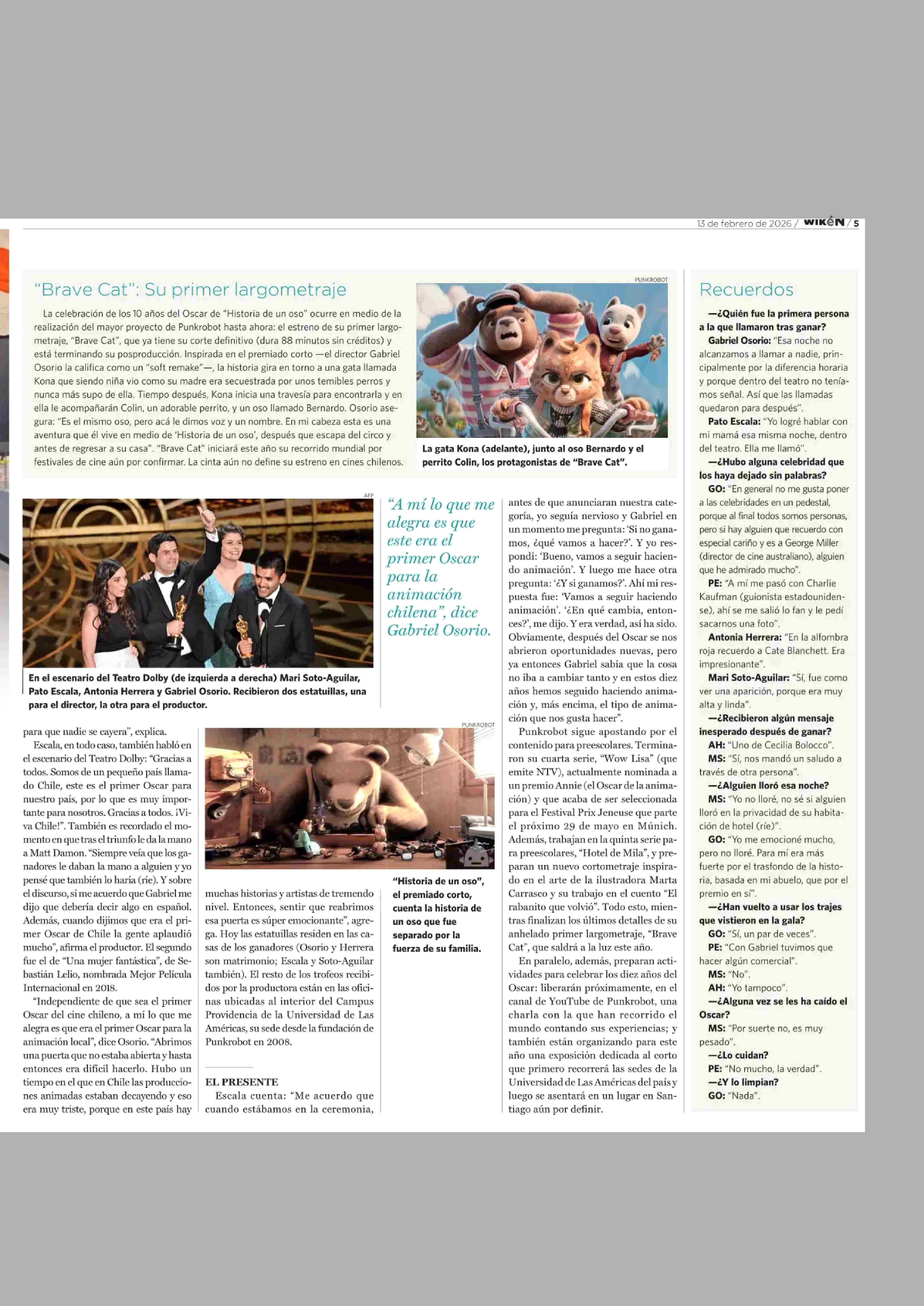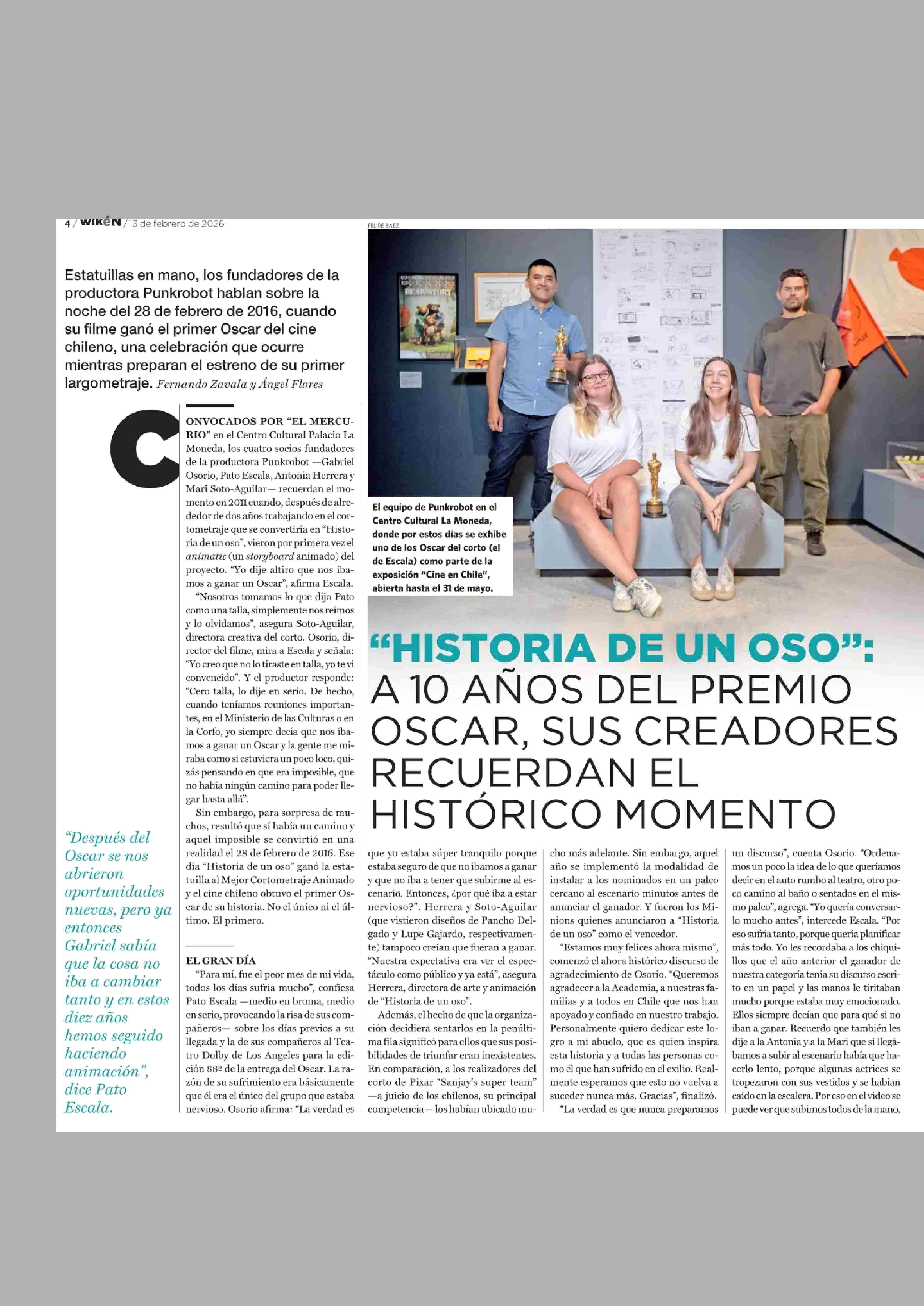 UN OSO”: “HISTORIA DE A10 AÑOS DEL PREMIO OSCAR, SUS CREADORES RECUERDAN EL HISTORICO MOMENTO 13-02-2026 El Mercurio |