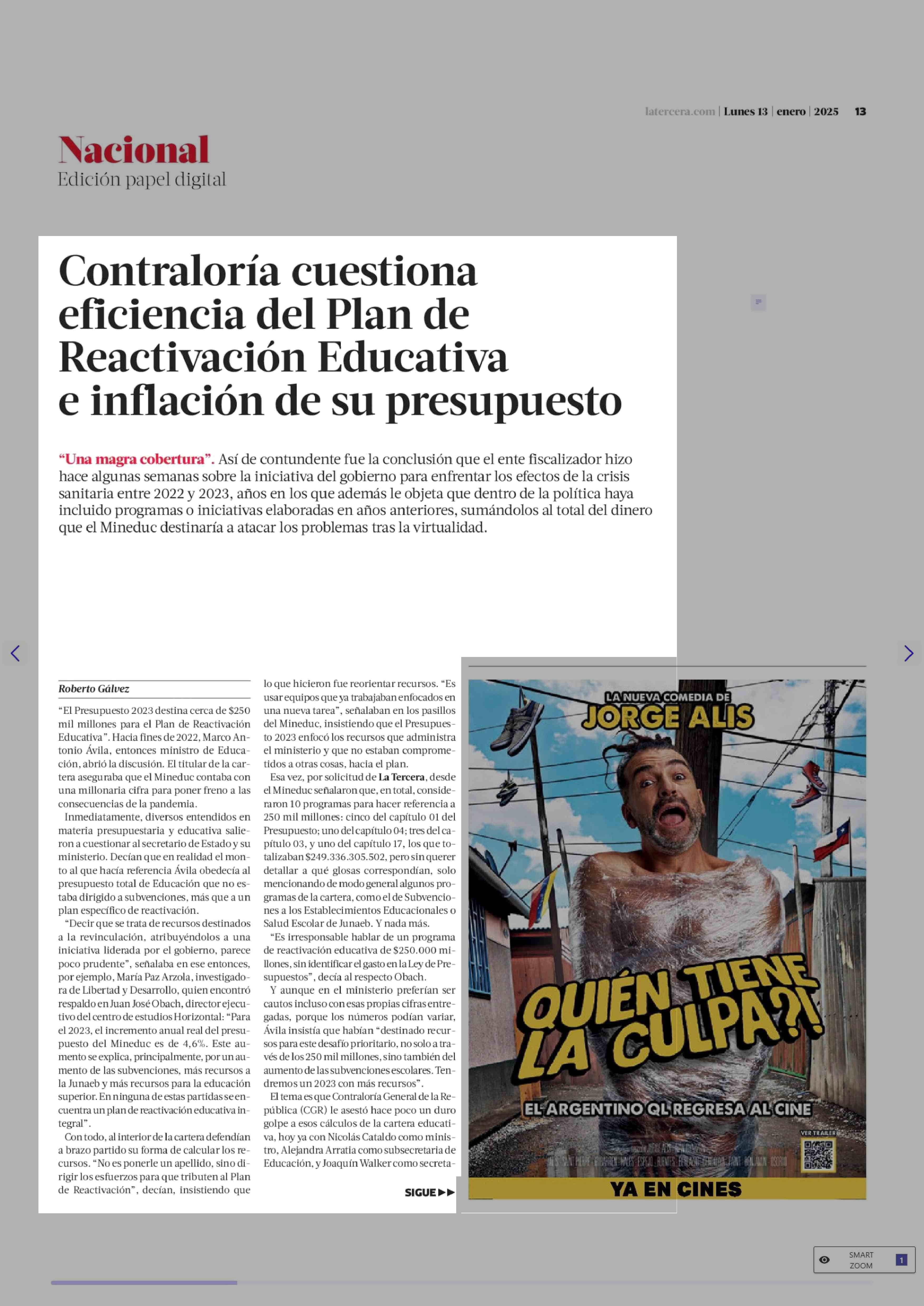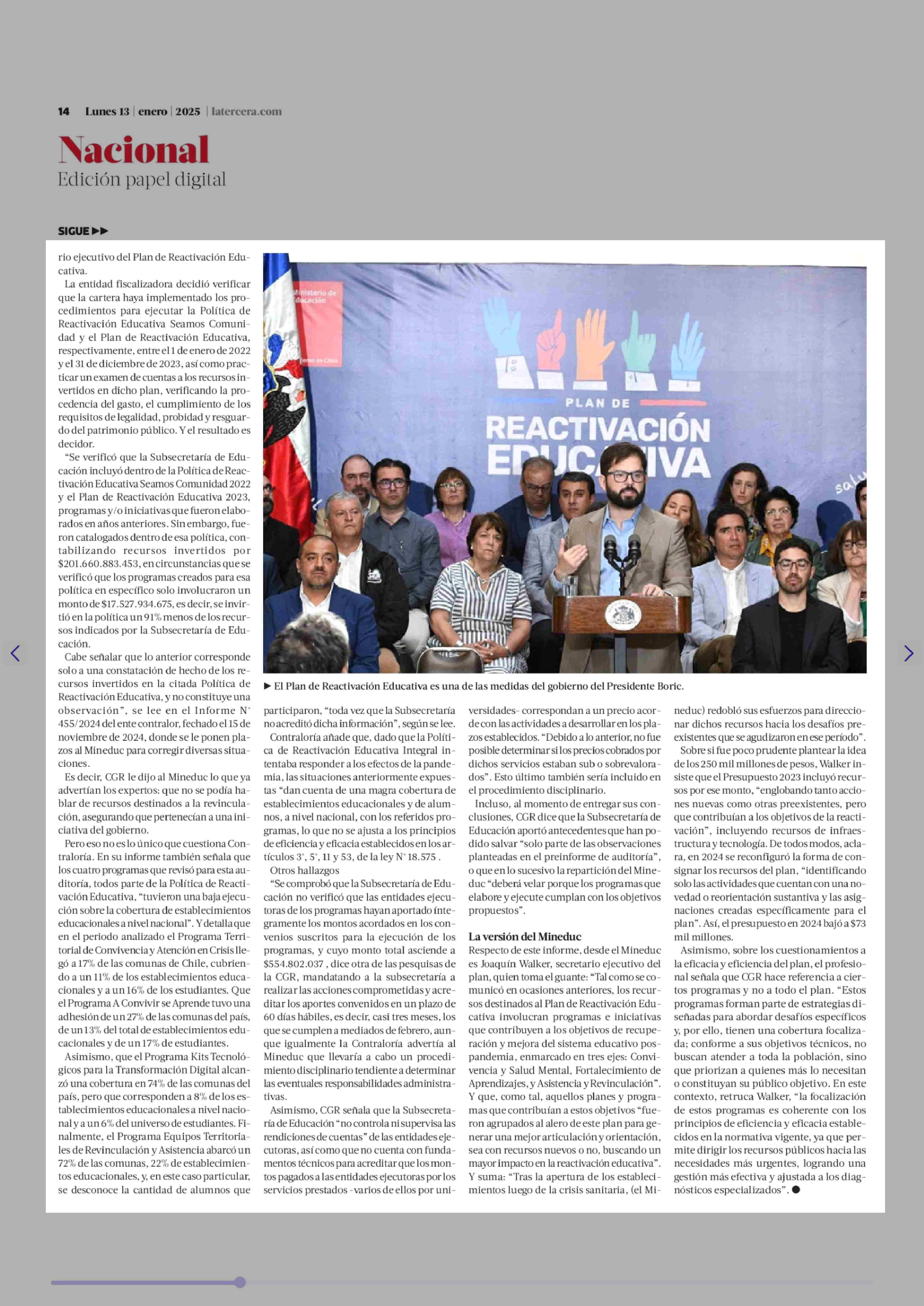 Contraloría cuestiona eficiencia del Plan de Reactivación Educativa e inflación de su presupuesto 13-01-2025 La Tercera |