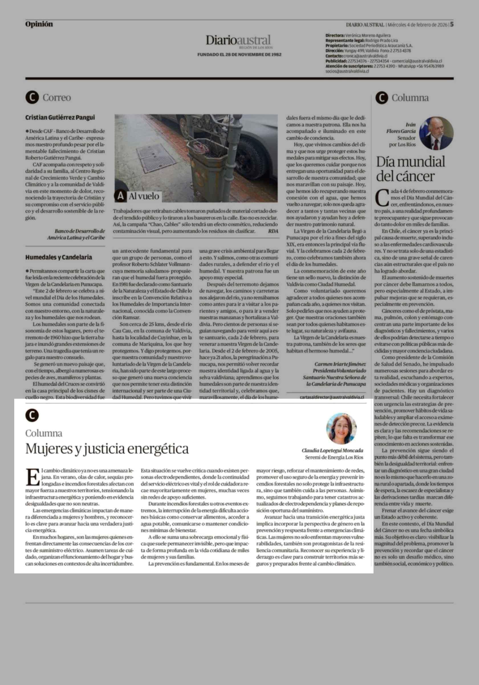 Columnas de Opinión: Mujeres y justicia energética 04-02-2026 Diario Austral Región de Los Ríos |